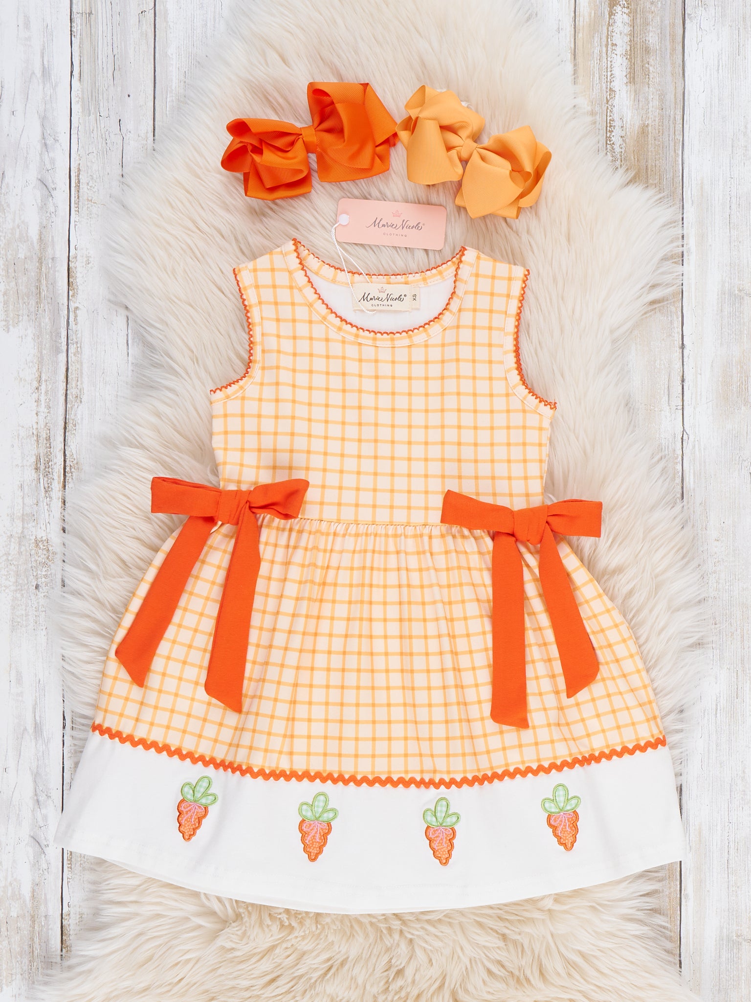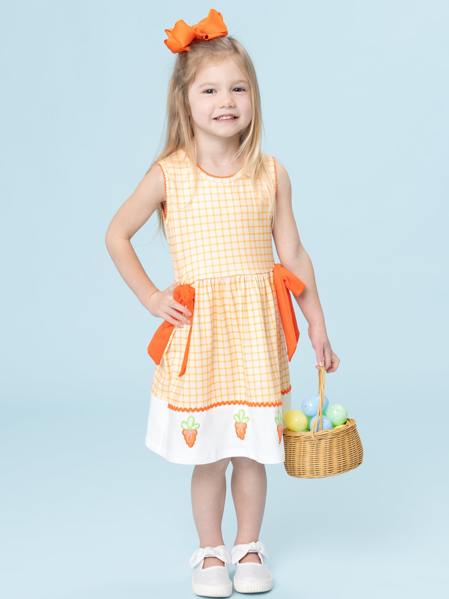 The Sweet Carrot Kisses Embroidered Plaid Dress by Marie Nicole Clothing features a checked bodice with oversized side bows and a contrasting hemline adorned with a row of cheerful carrot embroidery. The sleeveless, twirl-ready silhouette keeps little ones cool and comfy for spring celebrations. Crafted from soft, breathable fabric, this dress is perfect for egg hunts, garden parties, and picture-ready Easter moments.
