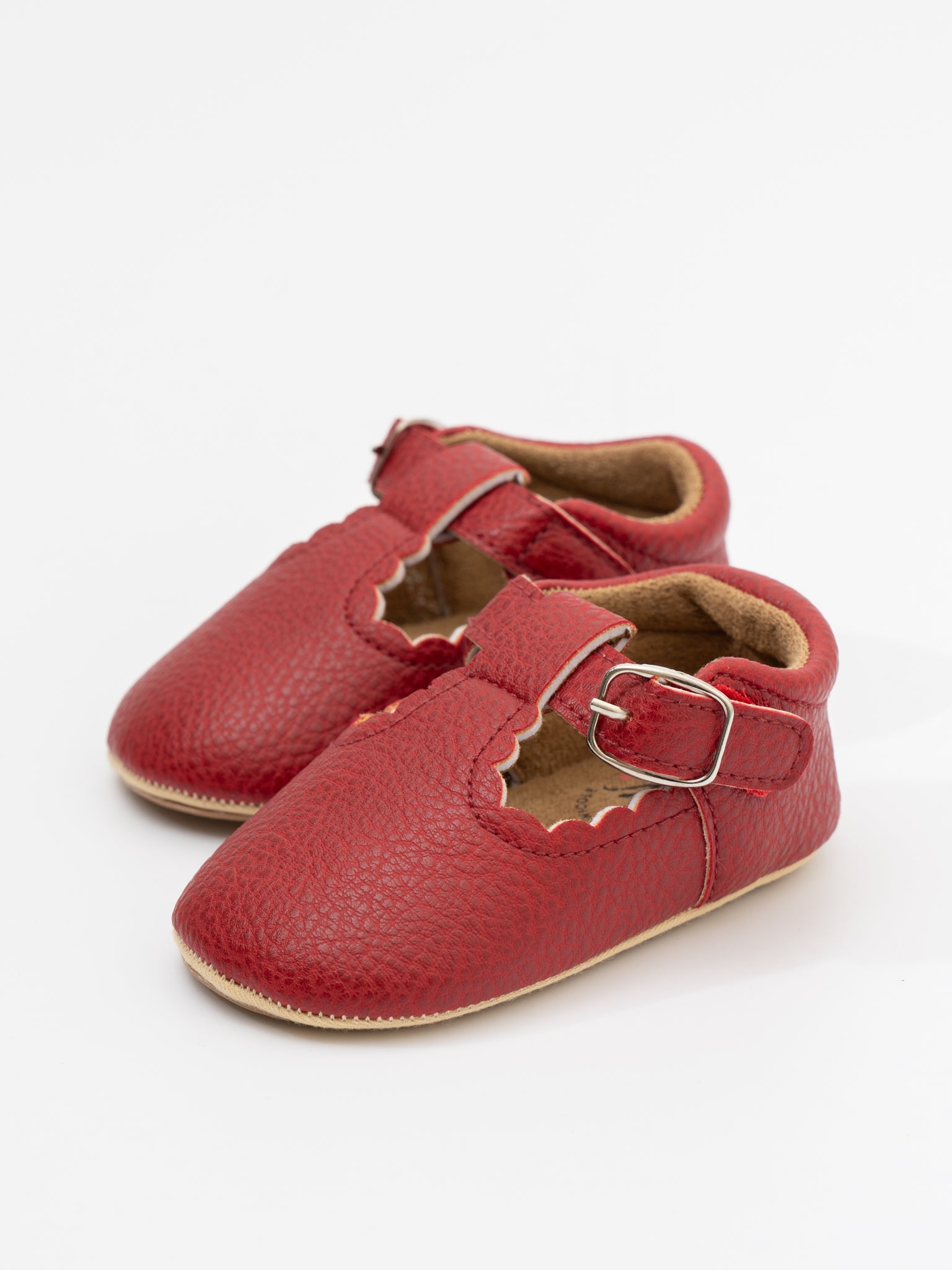 T-Strap Scalloped Buckle Shoes - Wine Red
