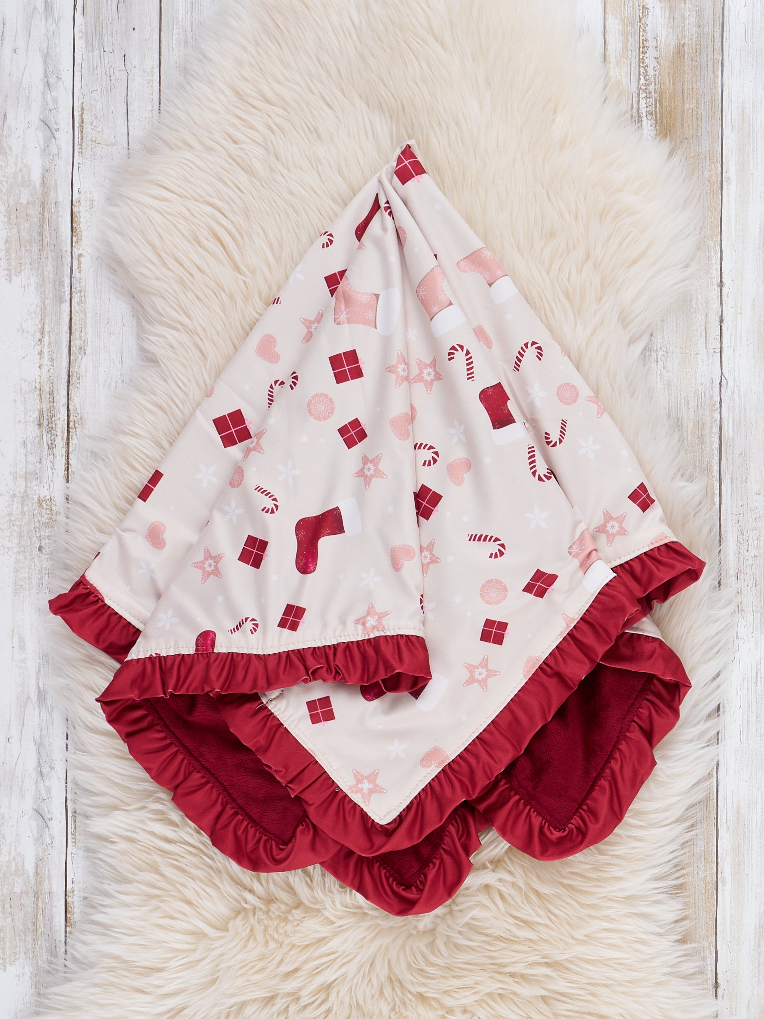 The Merry Magic Ruffle Blanket by Marie Nicole features a soft fabric adorned with a cheerful pattern of stockings, gifts, and festive icons, finished with a playful ruffle trim along the edges. Snuggly and decorative, this blanket is perfect for keeping cozy during the holiday season