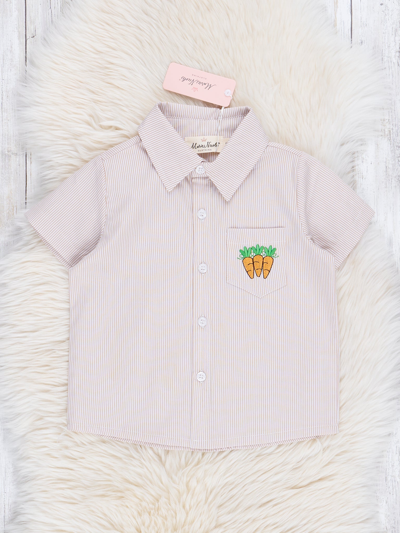 Hop into spring with this playful brother set! Featuring embroidered carrots on the pocket, this tan striped button up shirt is perfect for Easter festivities. It's a must-have for any little one looking to add a touch of whimsy to their wardrobe.