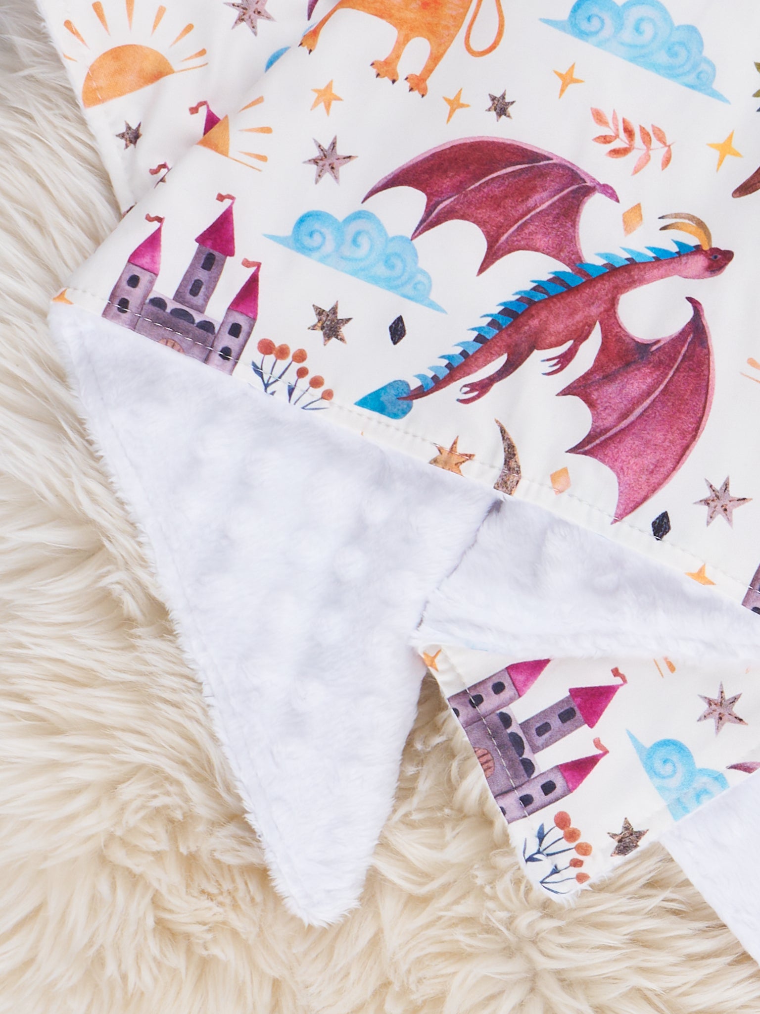 The Adventurer's Tale Blanket by Marie Nicole Clothing features a magical print of dragons, castles, and enchanting landscapes, crafted from ultra-soft minky fabric. This cozy blanket is perfect for sparking imaginations and keeping little adventurers warm and comfortable at home or on the go.