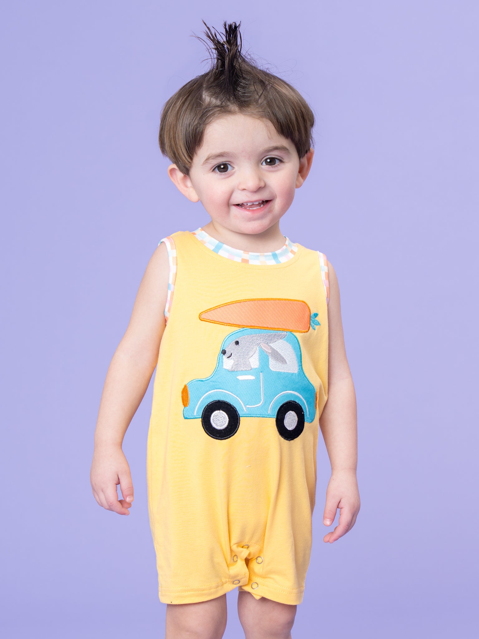 Bunny Carrot Joyride Embroidered Johnny by Marie Nicole Clothing features a sleeveless jonjon with an applique of a bunny driving a truck delivering a carrot. With its soft knit fabric, lively spring-themed embroidery, and easy snap closures, this romper is a cheerful and practical choice for spring outings and Easter celebrations.