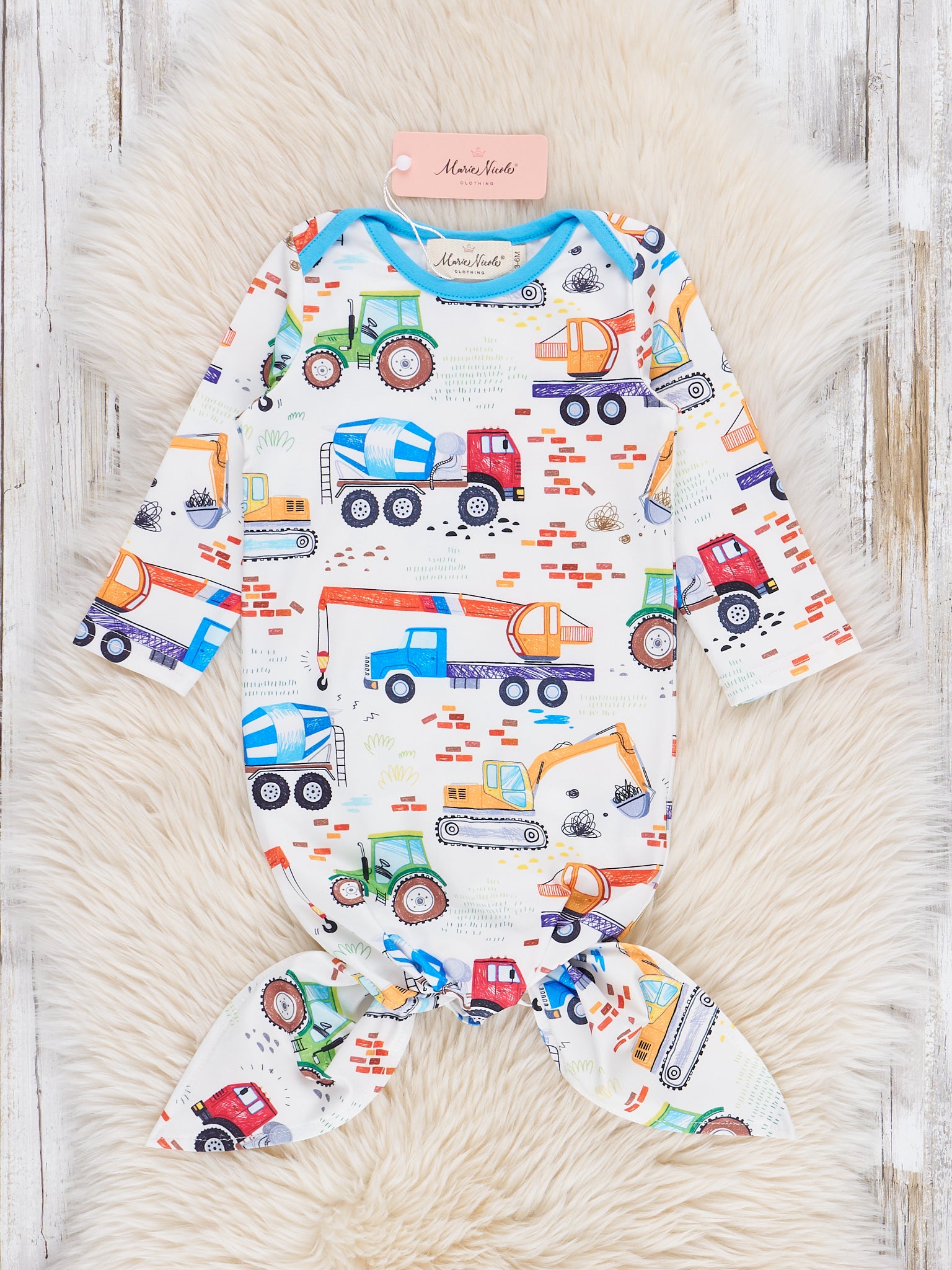 The Construction Cuddles Knot Gown is a fun and cozy choice that’s perfect for little builders and sleepy snuggles. Featuring playful construction vehicle prints and a soft, stretchy fabric, this gown from Marie Nicole Clothing blends rugged charm with everyday comfort. Designed with a knotted bottom for easy diaper changes, it’s ideal for nap time, bedtime, and picture-perfect first moments.