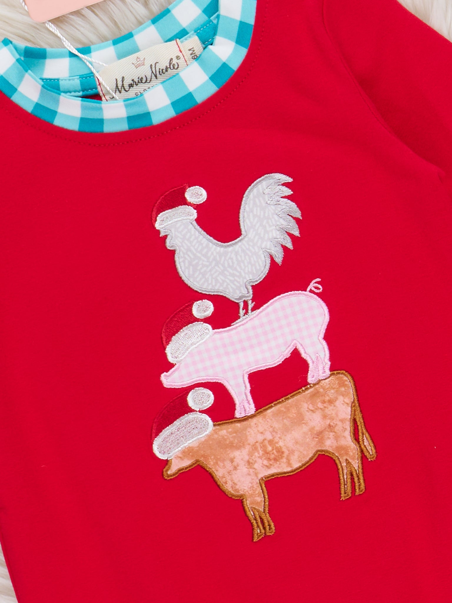 The Farmyard Friends Embroidered Romper by Marie Nicole Clothing features a playful stacked farm animal appliqué on the chest, with contrasting gingham trim at the neck and cuffs for a classic touch. This cozy, long-sleeve romper is perfect for little ones who love country style—making it ideal for playdates, farm visits, and everyday comfort.