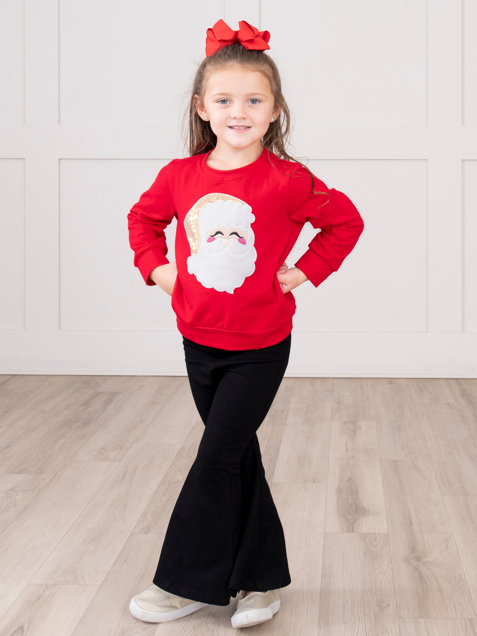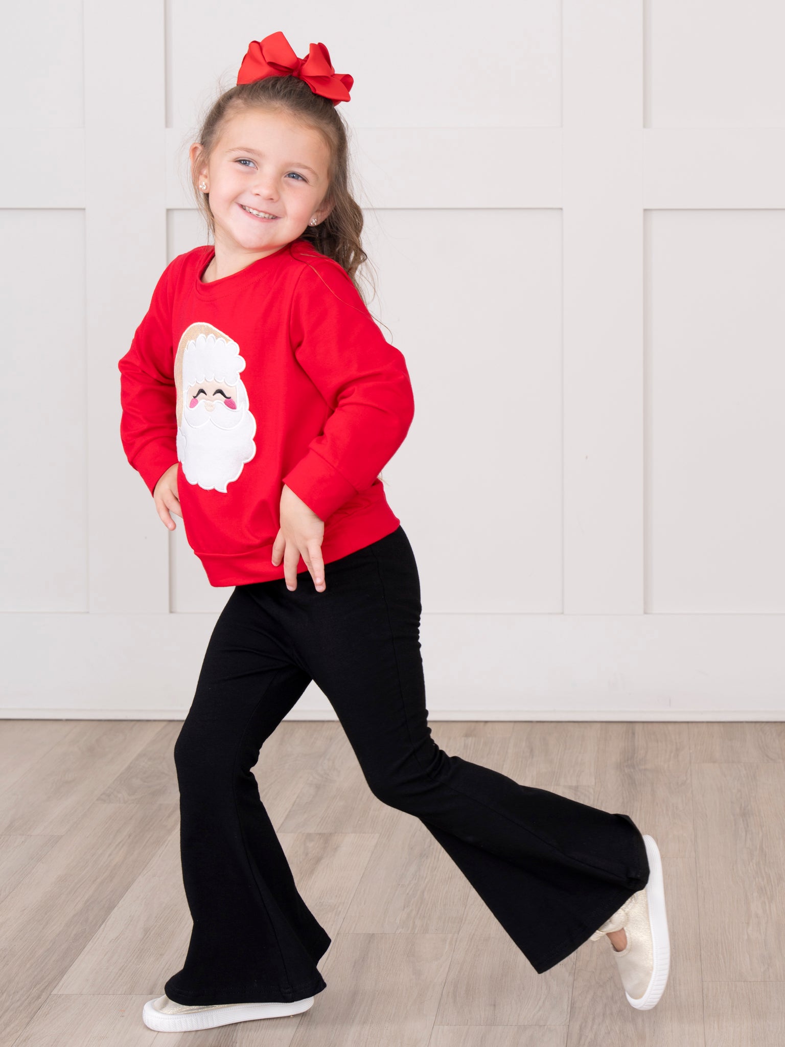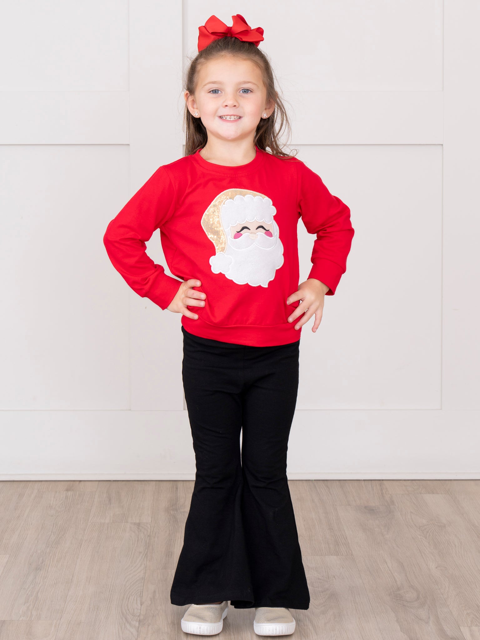 Ho ho ho! The Santa's Joy Embroidered Bell Bottom Outfit is a Christmas two-piece set with a sweatshirt top and black bell bottom pants, great for home or casual outside wear during the winter holidays. This Marie Nicole Clothing outfit highlights Santa's smile, even if it's hidden in his beard. Made with soft, stretchy fabric, your little girl will love playing or chilling in this fit!