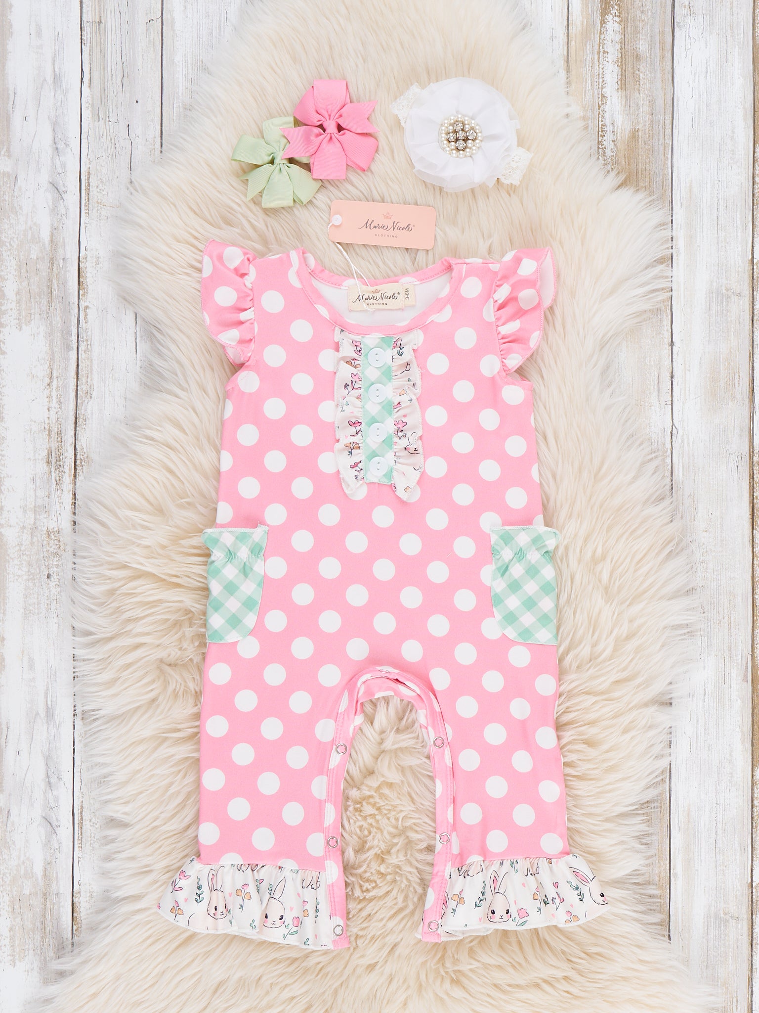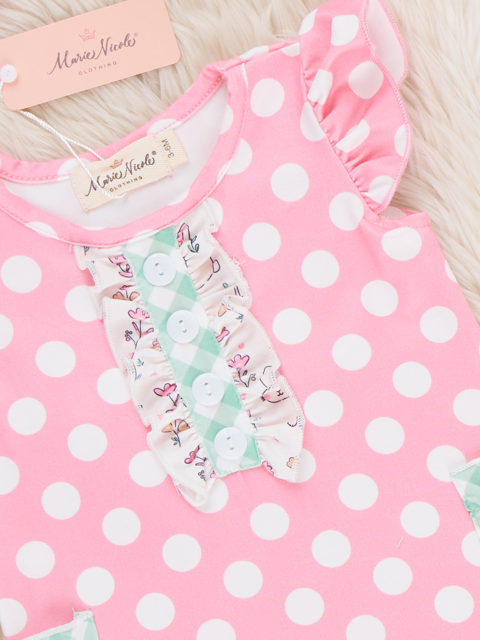 The Bunny Hop Polka Dots Ruffle Romper by Marie Nicole Clothing features flutter sleeves, playful polka dots, and a contrast ruffle placket for extra sweetness. Patch pockets and ruffled leg hems add charming detail while keeping the look fun and practical. Soft, stretchy knit and convenient snaps make this romper perfect for all-day play, spring outings, and picture-ready bunny adventures.