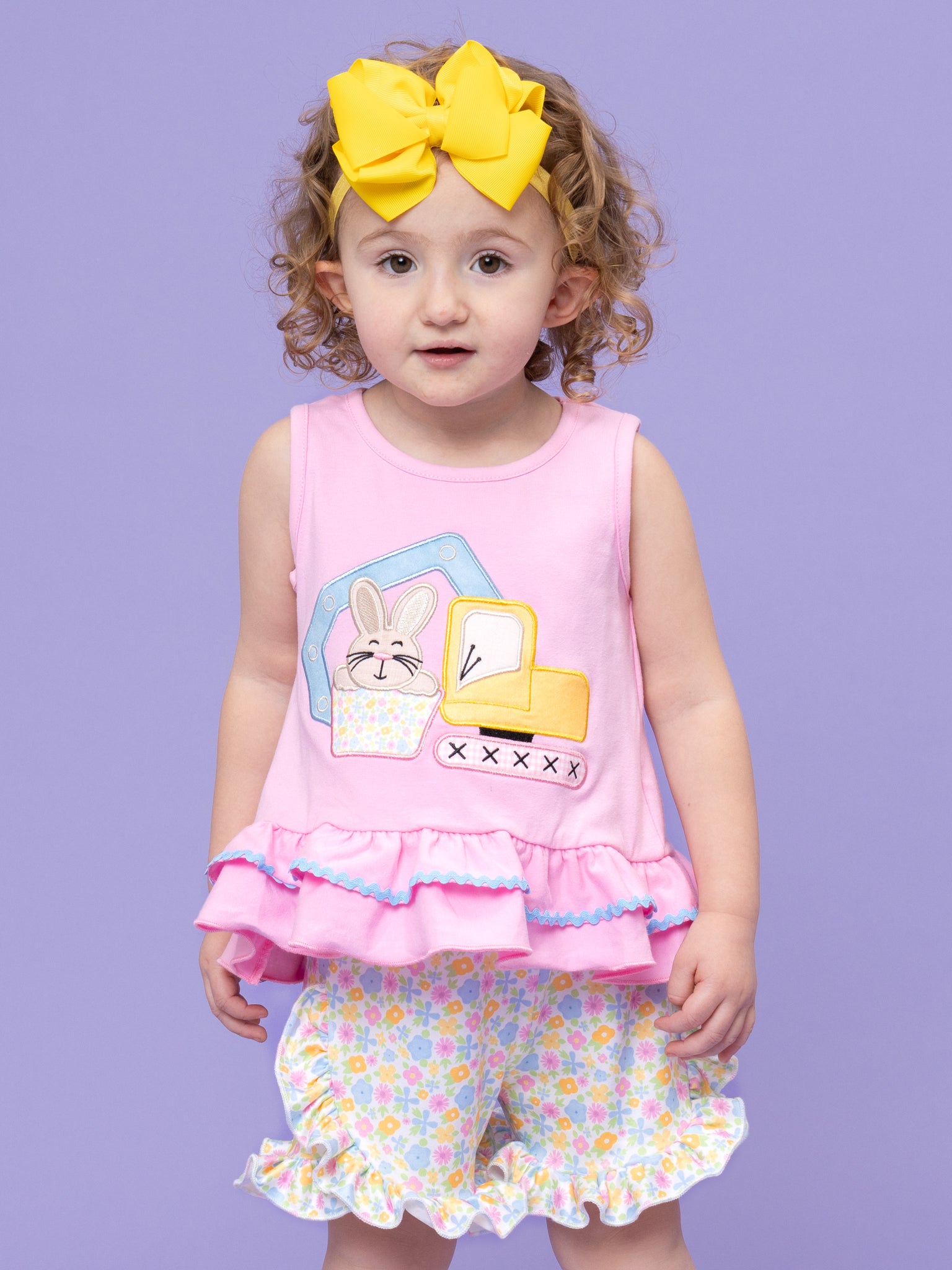 The Bunny Loader Embroidered Ruffle Outfit by Marie Nicole Clothing delights with its embroidered bunny loader graphic on the cotton tank top and matching floral shorts set for playful charm. Ruffle hems add bouncy movement for active adventures, while soft stretchy fabric ensures all-day comfort during play. Perfect for family gatherings, photos, or festive moments full of boutique whimsy and joyful energy.