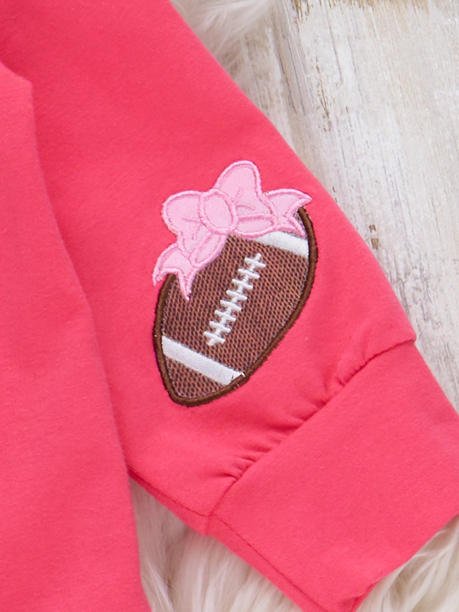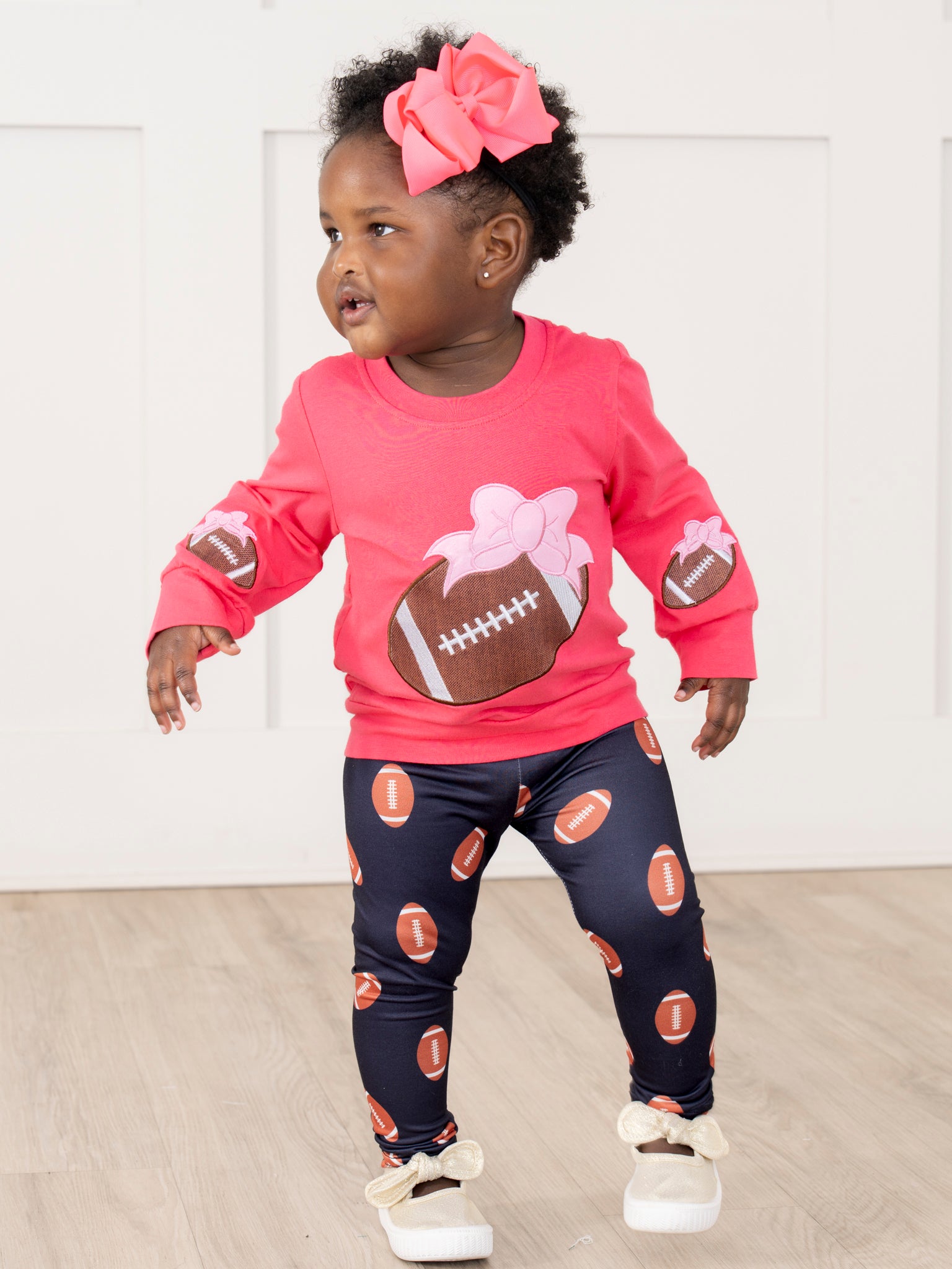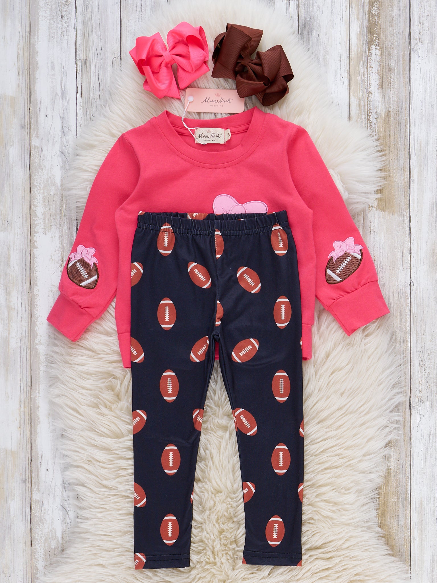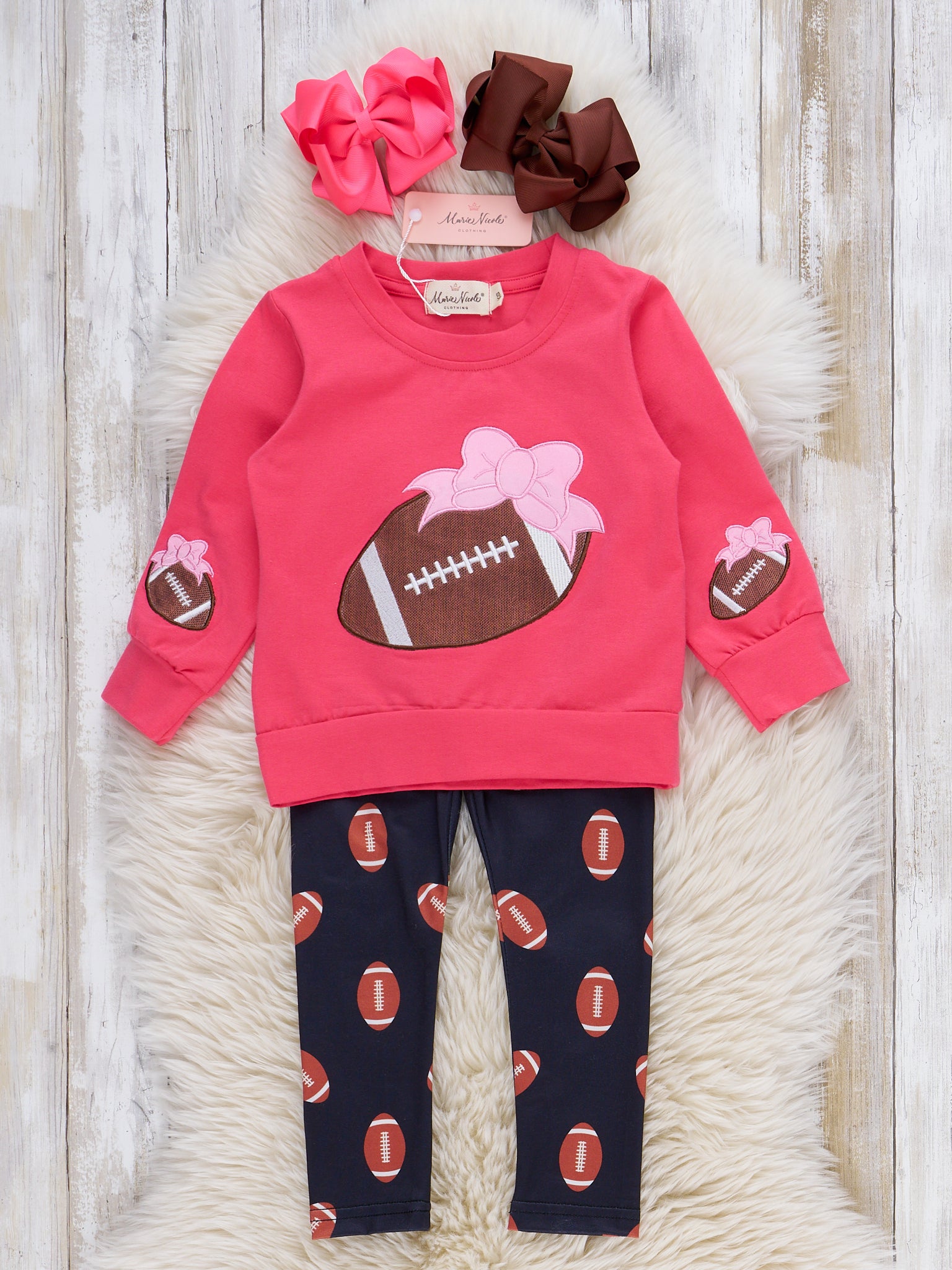 This outfit is a total Touchdown! 🏉 The Hot Pink Touchdown Embroidered Outfit by Marie Nicole Clothing features a long-sleeved hot pink top with embroidered footballs on the chest & sleeves and is paired with football-printed black leggings. Your girls will score big this kicking outfit!