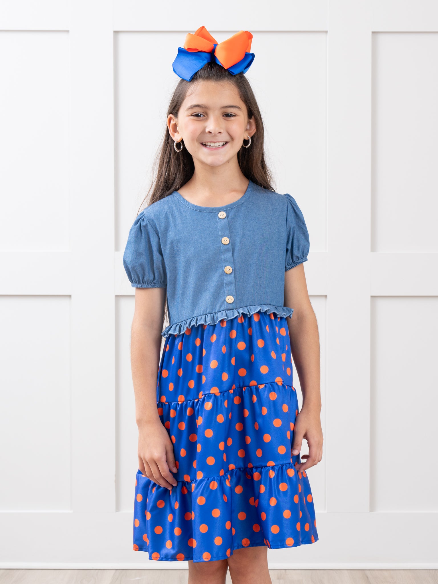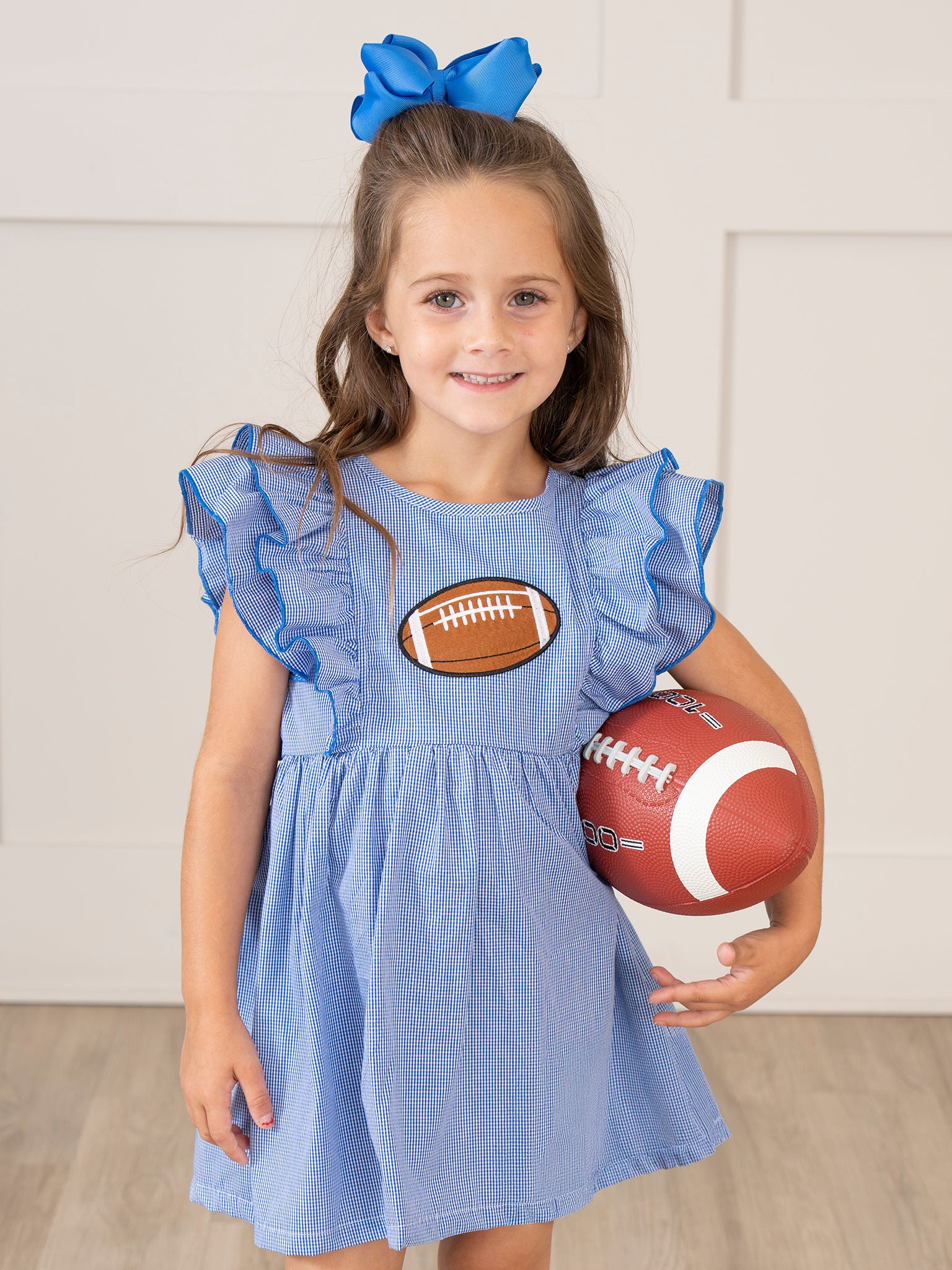 Blue Stripe Cotton Embroidered Football Ruffle Dress