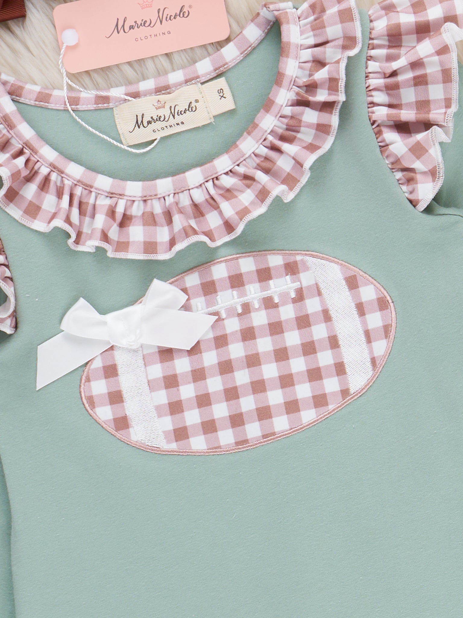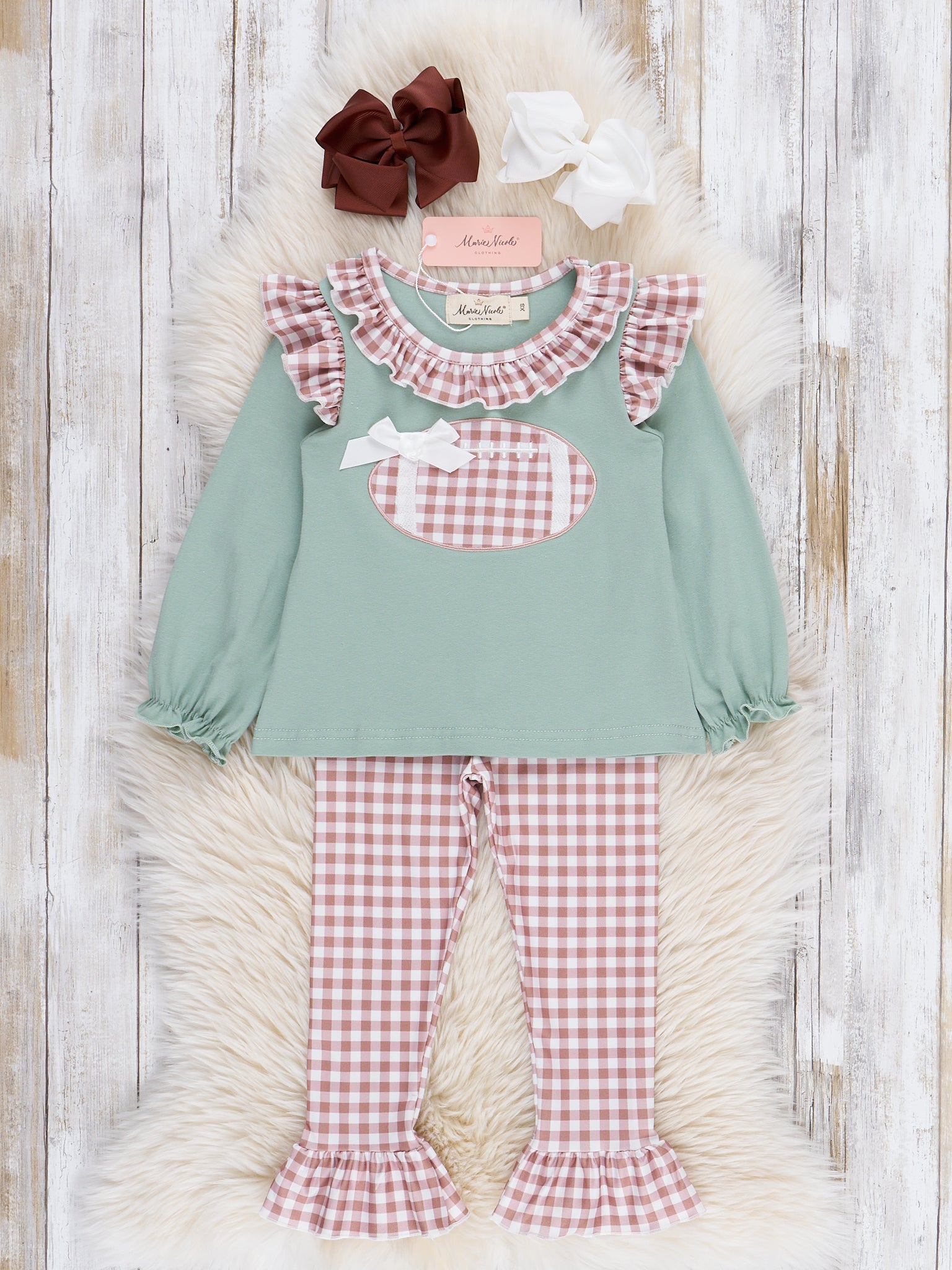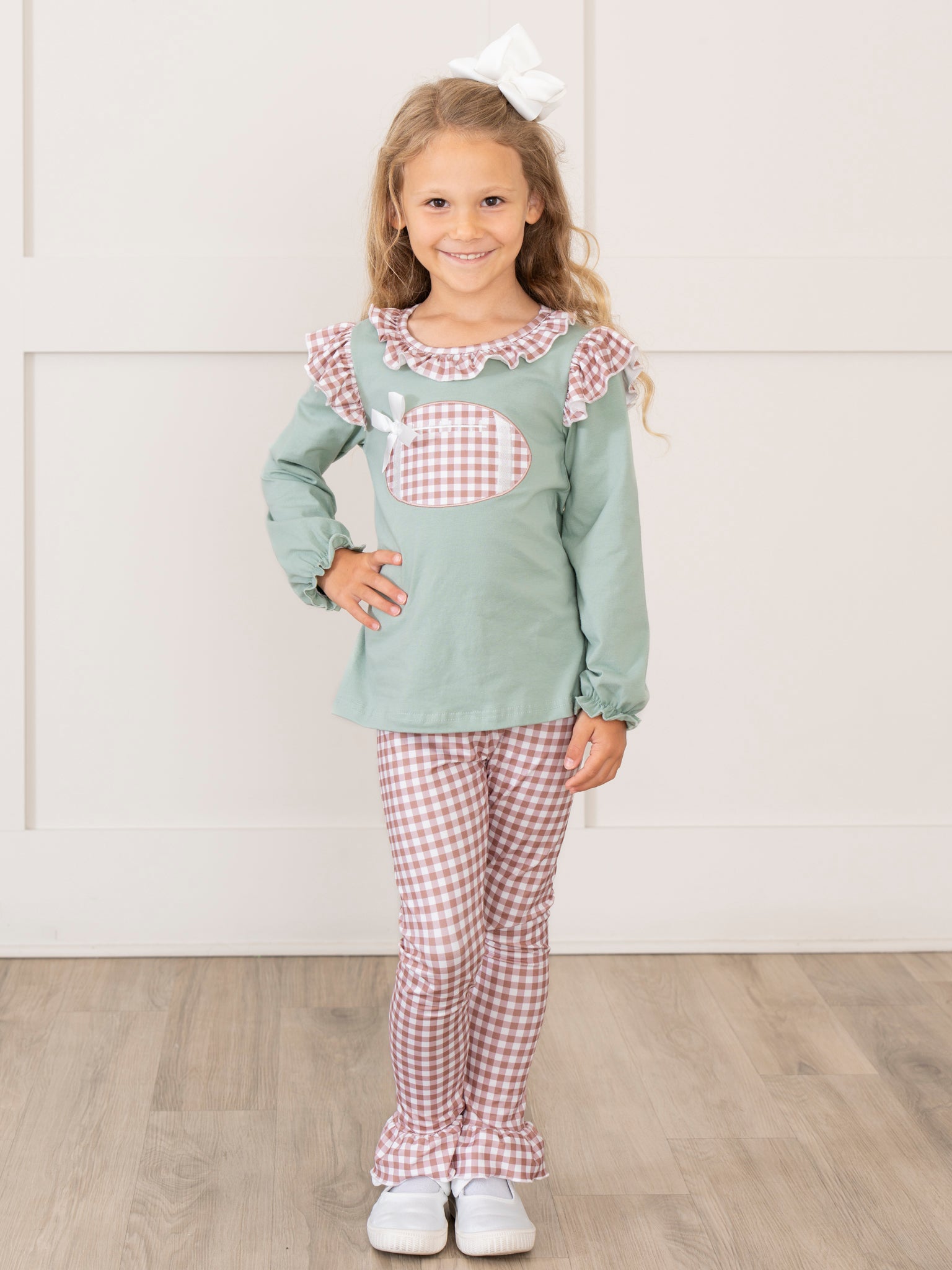 The First Down Embroidered Gingham Football Ruffle Outfit gets your girl ready for gameday! This two-piece set from Marie Nicole Clothing highlights an embroidered football topped with a sweet, little bow. The pristine plaid ruffles and long, cinched sleeves, all made from soft, comfortable fabric, make this outfit perfect for any fall day.