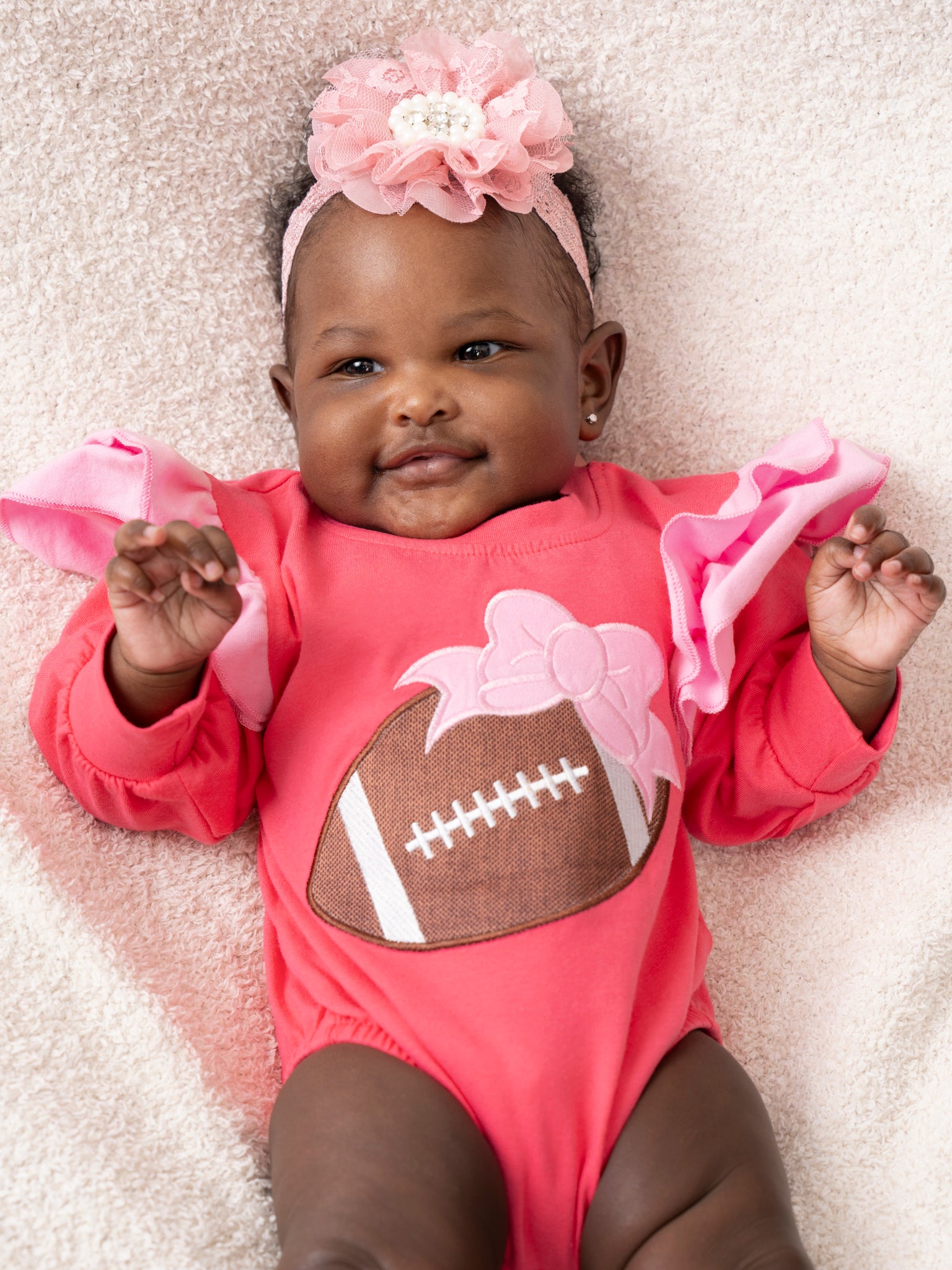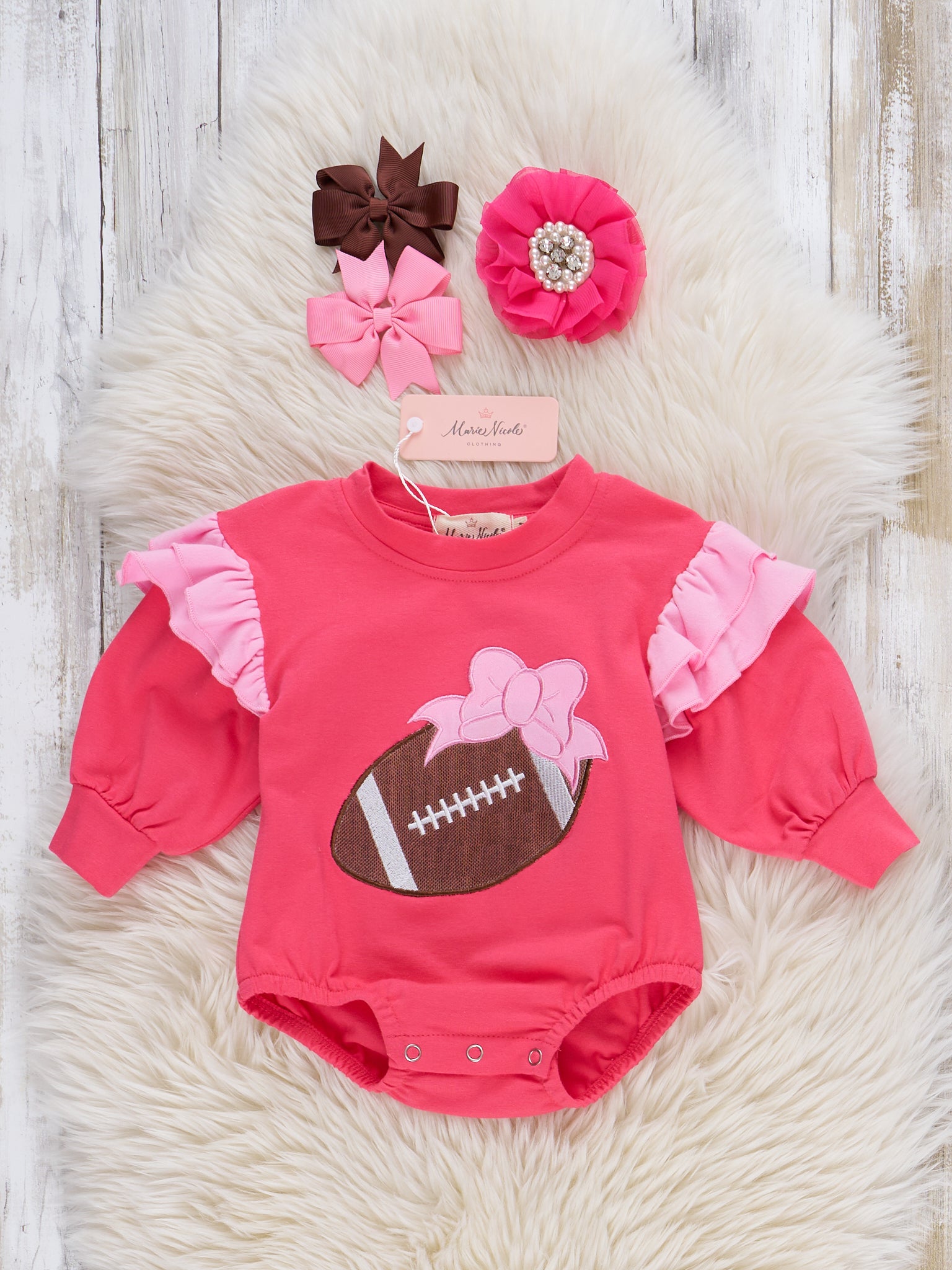 This piece is a total Touchdown! đ Made for the girl who loves both fashion and football, the Hot Pink Touchdown Embroidered Ruffle Bubble by Marie Nicole Clothing features a unique ruffle shoulder detail and a bold embroidered football design. Show off your love for the game while looking cute and trendy.
