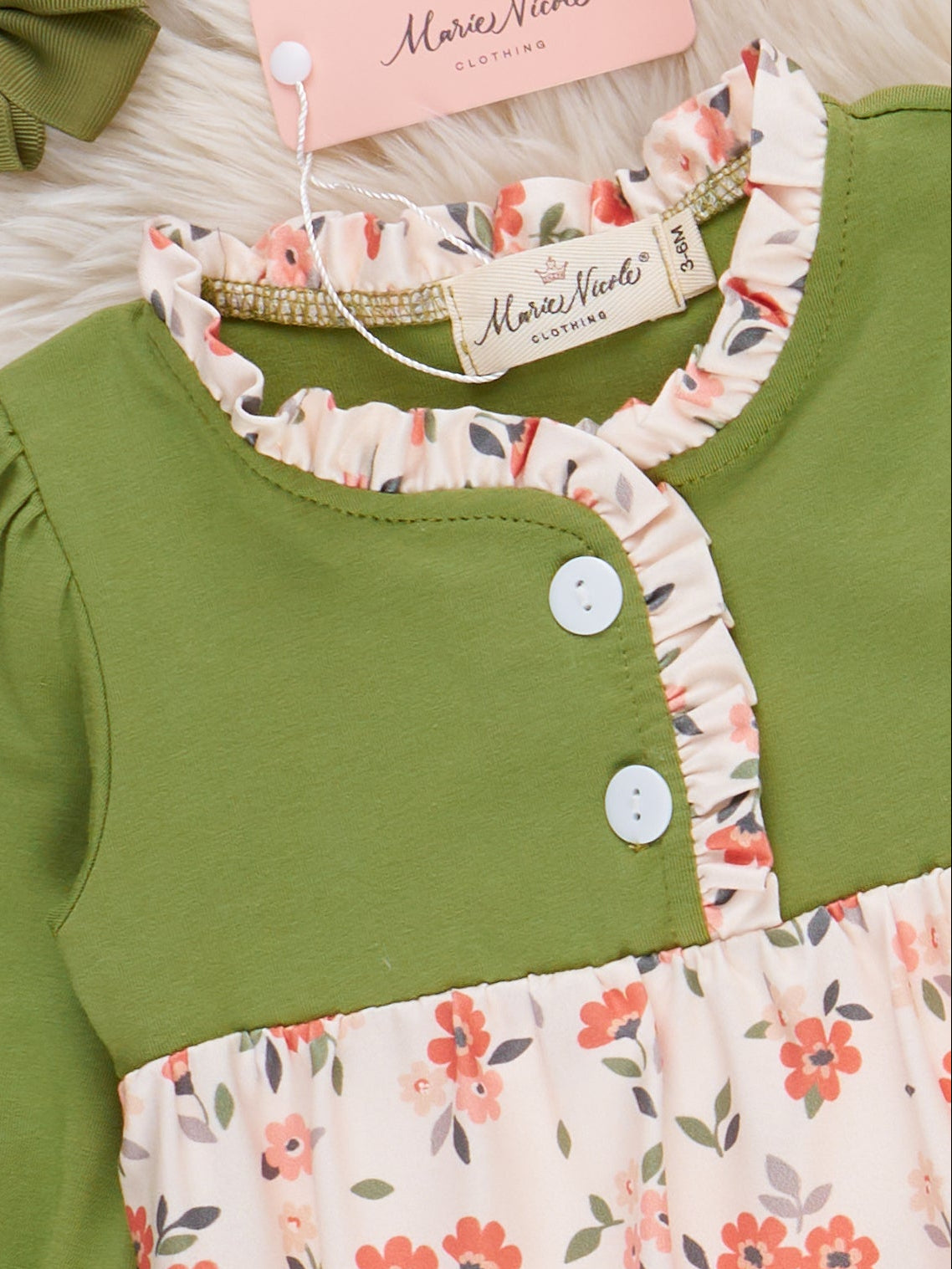 The Forest Petals Floral Knotted Gown by Marie Nicole Clothing features a cozy gathered bottom, whimsical floral print, and dainty ruffle trim on the collar. Designed with soft, stretchy fabric, this sleeper gown blends forest-inspired charm with gentle comfort for restful nights and sweet dreams.
