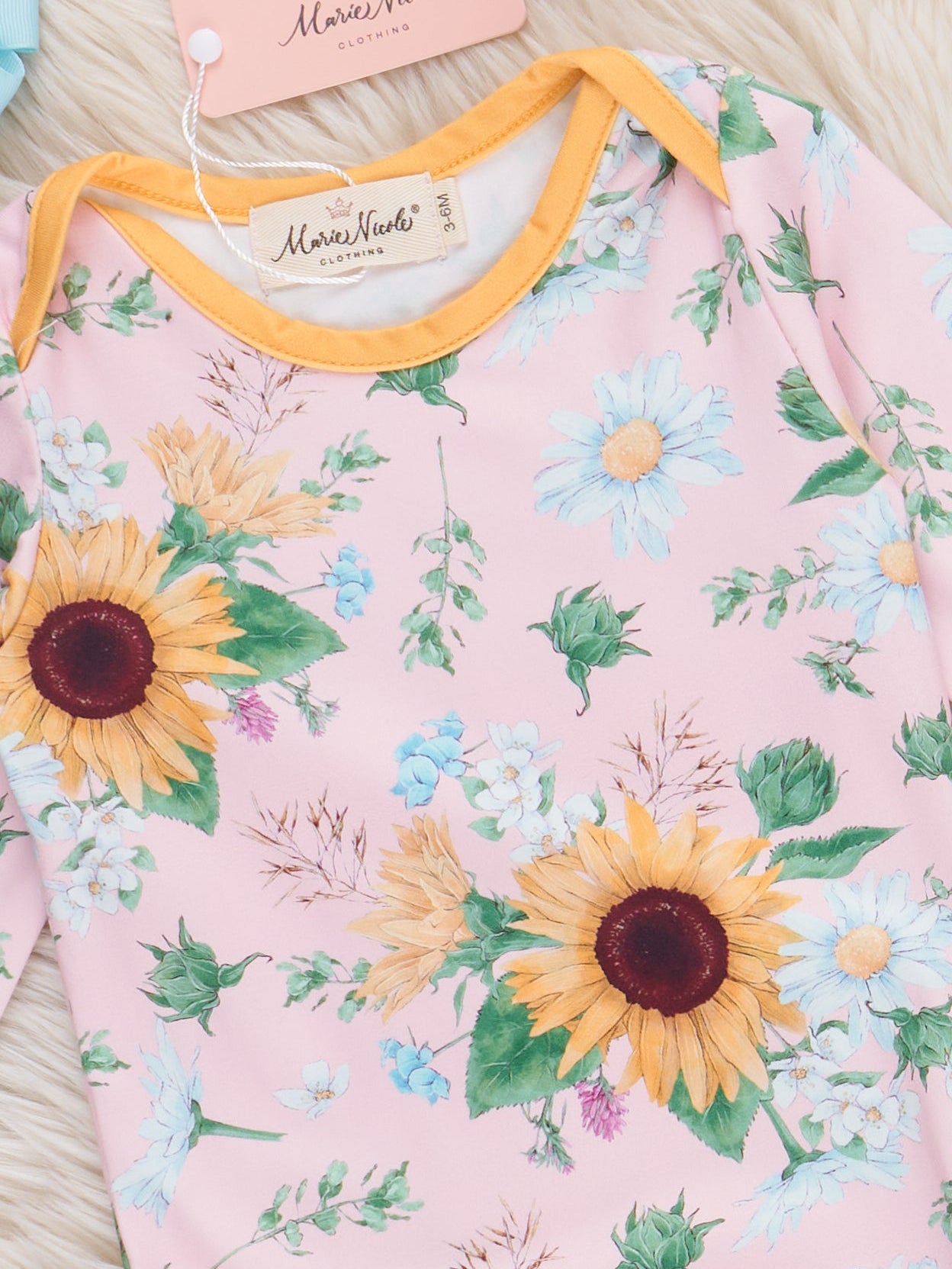 The Sunflower Dream Knotted Gown by Marie Nicole Clothing features a happy sunflower print and gentle gathered hem for cozy comfort. Made with soft, stretchy fabric, this gown keeps little ones snug during naps and nighttime, offering cheerful style and easy movement for restful sleep.