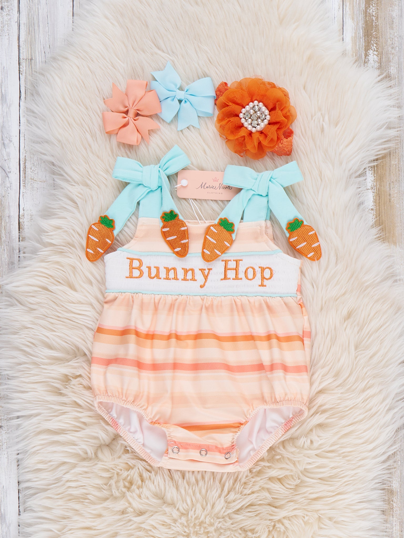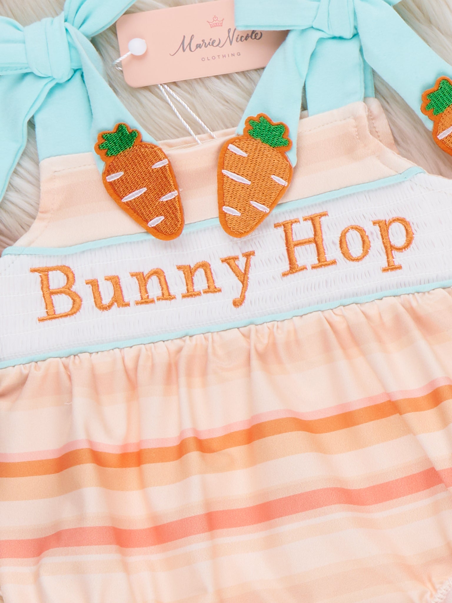 Bunny Hop Carrot Trail Smocked Bubble by Marie Nicole Clothing is a striped tie-strap bubble with a smocked “Bunny Hop” panel and playful carrot-topped bows on the shoulders. Elastic leg openings and bottom snaps keep changes easy while your little one hops through Easter photos, egg hunts, and sunny spring days.