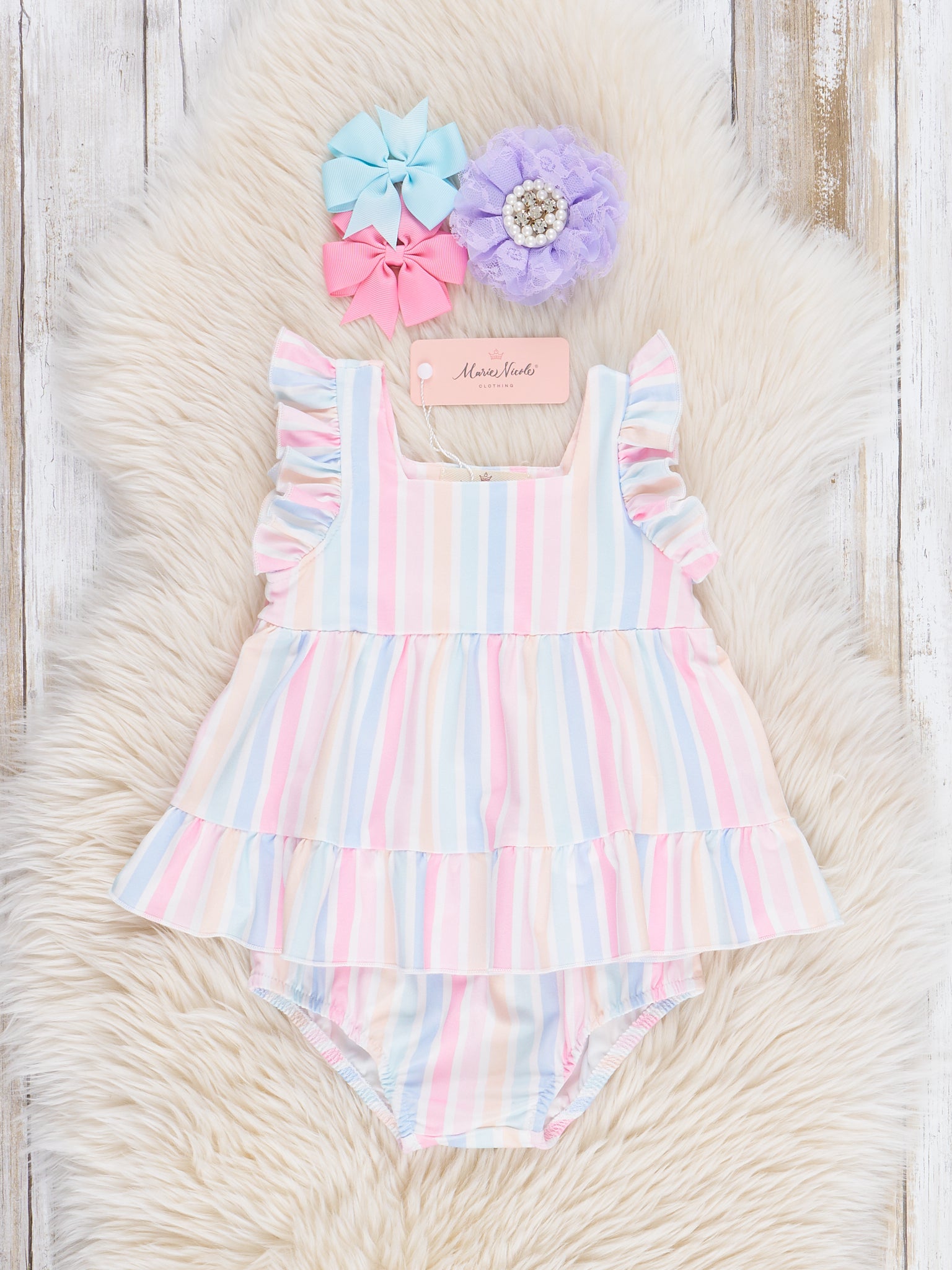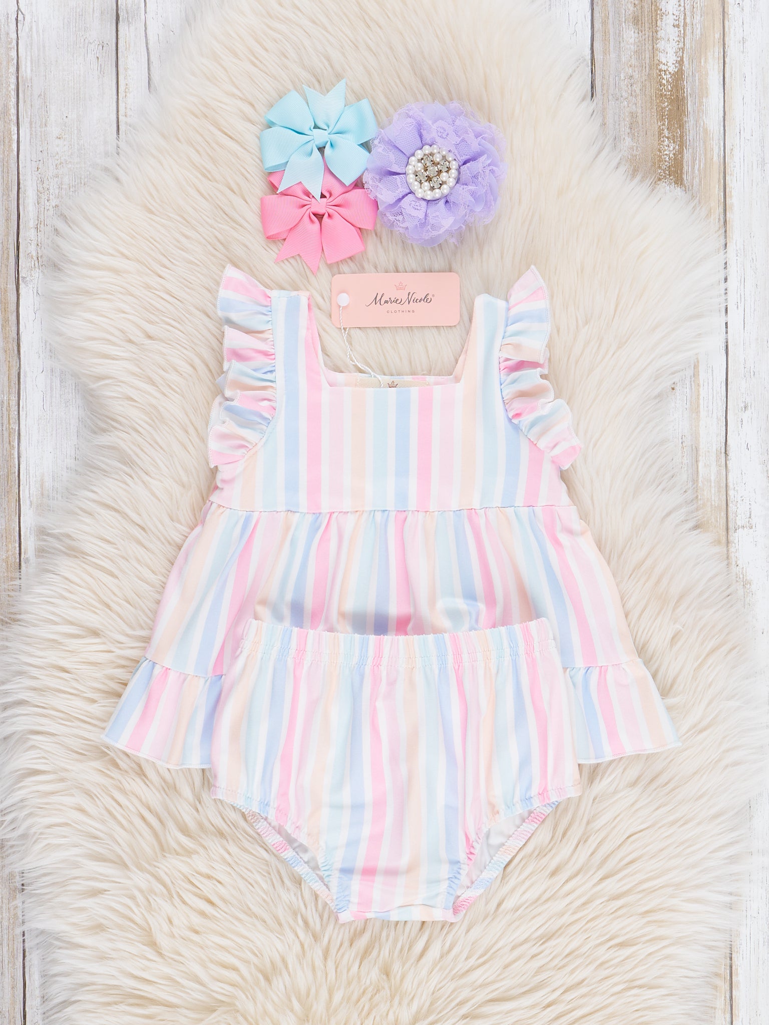 This Pastel Striped Flutter Sleeve Top & Bloomers Set by Marie Nicole Clothing is perfect for a spring picnic! This set features stripes, sweet flutter sleeves, ruffle trim, & bloomers with an elastic waistband.
