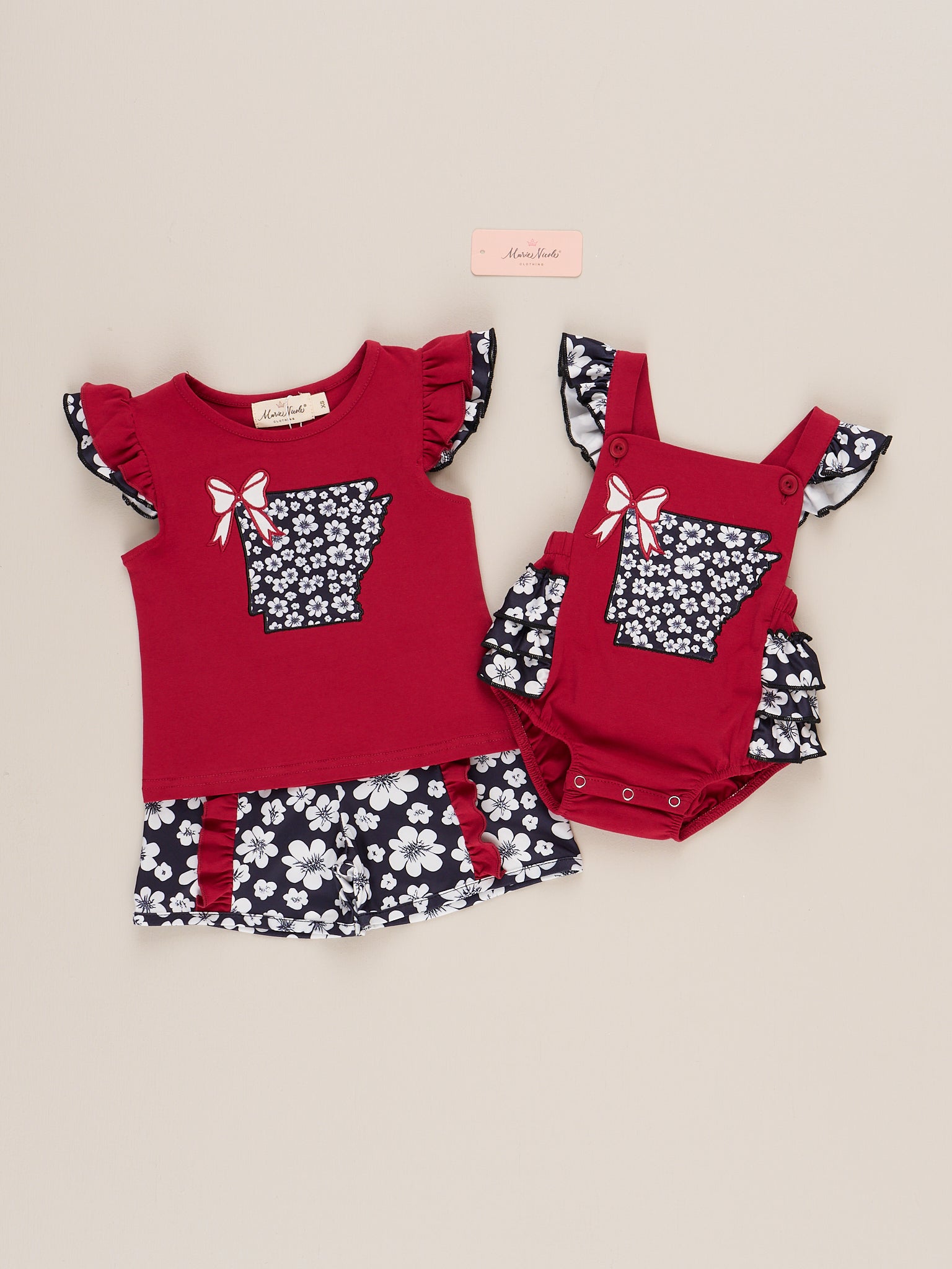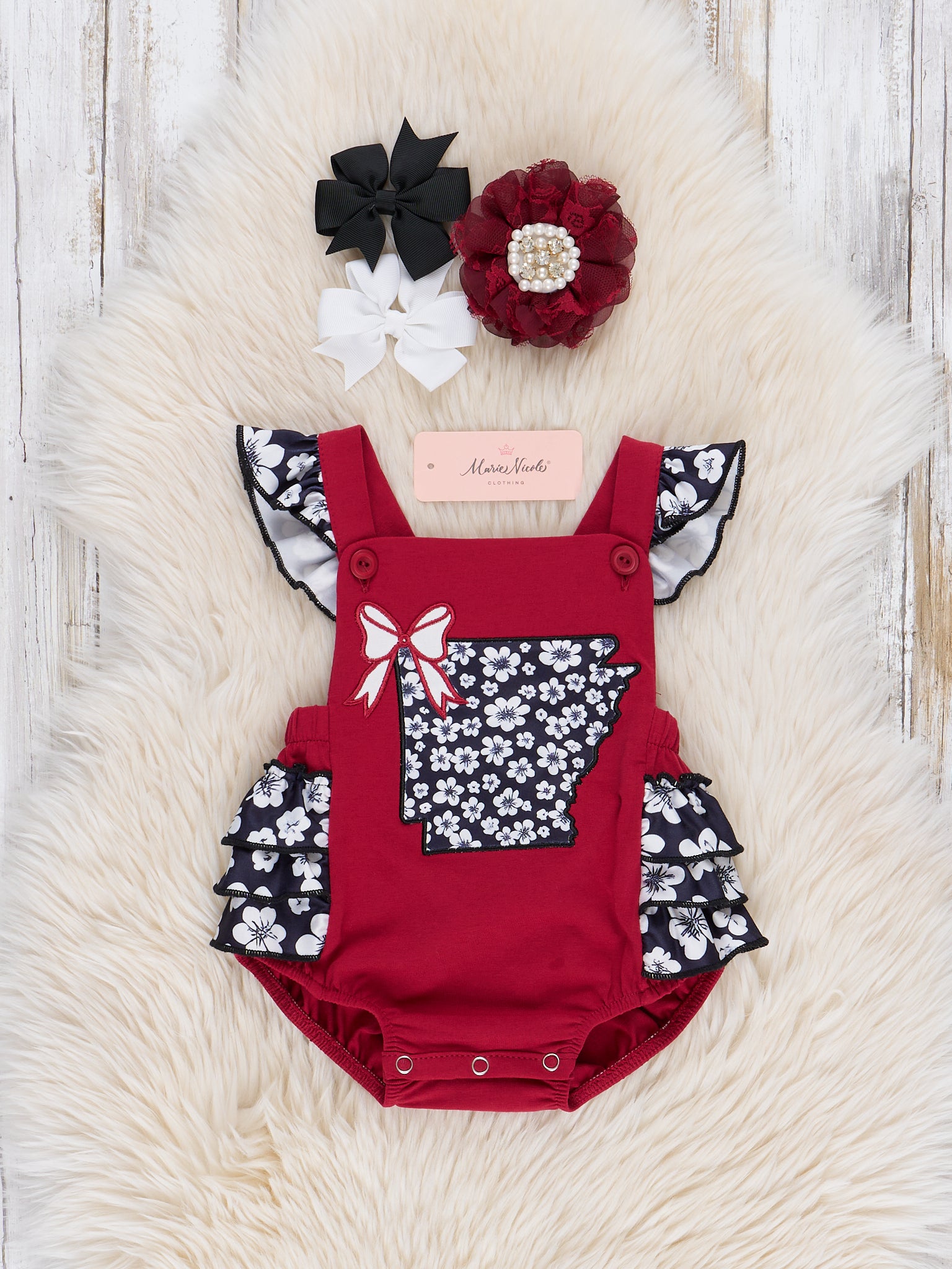 The Arkansas Embroidered Floral Ruffle Bubble is a bright and playful and perfect for sunny days and sweet adventures. Featuring a bold red color with ruffled floral sleeves and a charming Arkansas applique, this outfit from Marie Nicole Clothing is ideal for warm weather, family outings, or cheering on your favorite team in style—perfect for game day spirit!
