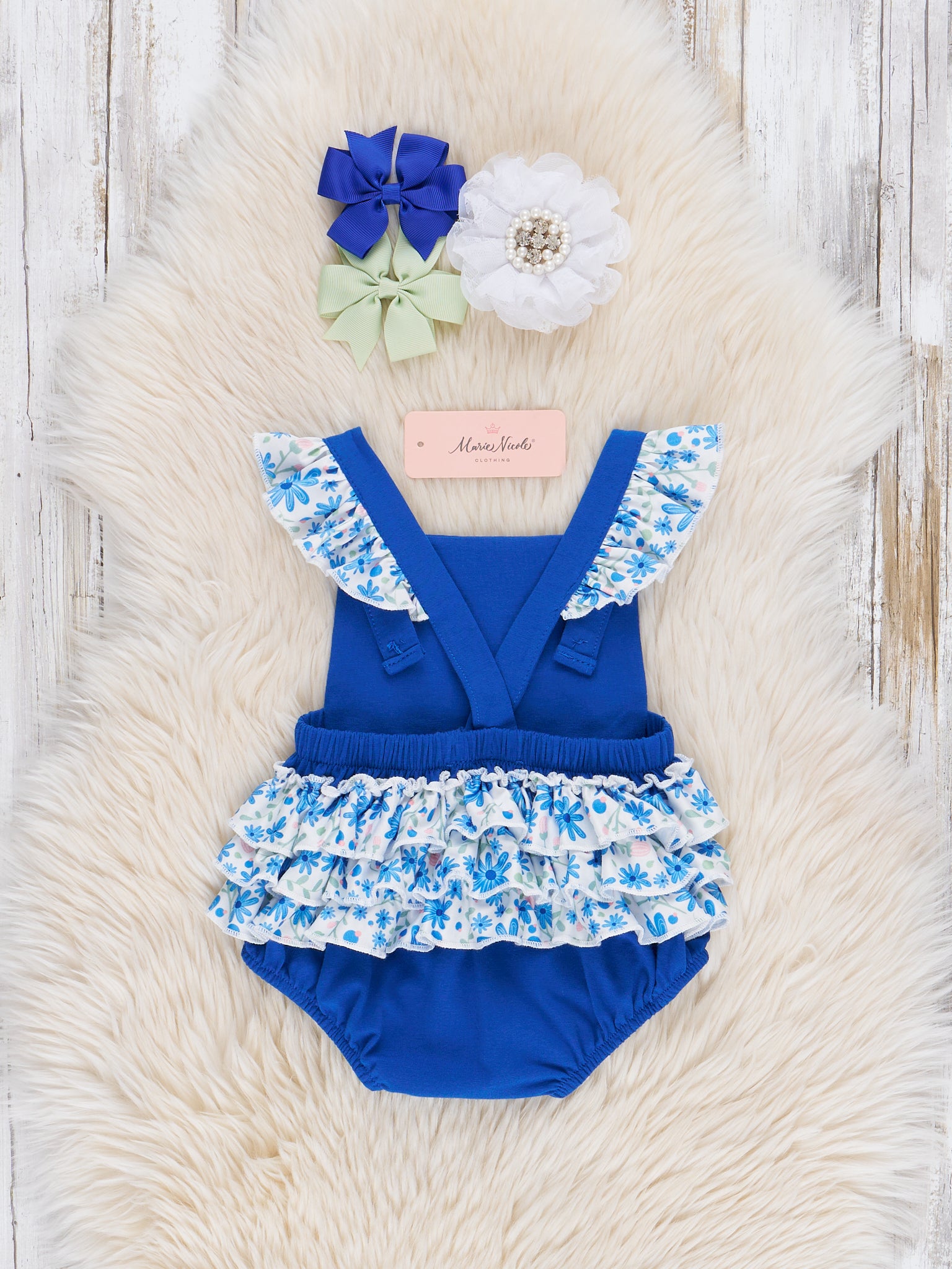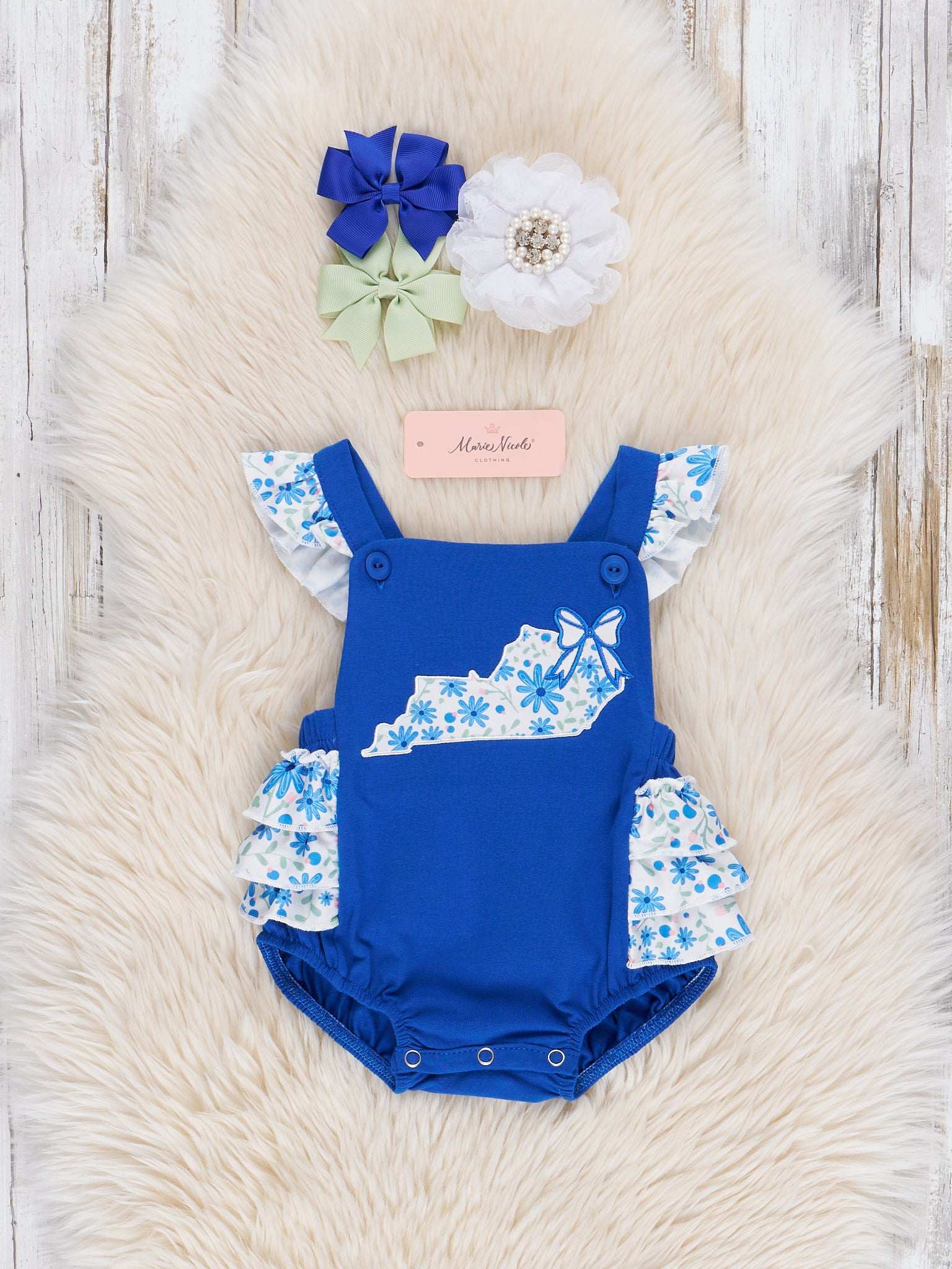 The Kentucky Embroidered Floral Ruffle Bubble is a bright and playful and perfect for sunny days and sweet adventures. Featuring a bold blue color with ruffled floral sleeves and a charming Kentucky applique, this outfit from Marie Nicole Clothing is ideal for warm weather, family outings, or cheering on your favorite team in style—perfect for game day spirit!