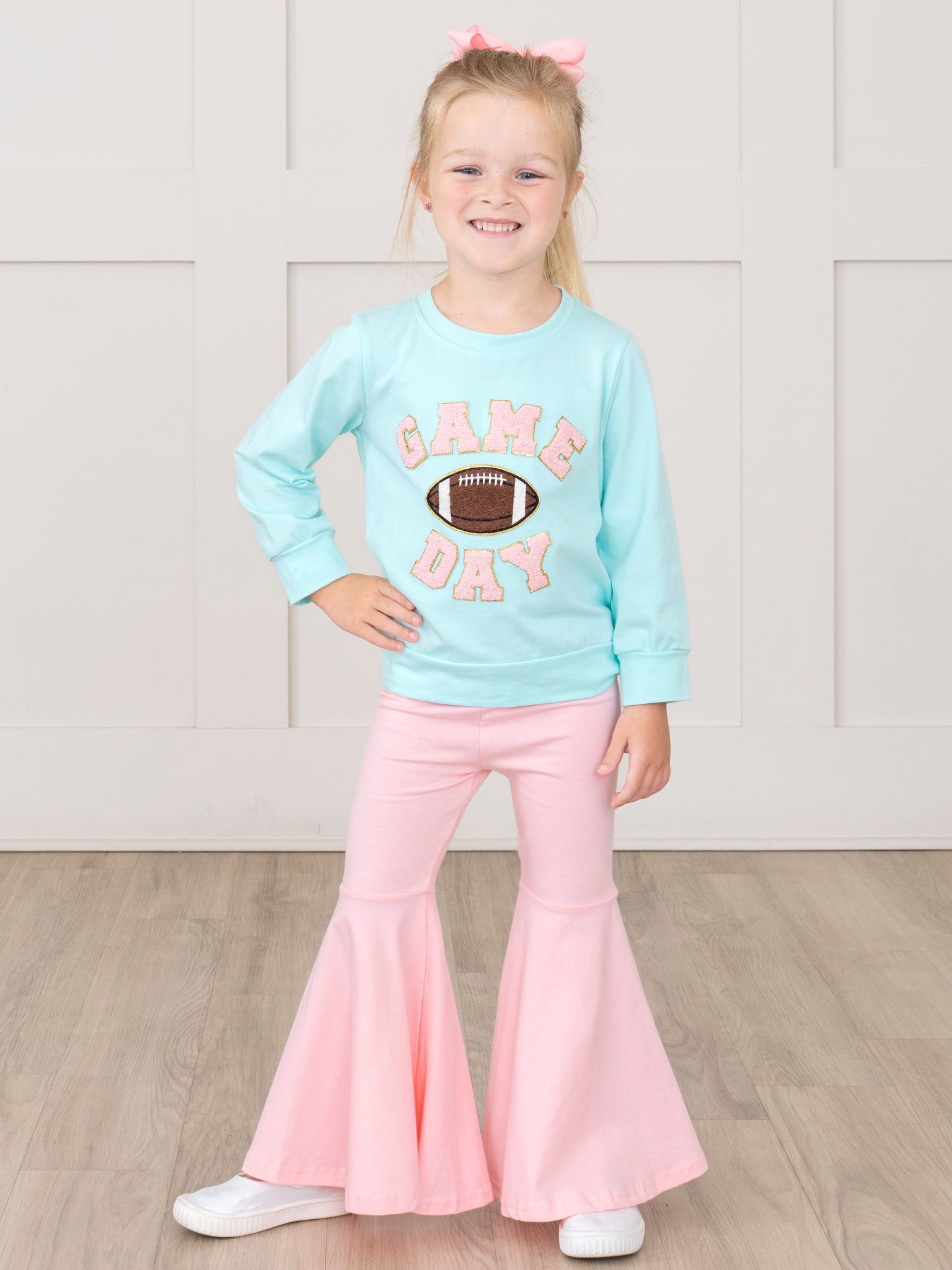 Cheerful and bright, the Gorgeous on Game Day Outfit is a delightful pick to watch a game. This colorful two-piece set by Marie Nicole Clothing features a sweatshirt style flared pants for a fashionable silhouette! Your little girl will be comfy and absolutely cute in this outfit.