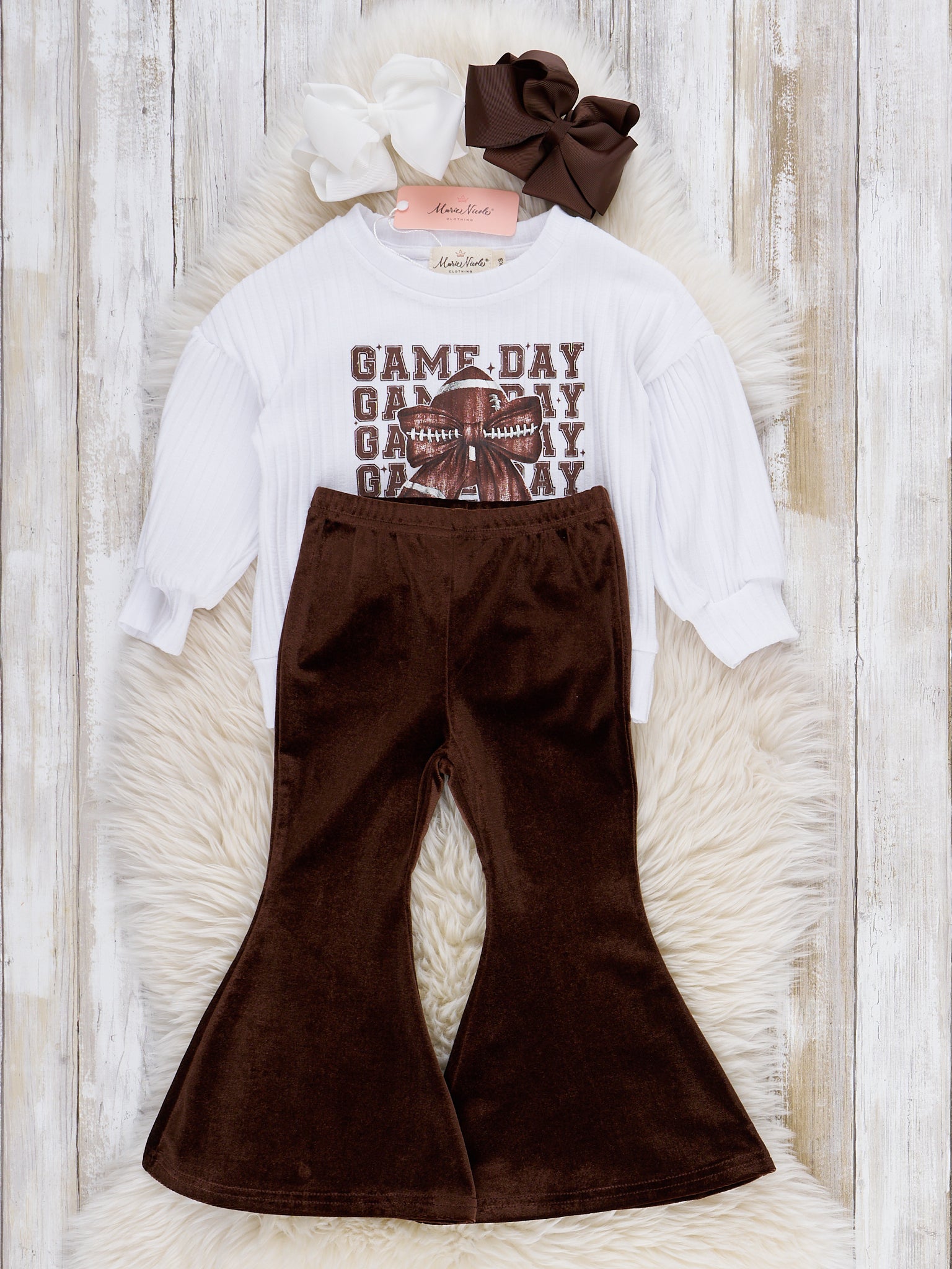 Bow ties, not game ties! The Stylish on Game Day Outfit is a comfy and casual two-piece set that is perfect for sitting back and watching a good game. This outfit from Marie Nicole Clothing is special for it bell bottom pants, which gives the love a trendy flare. Show off your little girl's spirit with this stylish outfit!