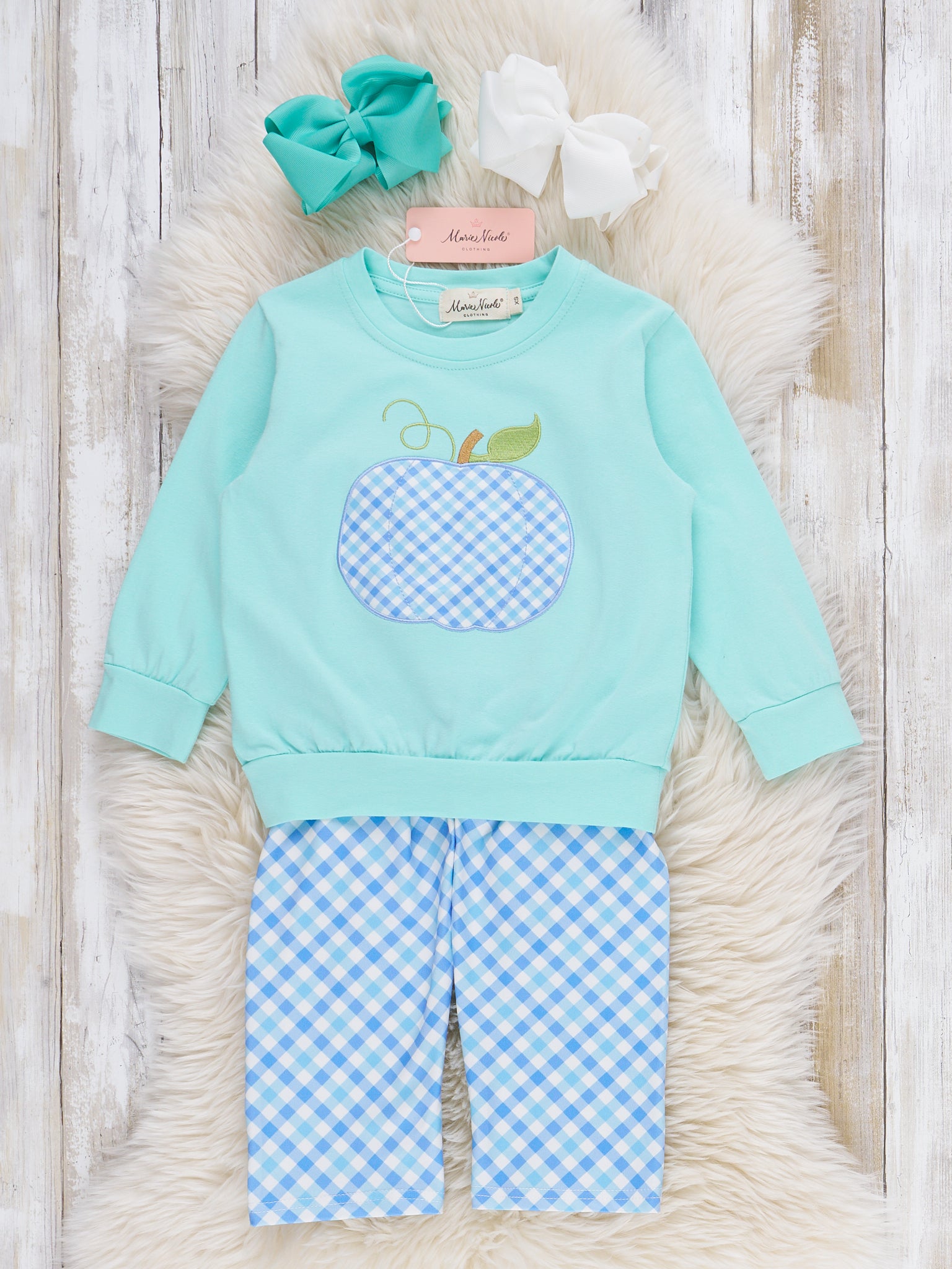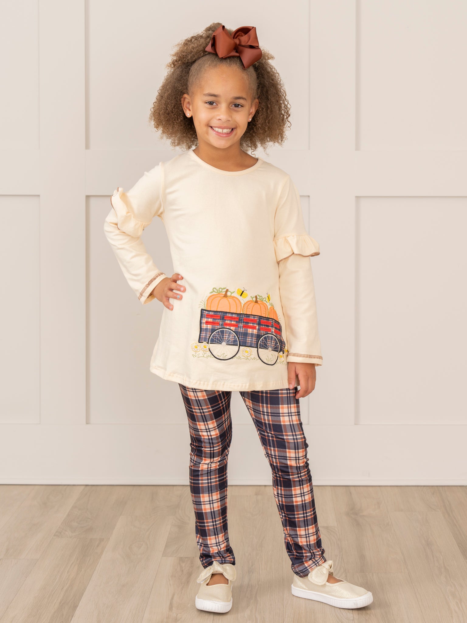 Brown Embroidered Pumpkin Wagon Plaid Outfit