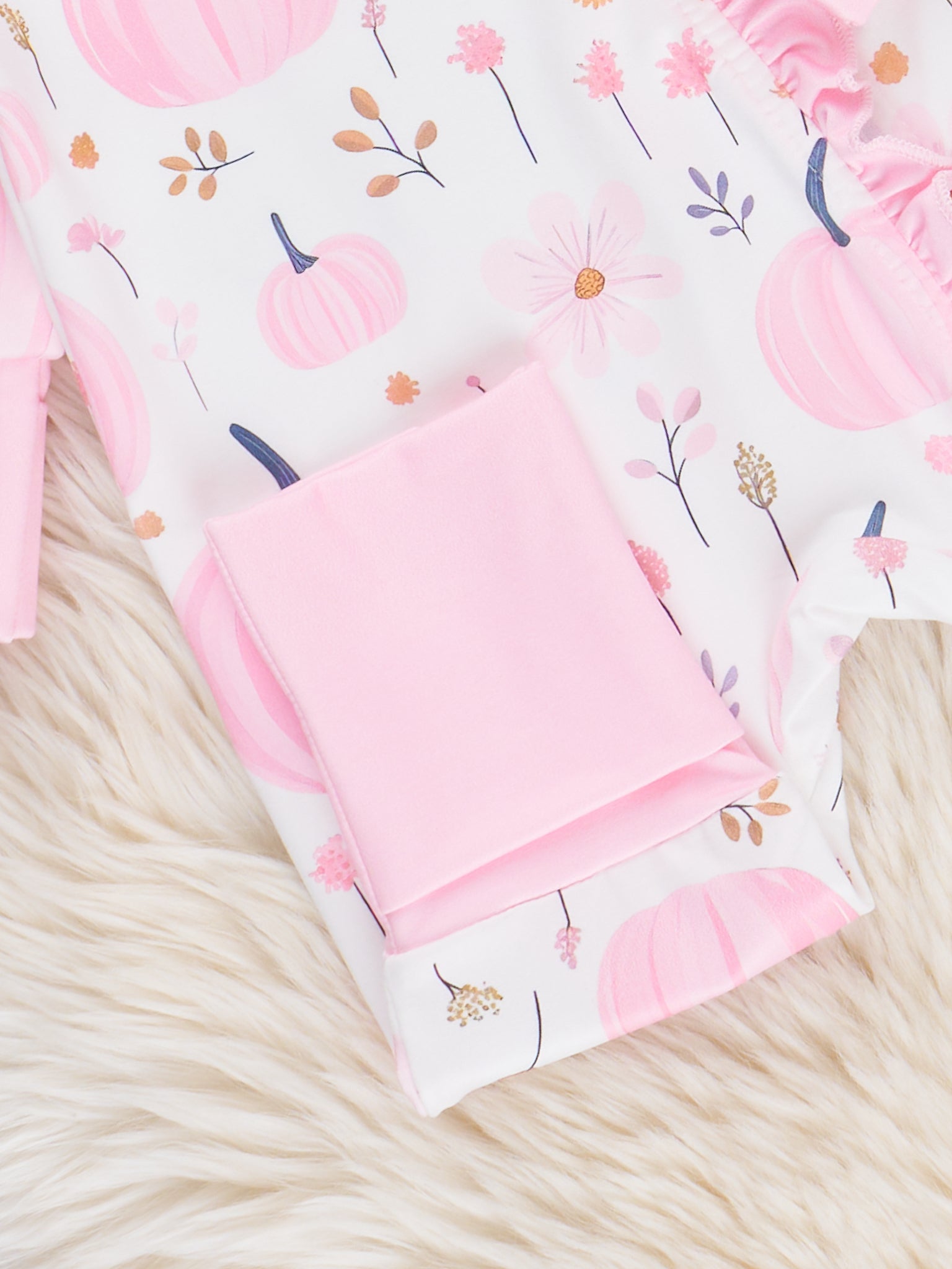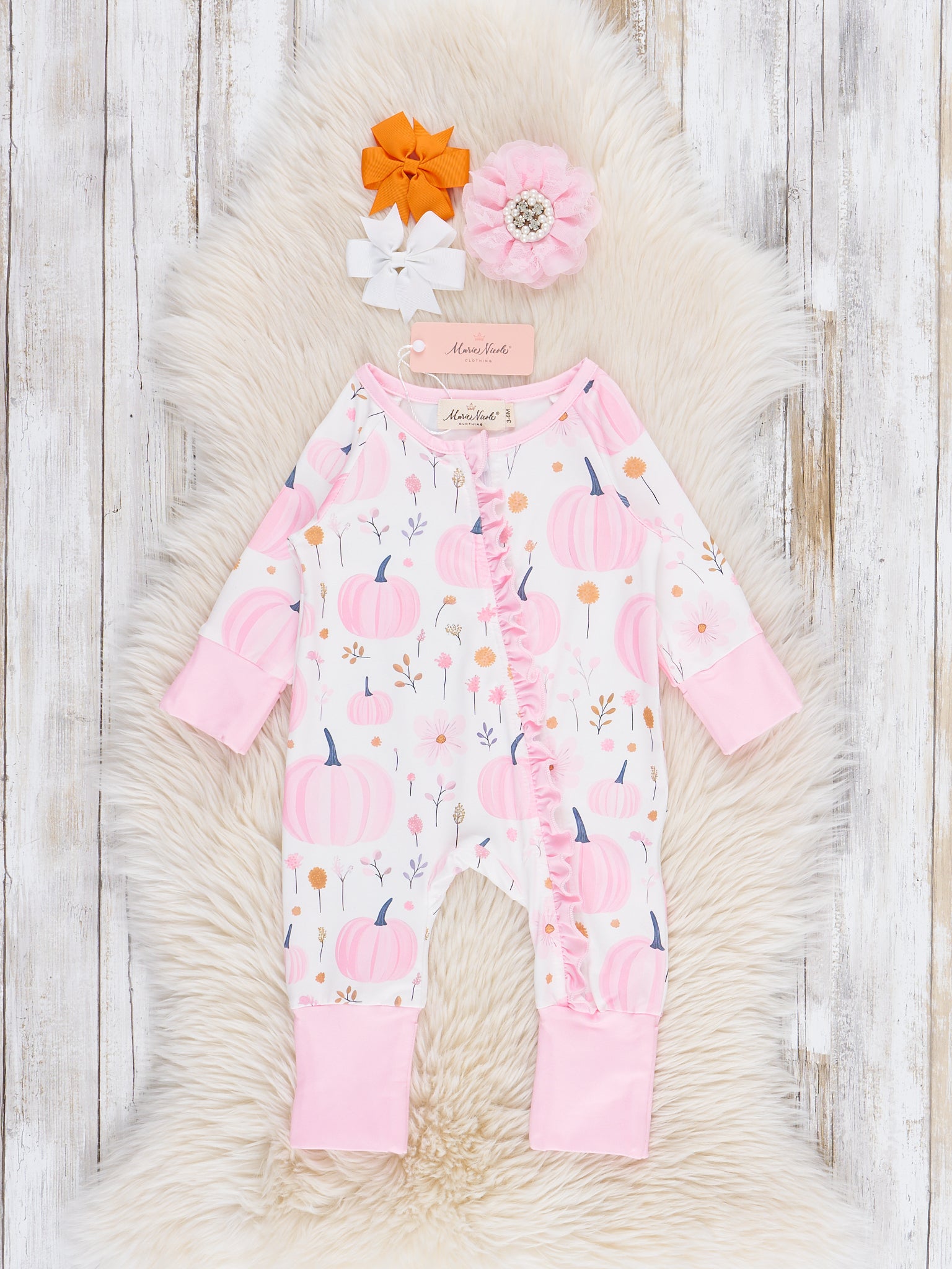 The Cozy in the Patch Sleeper Pajamas is a comfortable and cute sleepwear pick for your baby. With ruffled embellishments and pumpkin patterns, this one-piece from Marie Nicole Clothing charms with pink, autumn abundance. It is designed with soft, stretchy fabric, so your child can dress comfortably for fall days, seasonal photos, and all their pleasant sleep-time dreams.