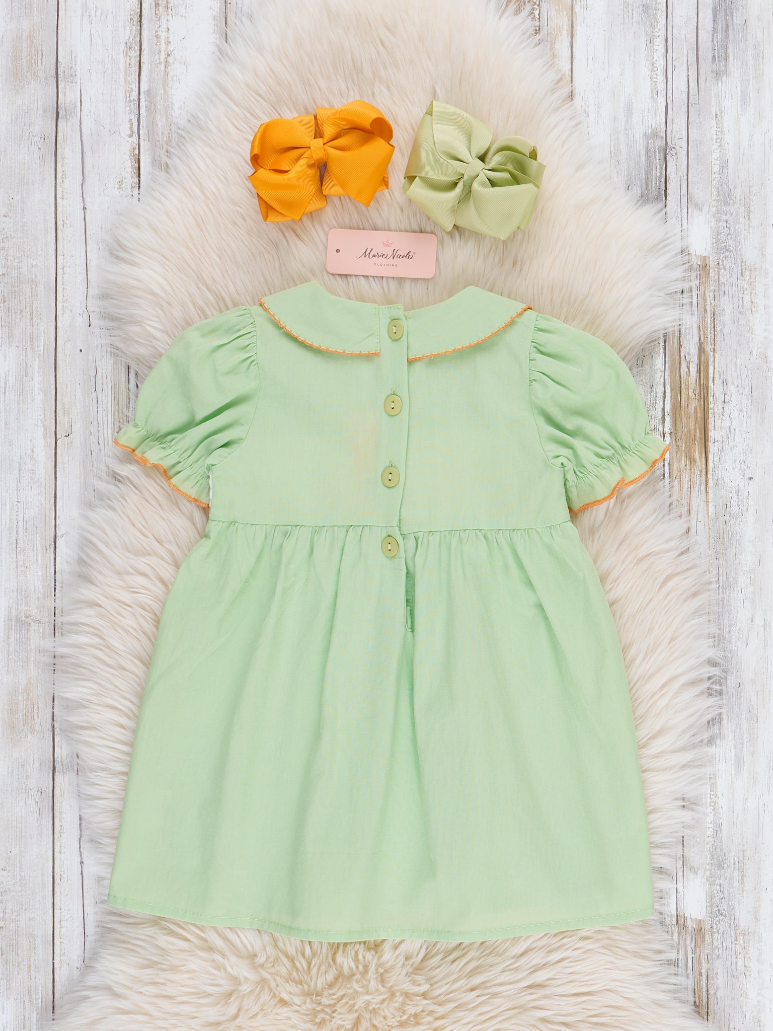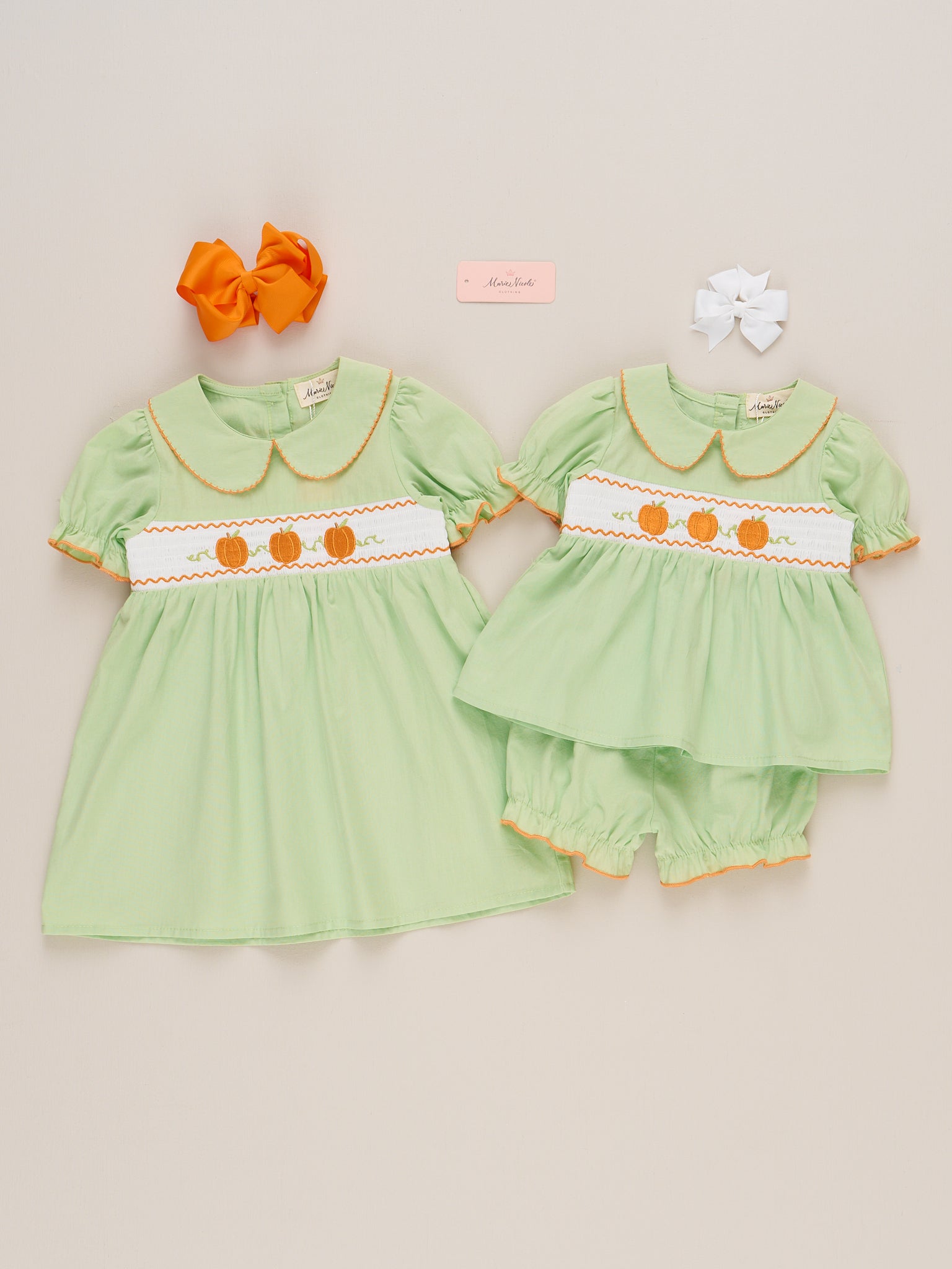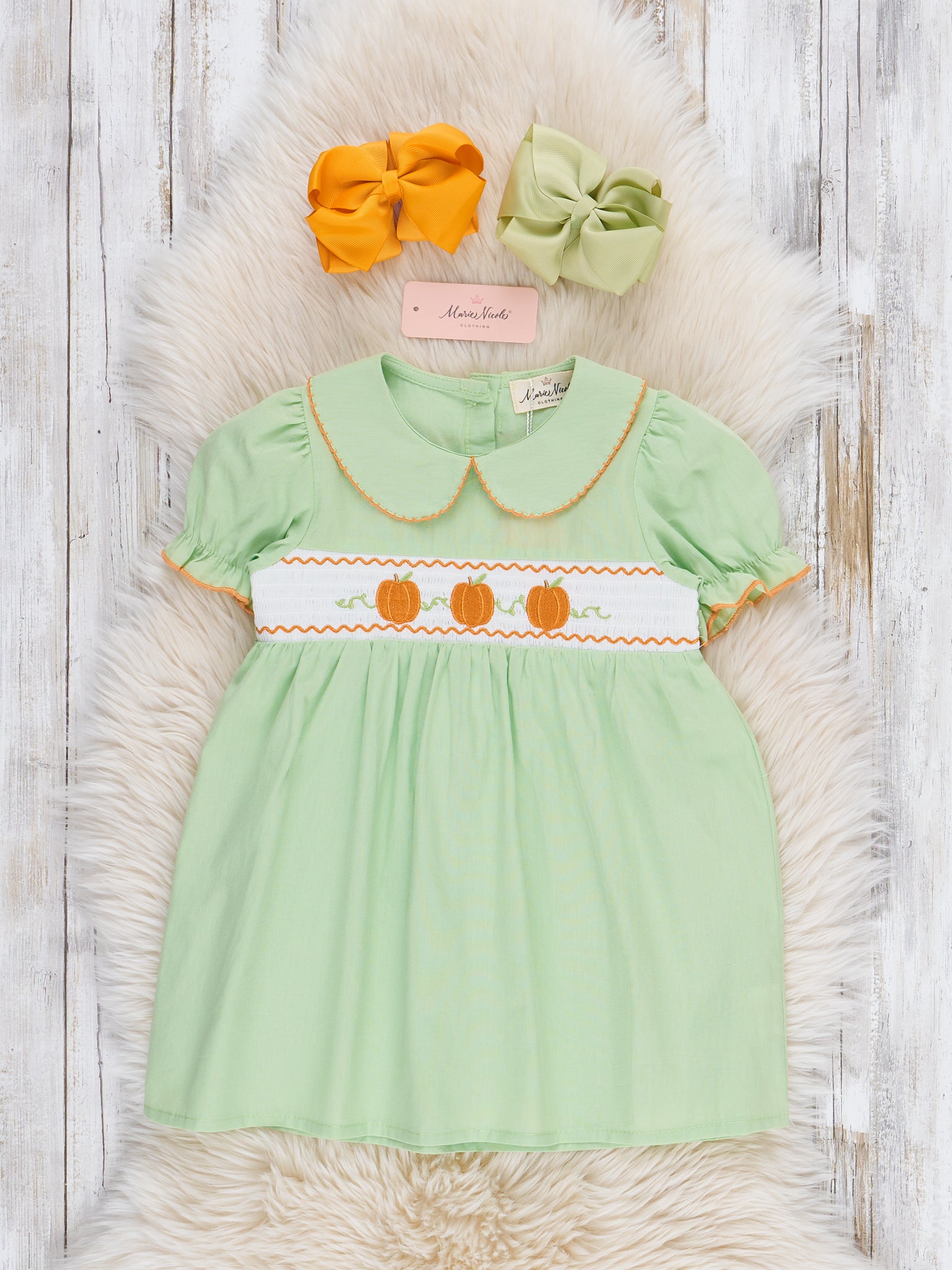 The Smocked Embroidered Sweet Pea Pumpkin Dress is perfect for days in the garden and visits to the pumpkin patch! From Marie Nicole Clothing, this dress features a smocked bodice and the cutest pumpkin embroidery. The delightful green fabric is soft and comfy and makes for a charming look, fit for fall photos and family gatherings!