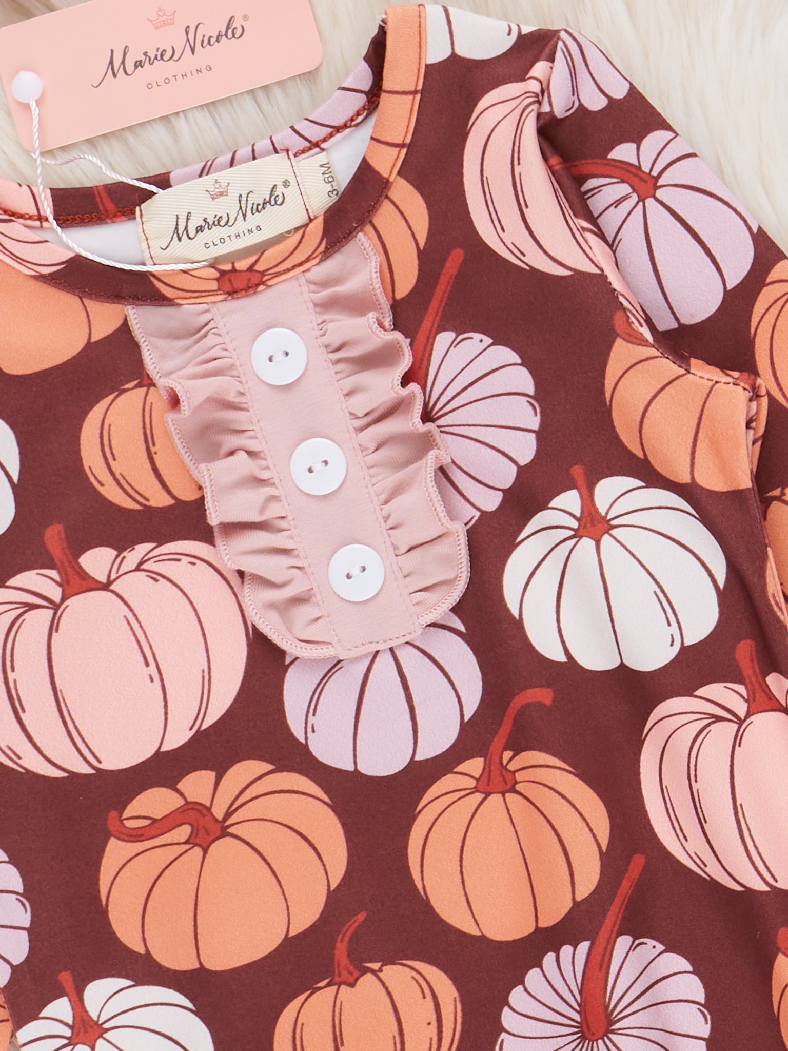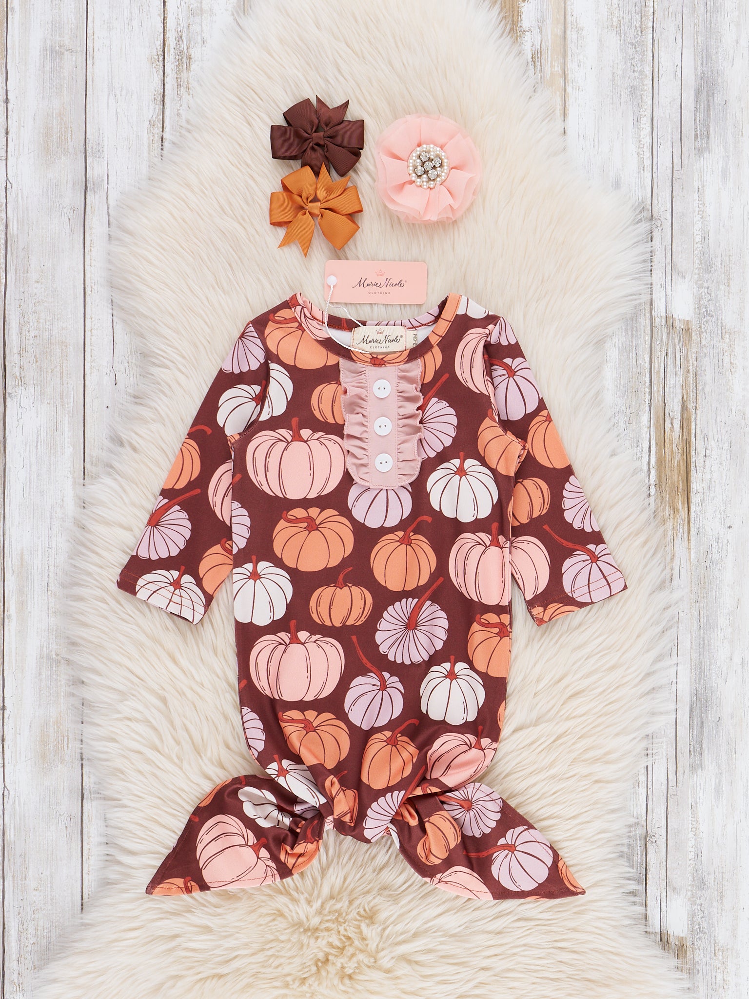 The Cozy Season Ruffle Knot Gown is a cozy and charming choice perfect for your little one’s first fall moments. Featuring a warm pumpkin-inspired print in rustic tones, this gown from Marie Nicole Clothing is made with soft, breathable fabric and finished with an easy knot bottom for quick changes. Ideal for snuggles, naps, and celebrating all the pumpkin dreams of the season.