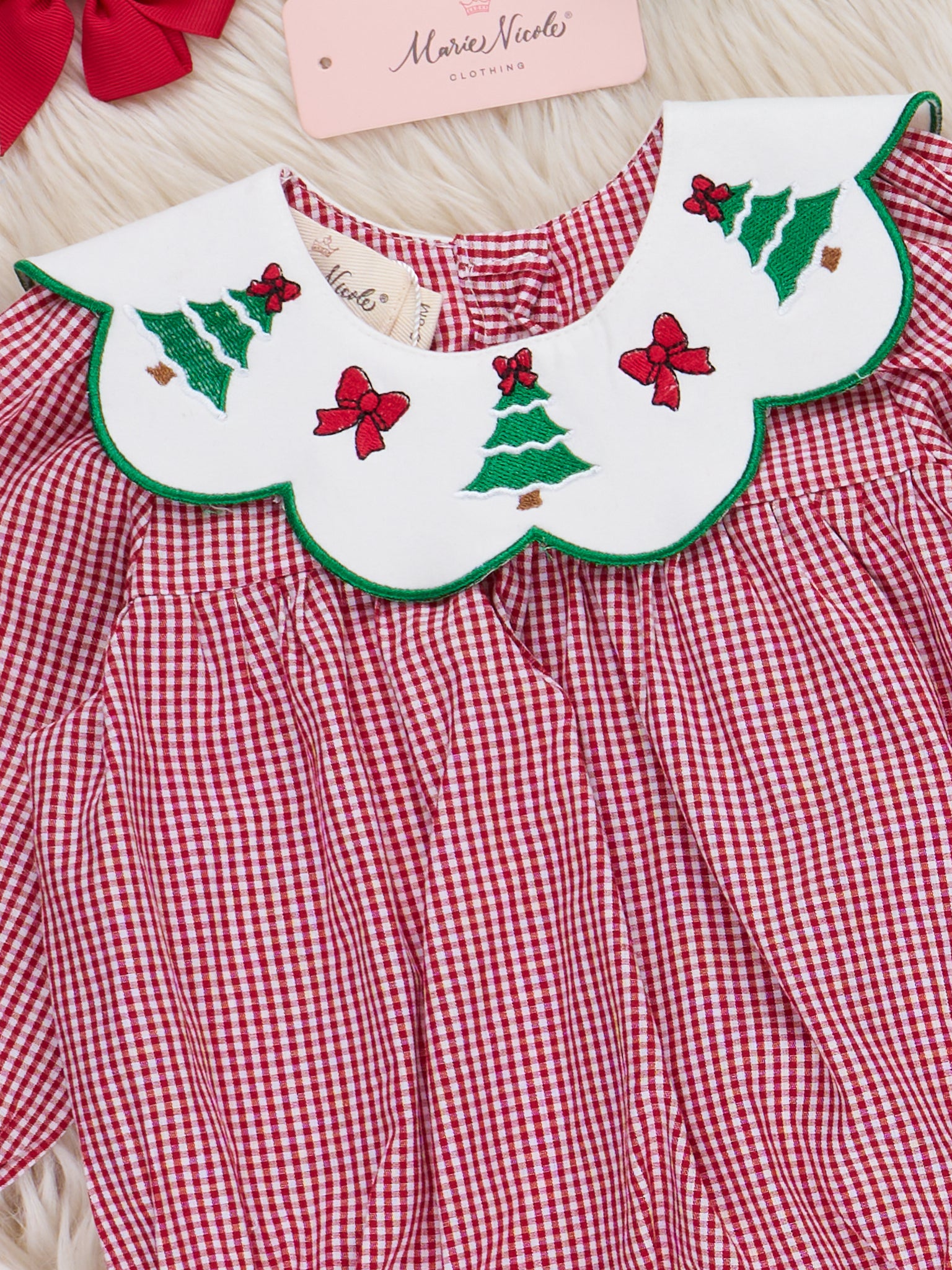 The Festive Bow & Tree Cotton Bubble by Marie Nicole features a classic long-sleeve silhouette with a gently gathered body and a charming scalloped collar, beautifully embroidered with festive tree and bow motifs. Snap closures make changes easy, while the sweet details add a touch of holiday cheer