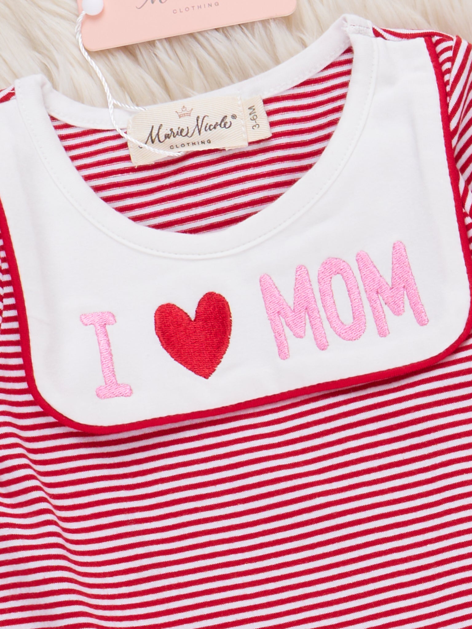 Little Love for Mom Embroidered Romper by Marie Nicole Clothing features a charming embroidered message, perfect for little ones to show how much they adore their mom. This sweet and cozy romper is ideal for celebrating special moments with mom, whether it's Mother's Day or just a day filled with family love.