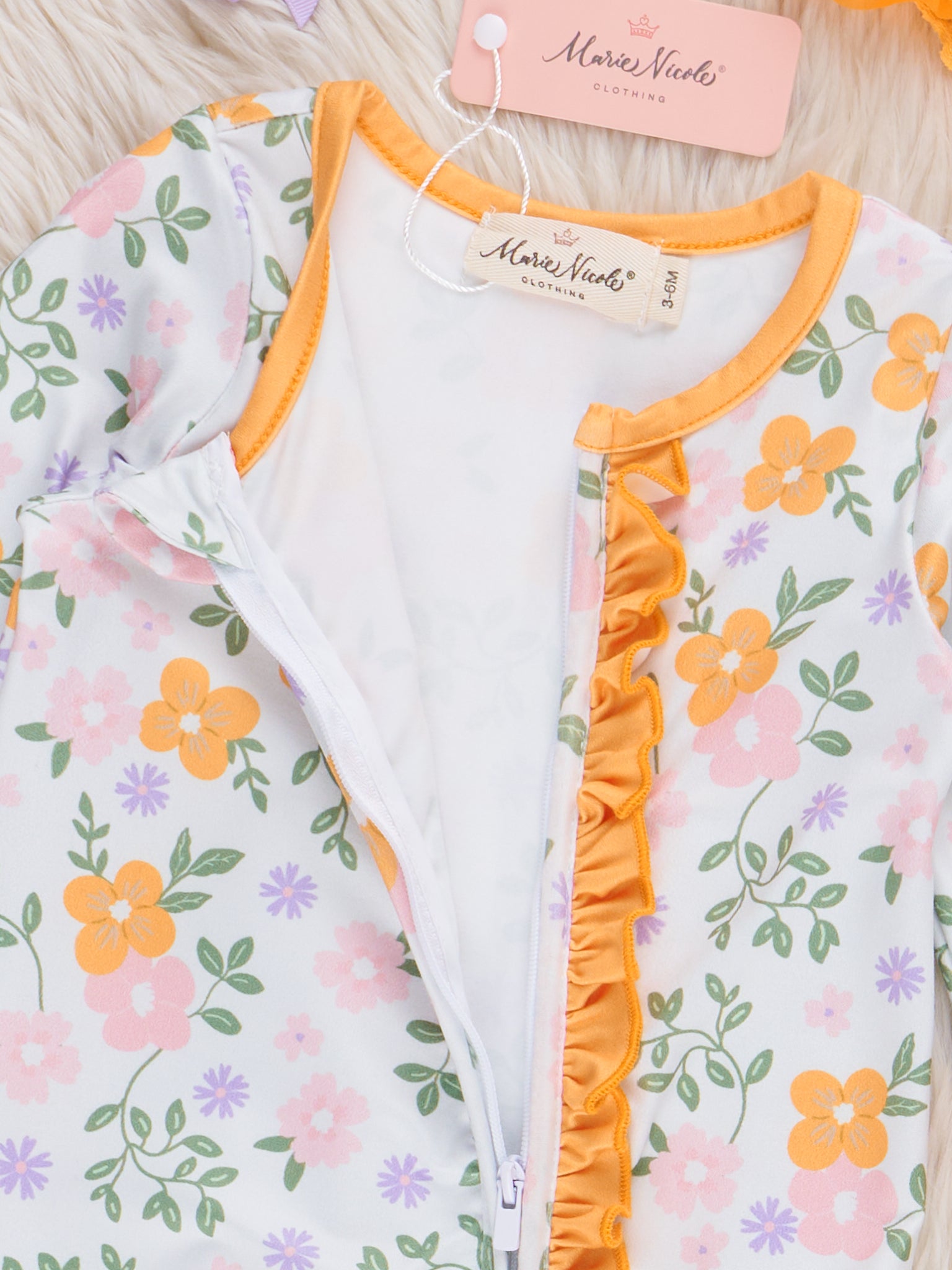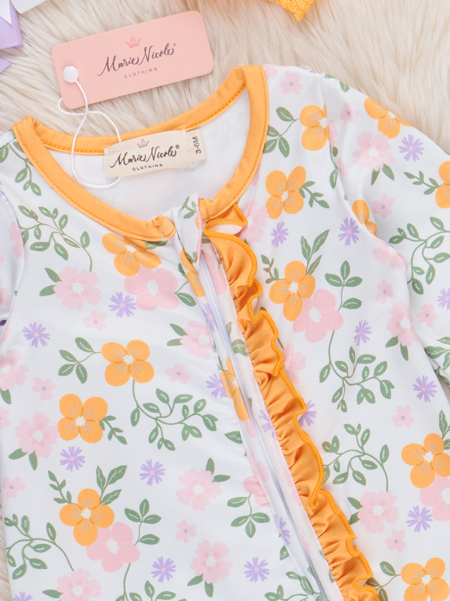 The Buttercup Blooms Ruffle Sleeper Pajamas by Marie Nicole Clothing feature a happy floral design with ruffle accents along the zipper, soft cuffed ankles and sleeves, and gentle fabric for all-night comfort. This sleeper brings a touch of cheerful style and cozy protection, making it perfect for bedtime and daytime play.