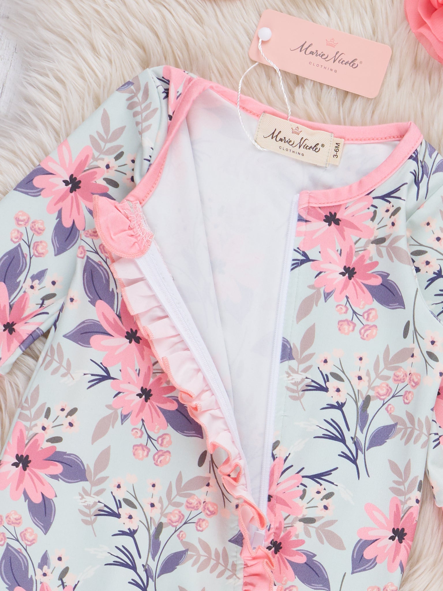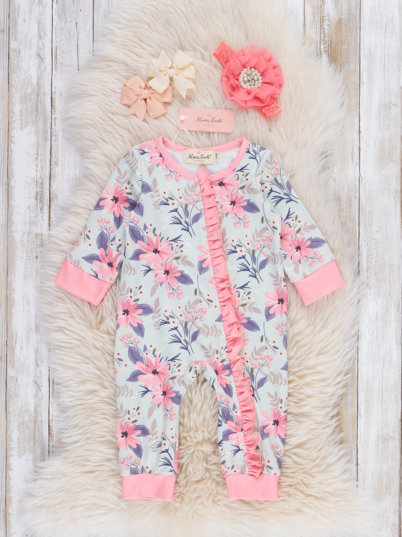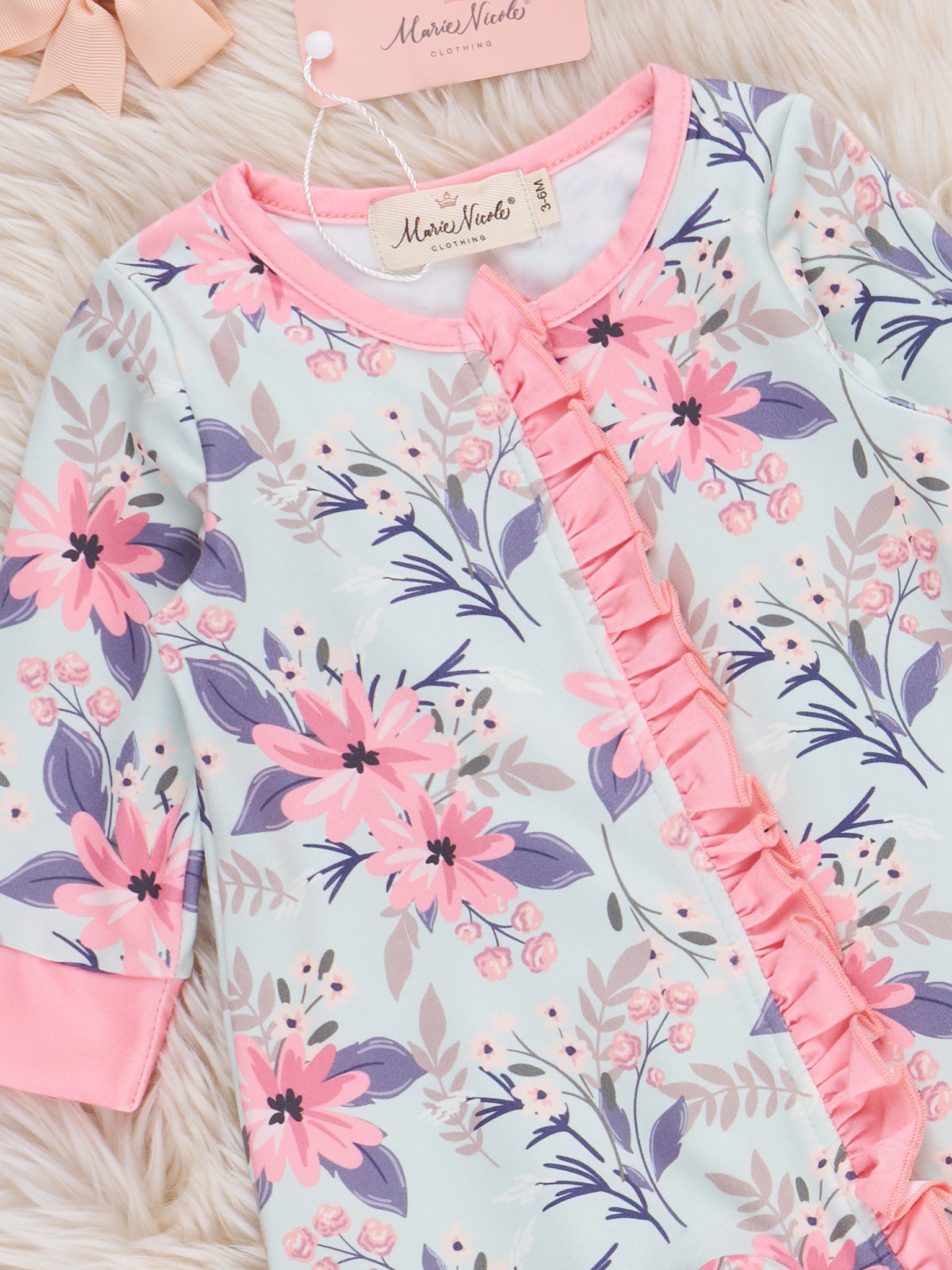The Pinky Blooms Pajamas by Marie Nicole feature a delicate floral print on a soft, long-sleeve romper. Designed with an off-center ruffle-trimmed zipper and comfortable contrasting cuffs, these pajamas offer both charm and cozy practicality for restful nights