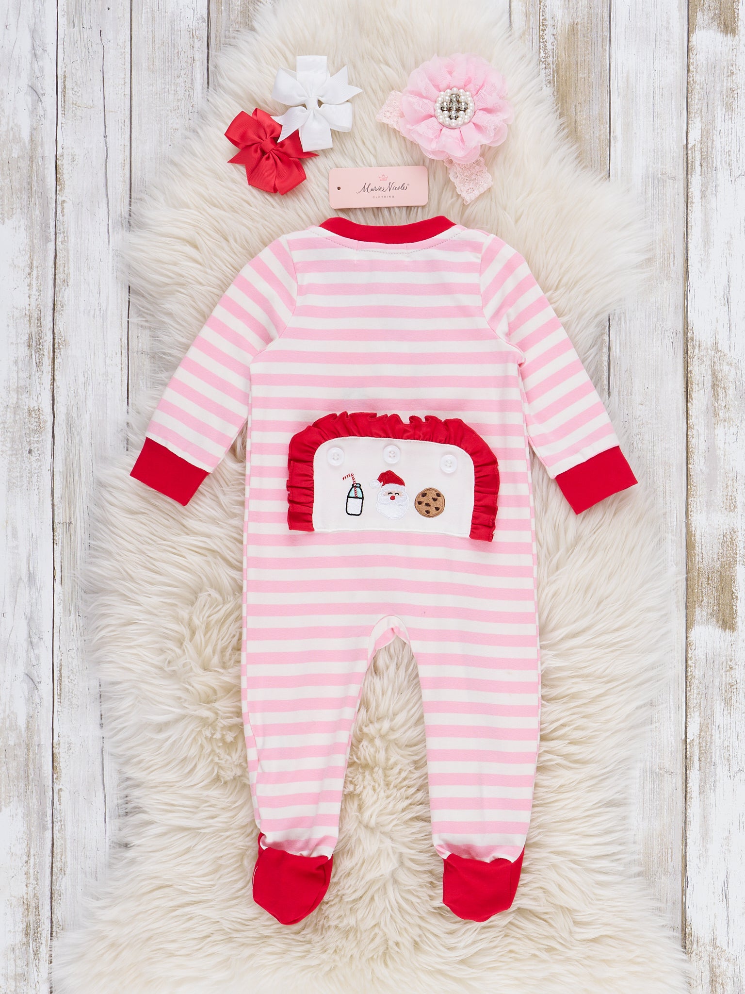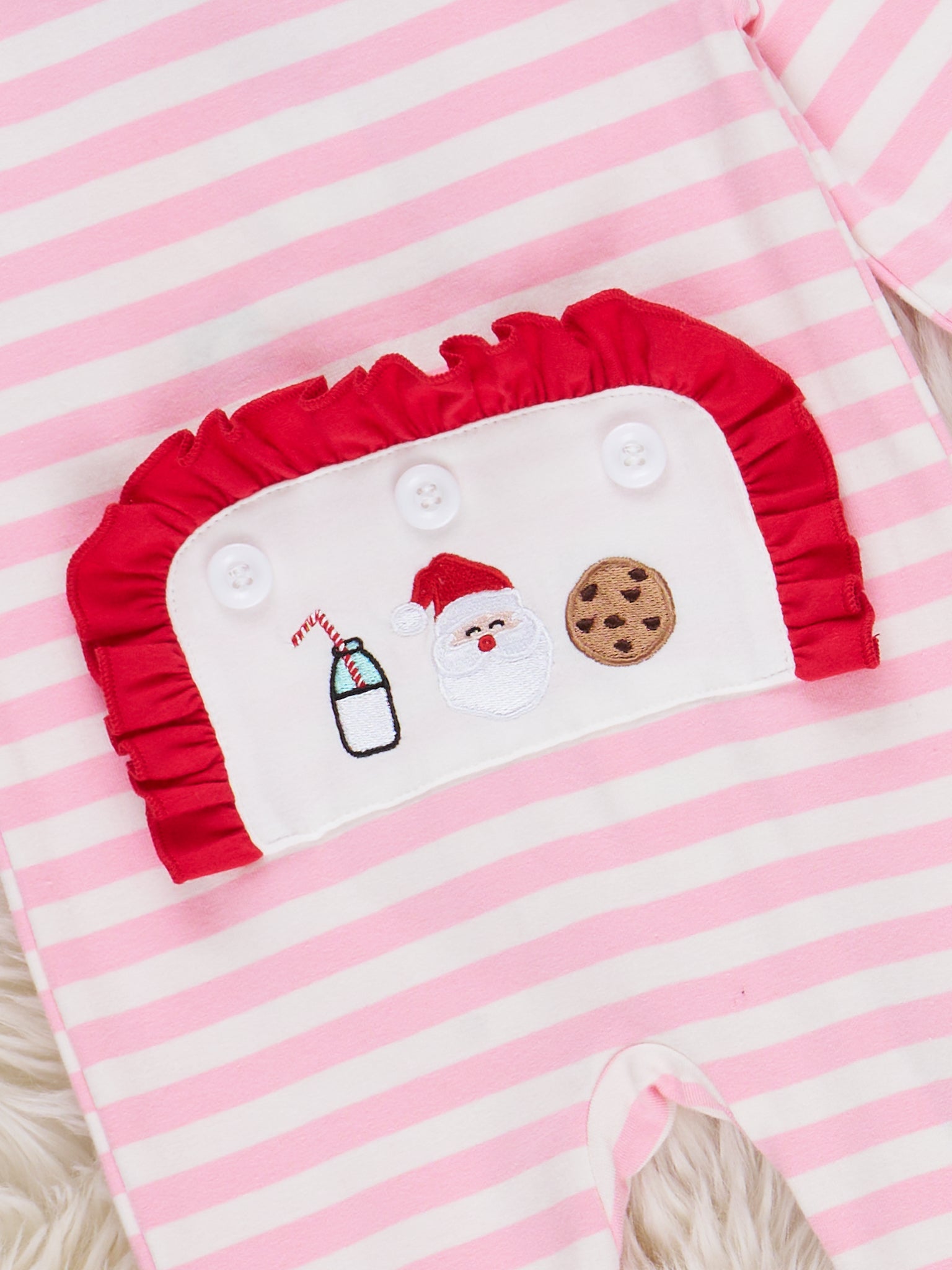 Get your little ones ready for a cozy and whimsical holiday season with our Santa Treat Time Embroidered Footed Sleeper Pajamas. These girls pajamas feature playful stripes and a festive trim. The asymmetrical zipper closure adds convenience while the Santa cookies butt flap brings a dose of humor. (Don't worry--it doesn't actually open.) Don't forget to grab the matching sister set for double the fun!