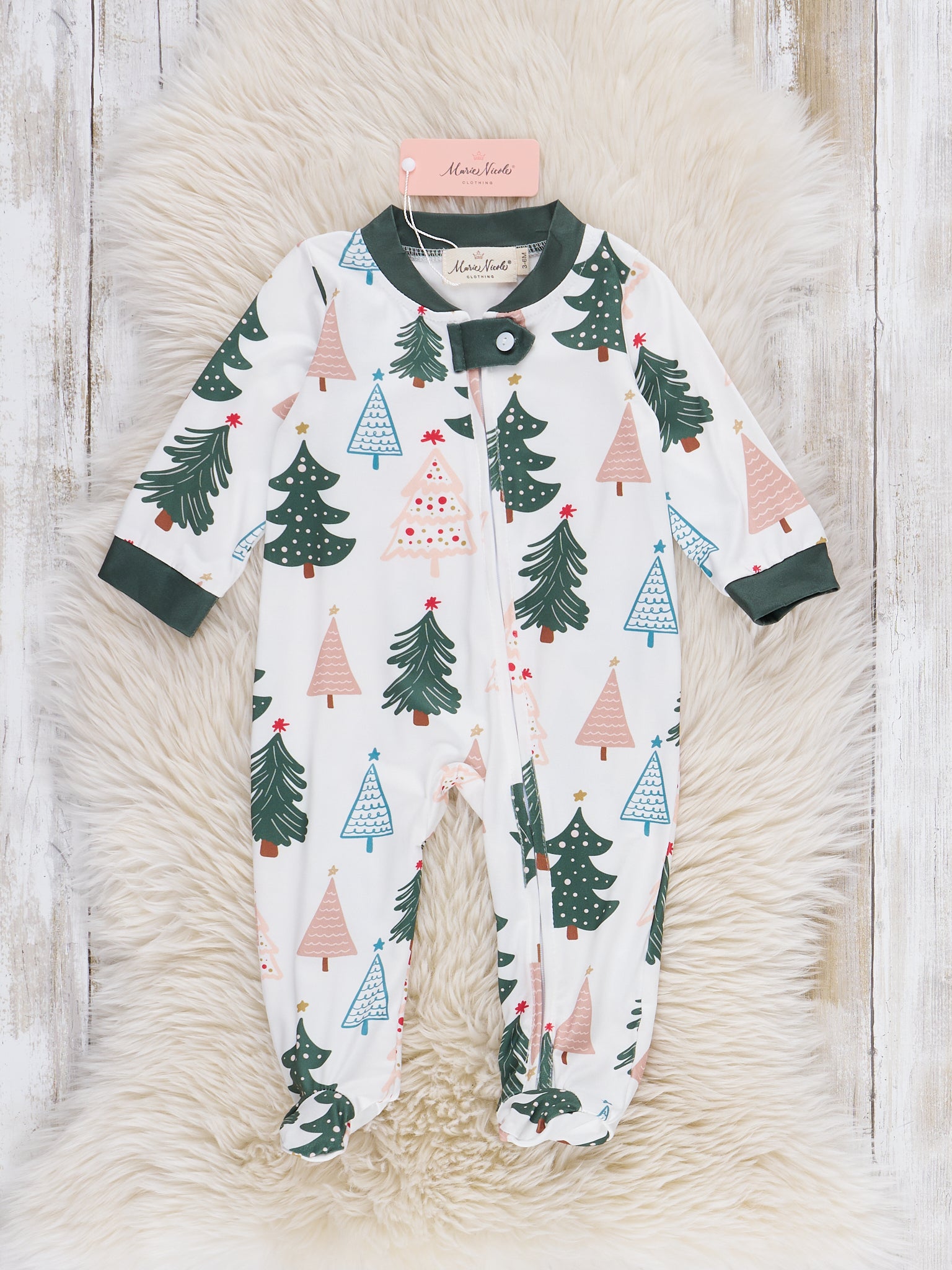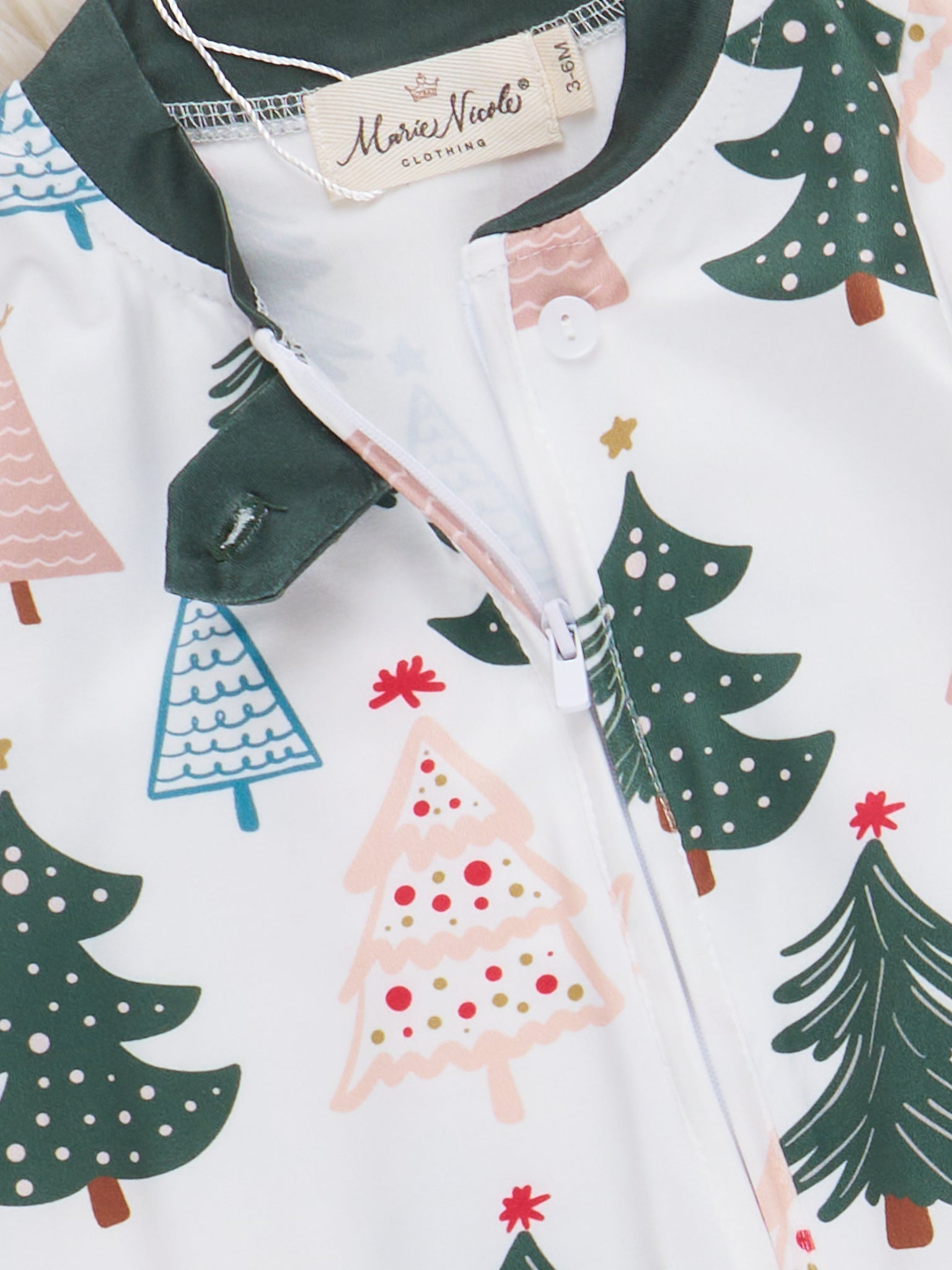 Starry nights galore! The Starlit Evergreens Sleeper Pajamas by Marie Nicole Clothing is full of Christmas trees and holiday magic. With a comfy fit and soft fabric, this piece is snug and cozy, perfect for winter evenings at home. Brighten up your little boy's night of rest with this charming one-piece!