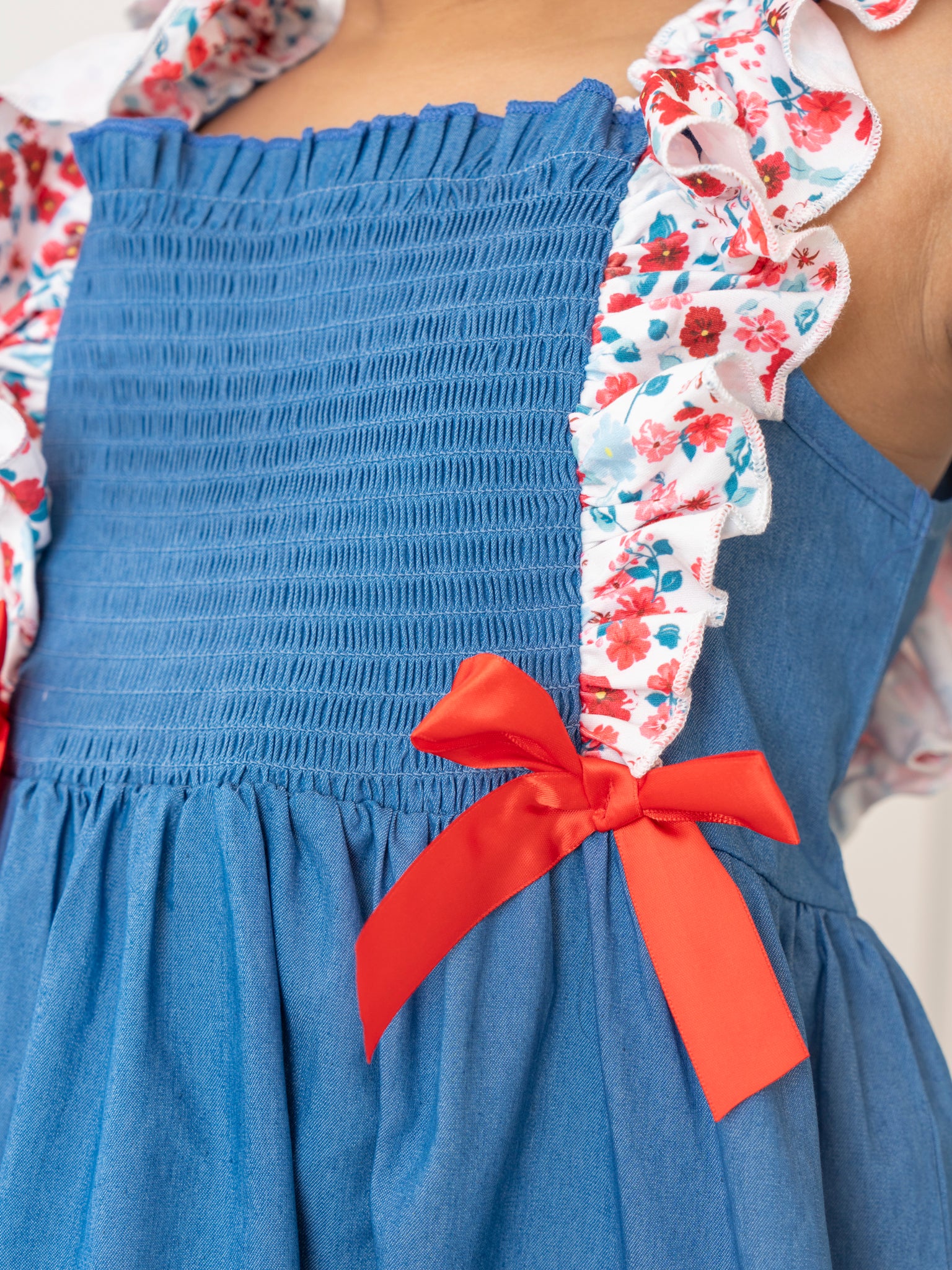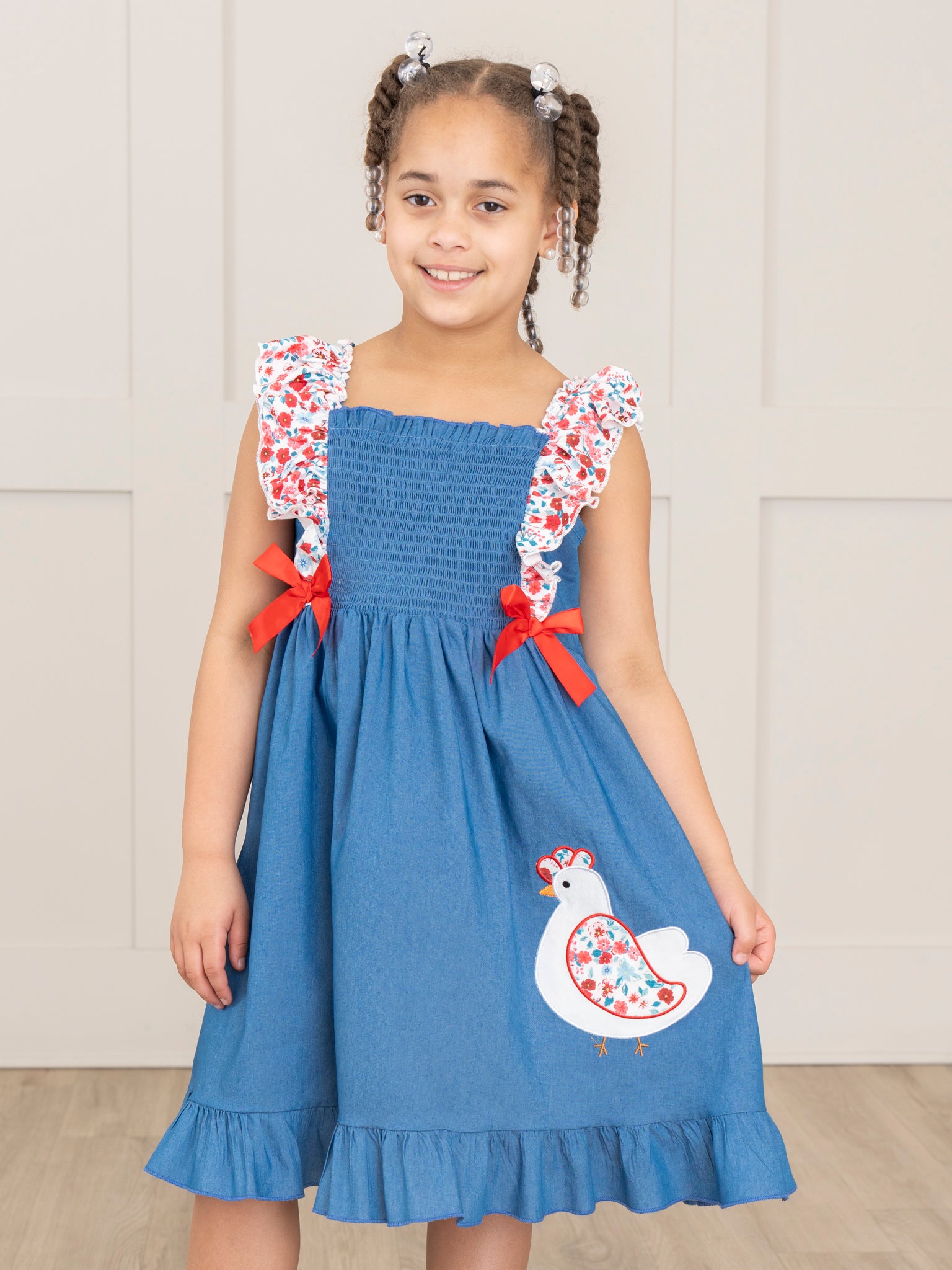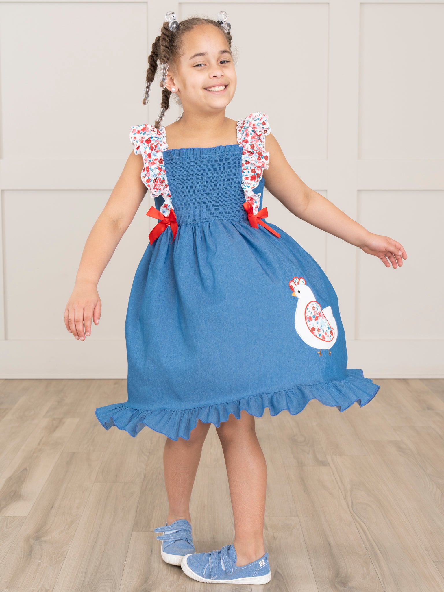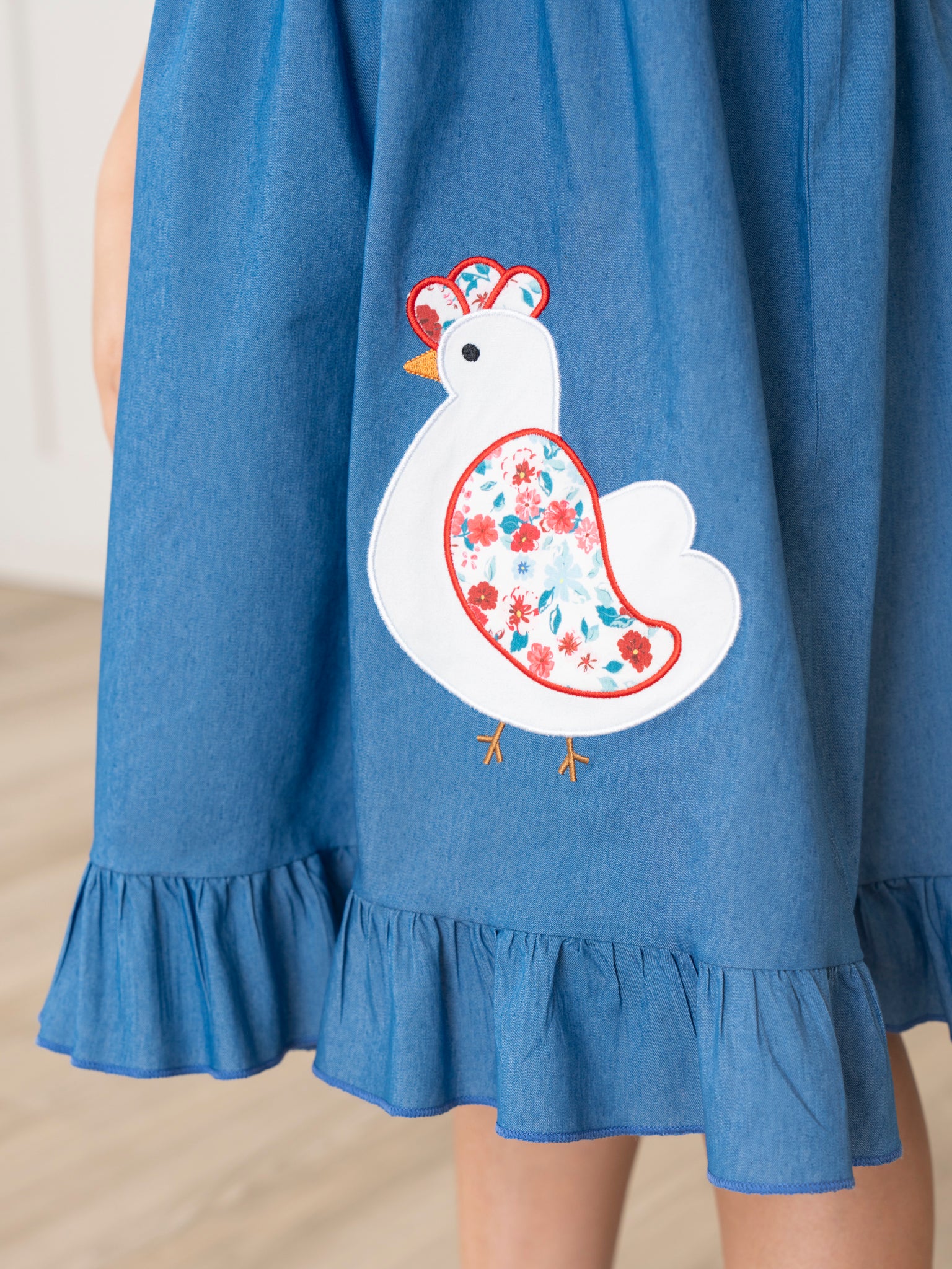 Chambray Embroidered Floral Chicken Ruffle Dress