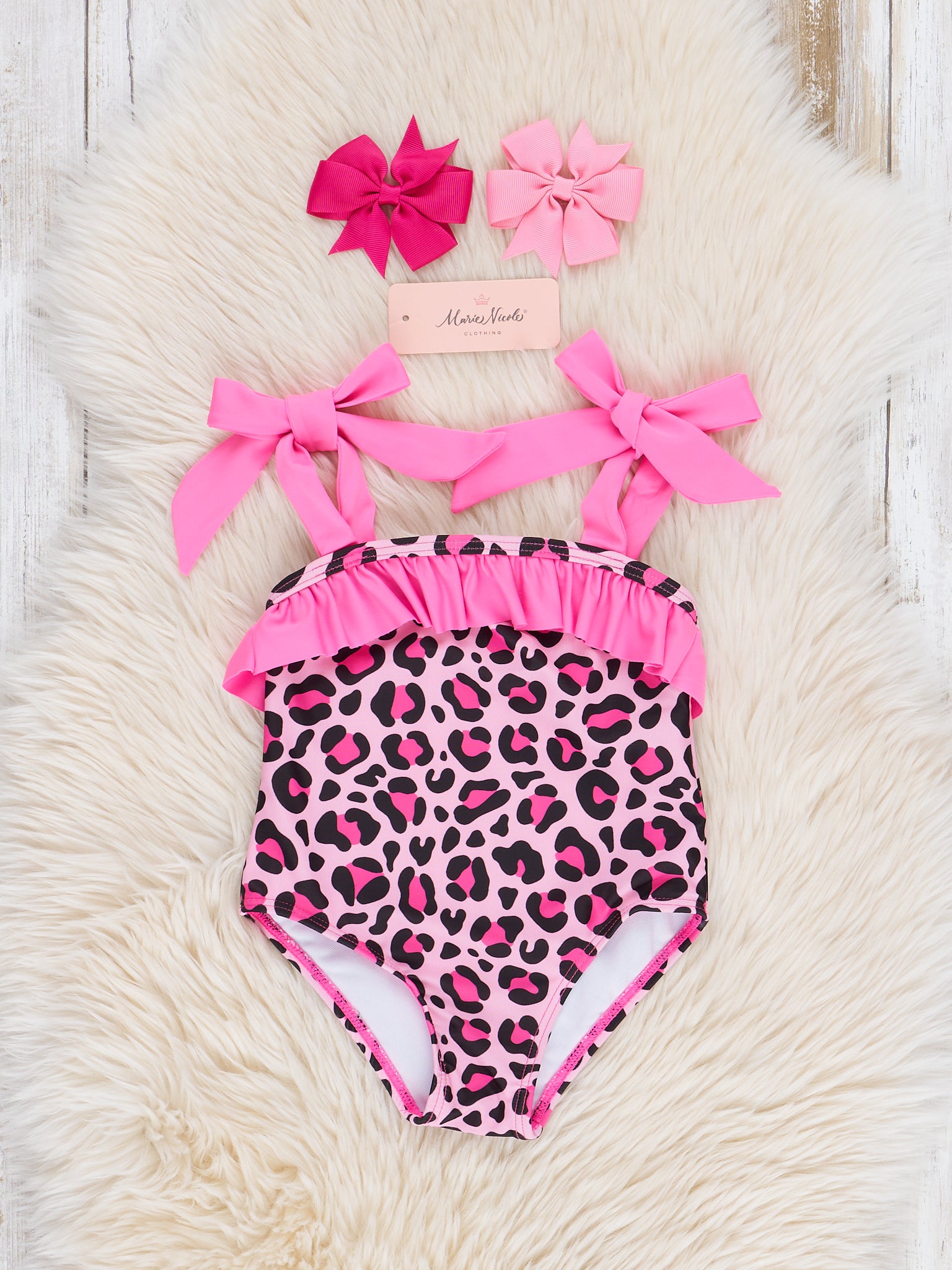 Peach Leopard Puff Sleeve Ruffle Swimsuit
