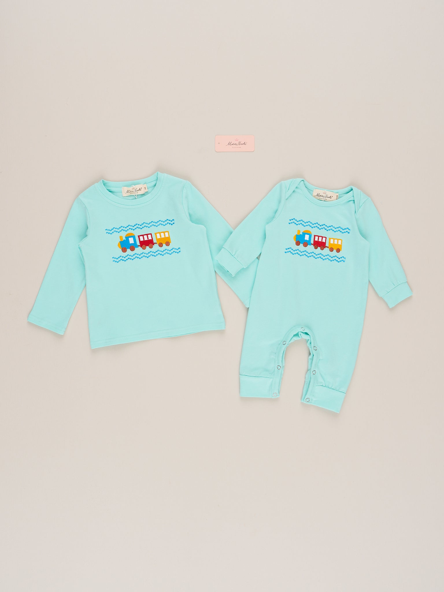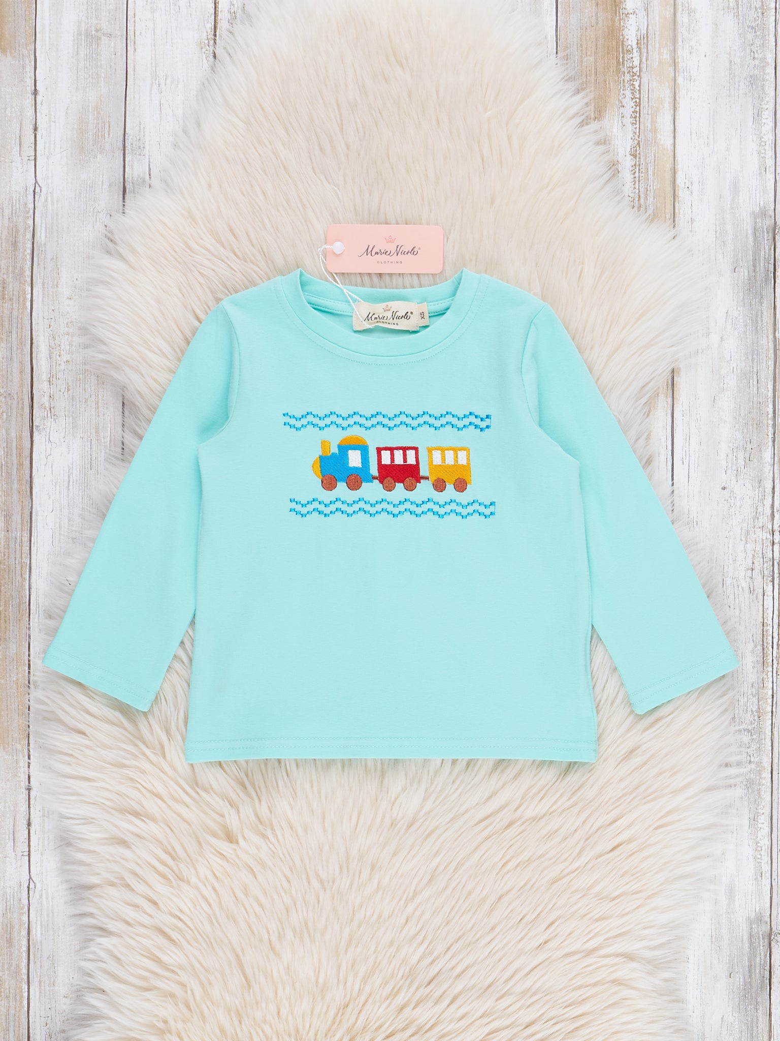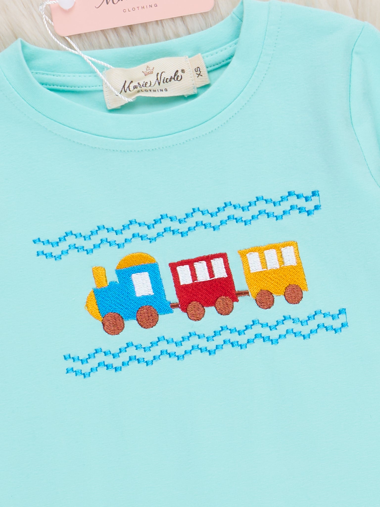 Get your little ones stylin' with this train-tastic shirt! This boys top features a beautifully embroidered train design on a teal bodice. Make it a sibling set and get the whole crew matching! Now that's what we call 'choo-choo chic'! 🚂