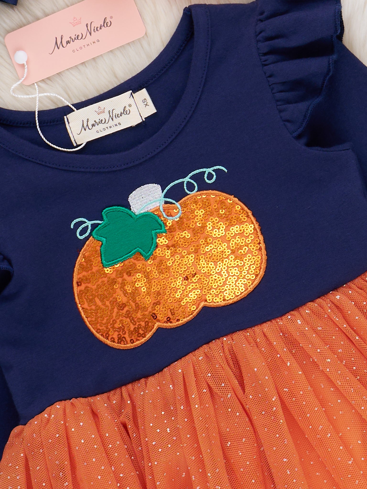 The Embroidered Sparkle Pumpkin Ruffle Tulle Dress is a stunning piece for Halloween parties and celebrations. This Marie Nicole Clothing piece shines with its glittery, embroidered pumpkin, ruffled shoulders, and sparkly tulle skirt. Crafted with soft fabric, it impresses while staying comfortable for taking pumpkin patch visits, Halloween pictures, and exciting events.