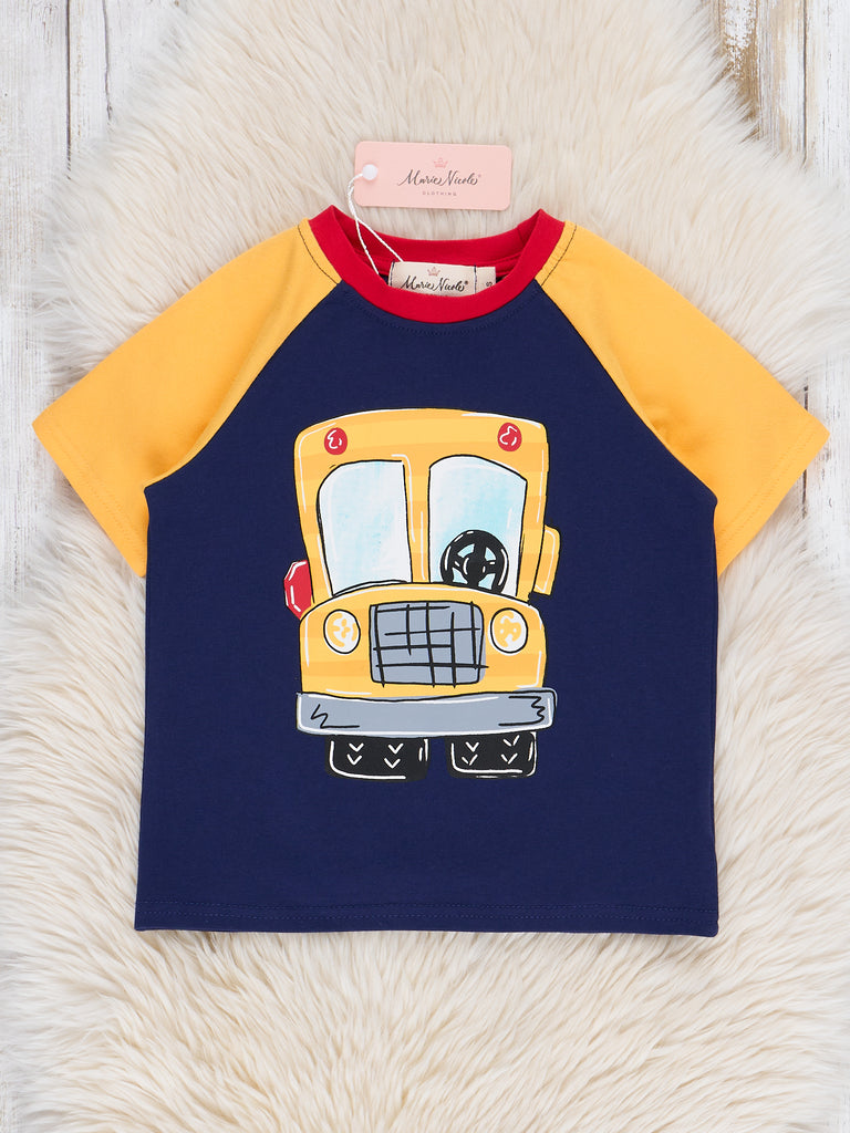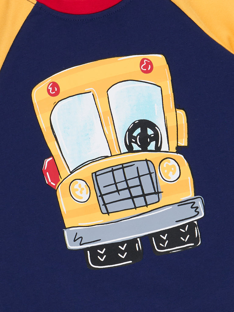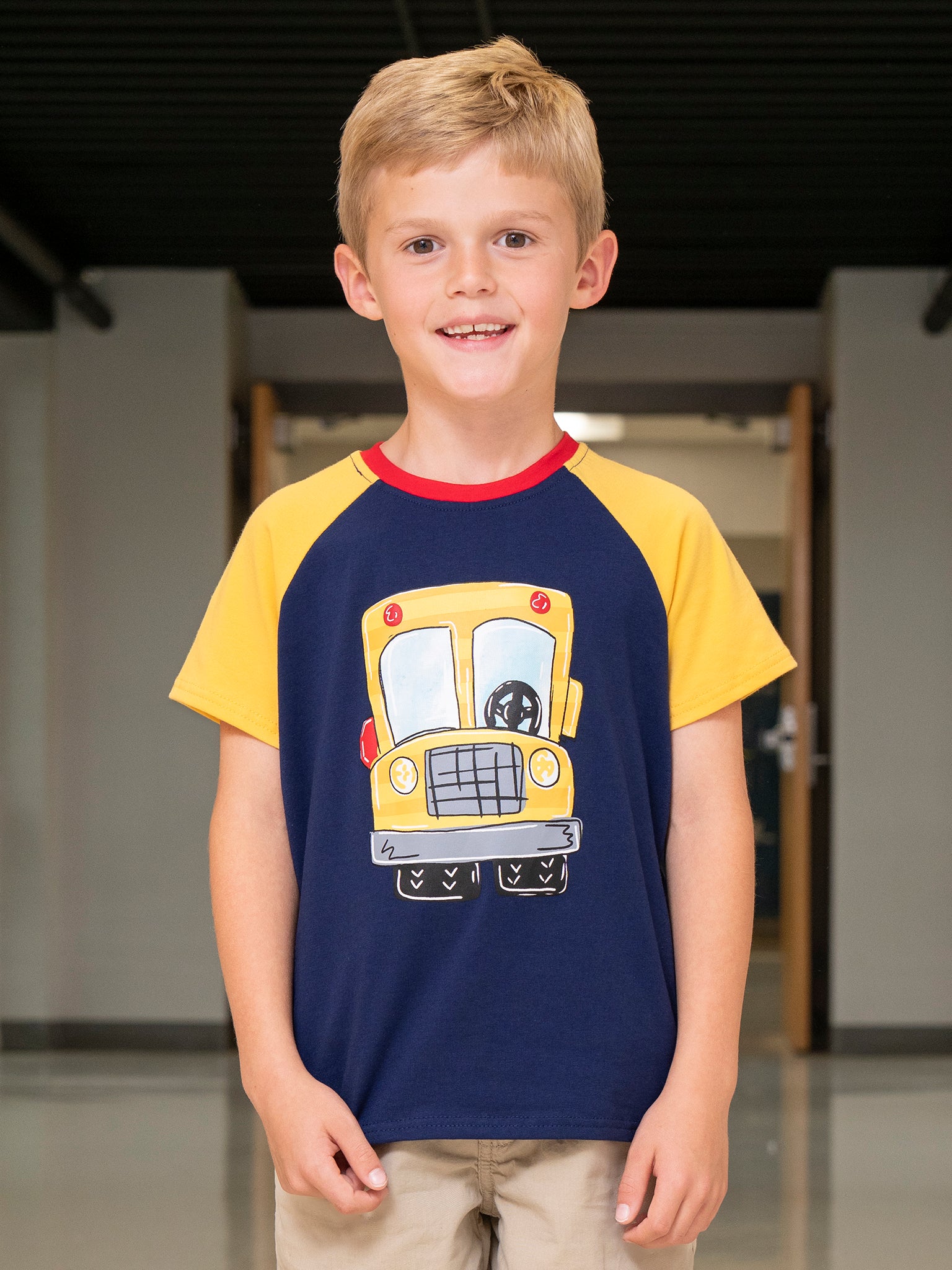 Get your little one ready for school with this playful Navy Wheels on the Bus Raglan Top! Featuring bright yellow raglan sleeves and a fun school bus design, this boys shirt is the perfect addition to their wardrobe. Complete the look with the matching sibling set. Let the back-to-school adventures begin!