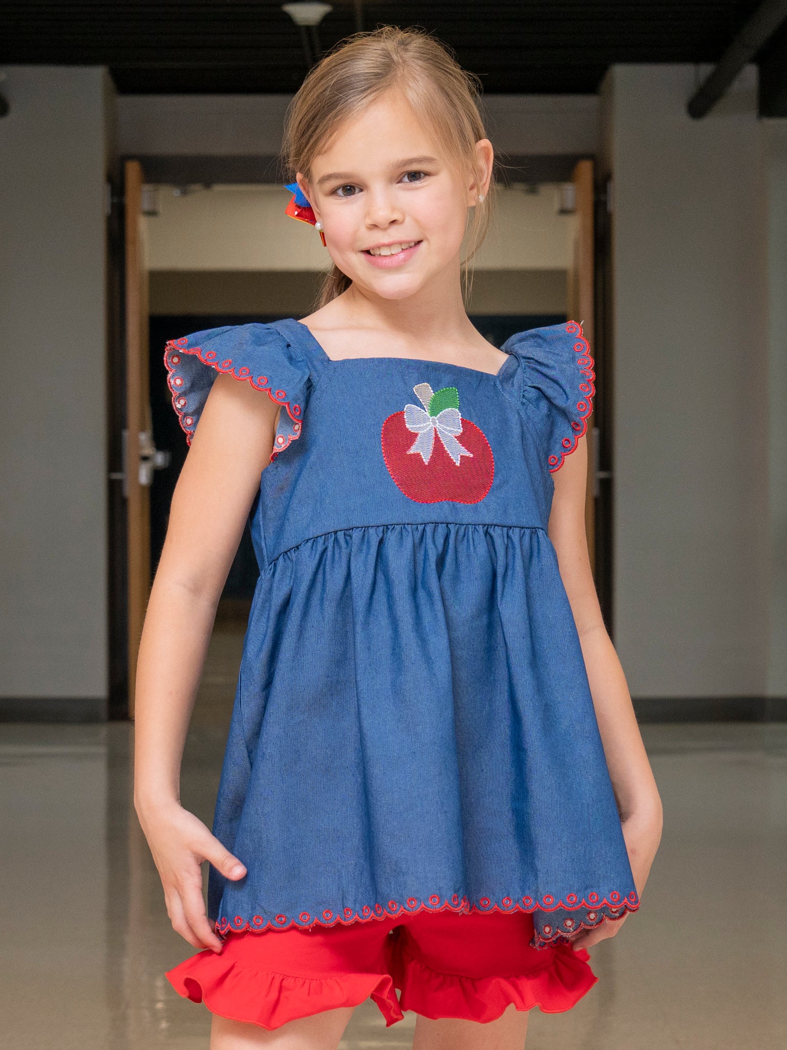 The Sweet Apple Chambray Ruffle Outfit is a charming and timeless choice perfect for back-to-school days and casual outings. Featuring a soft chambray fabric adorned with delicate apple embroidery and finished with gentle ruffle details, this outfit from Marie Nicole Clothing blends classic style with everyday comfort. Lightweight and breathable, it’s ideal for playdates, family gatherings, or any day she wants to look effortlessly sweet.