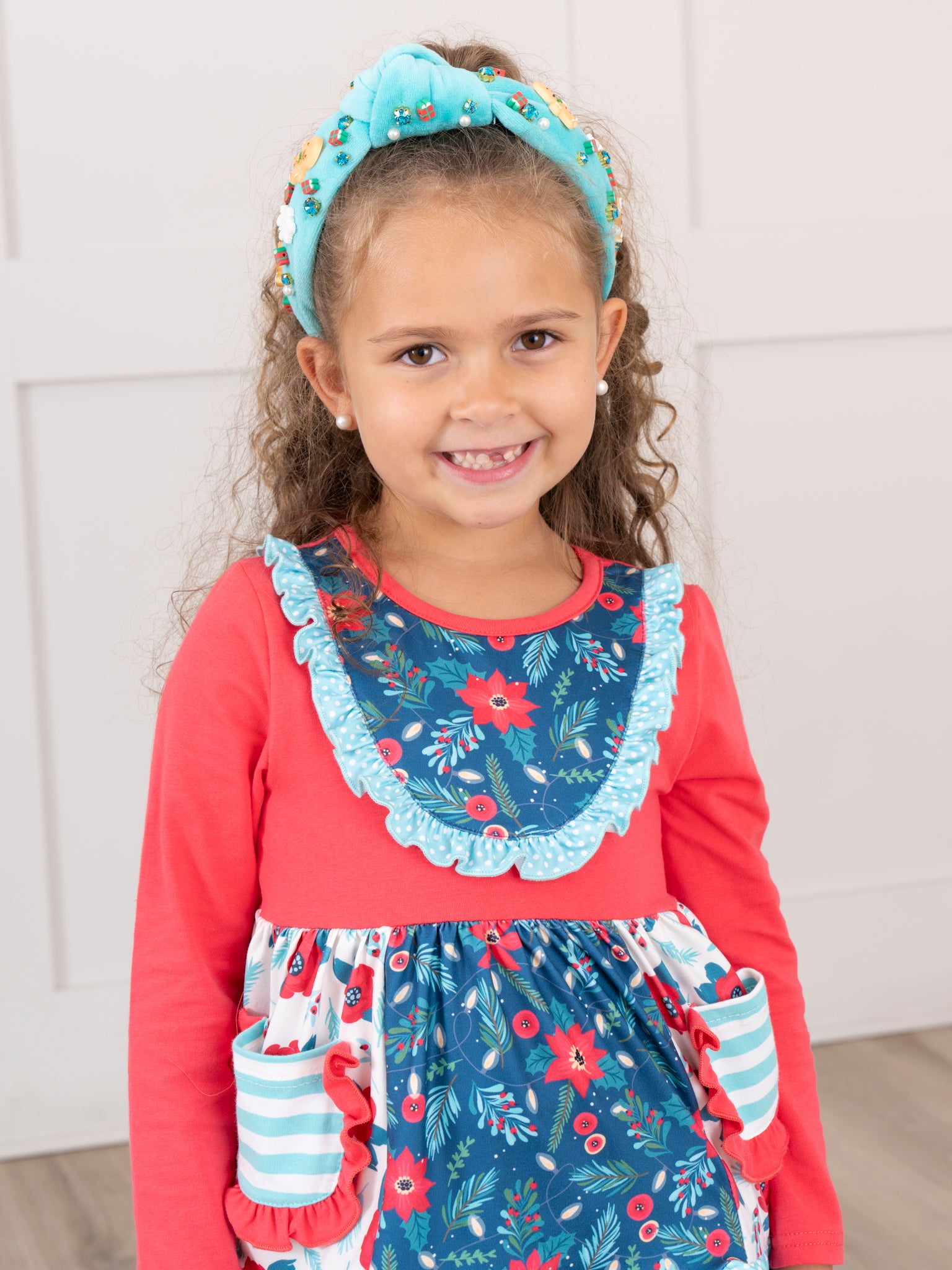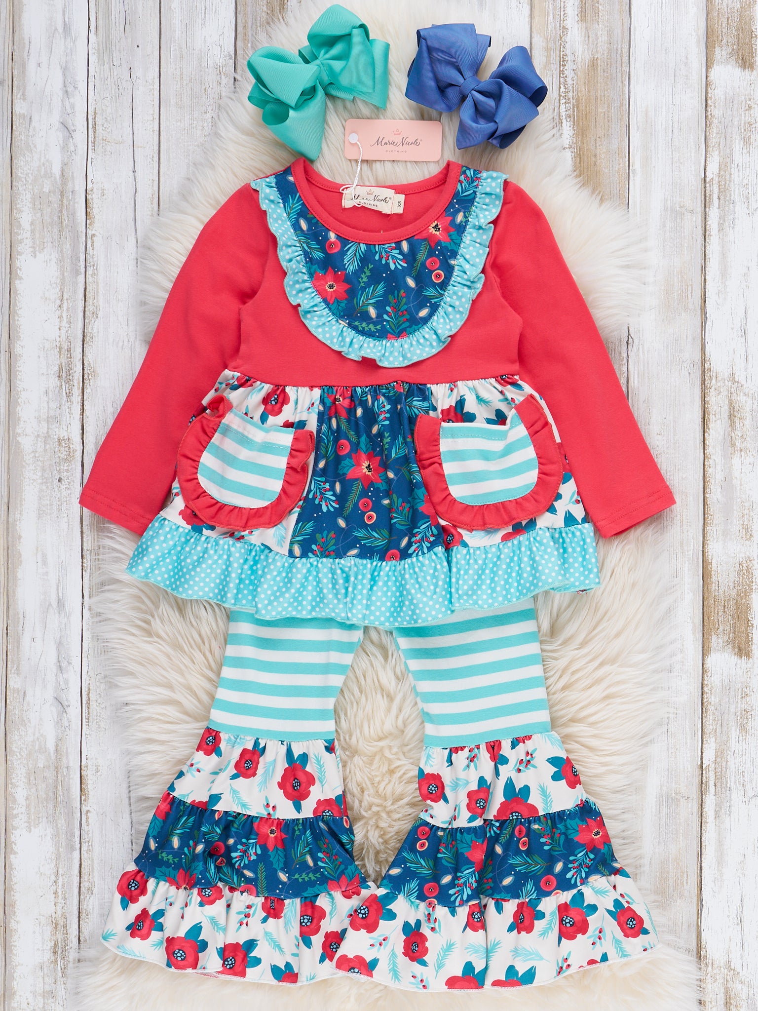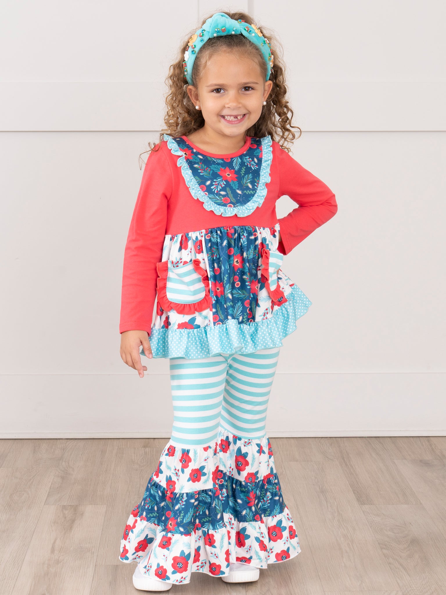 Get ready for your little to be the brightest bloom in the room in this sassy, floral outfit! This playful and bold ensemble features ruffle bell bottoms, a mix of floral and stripe prints, and adorable ruffle trim.