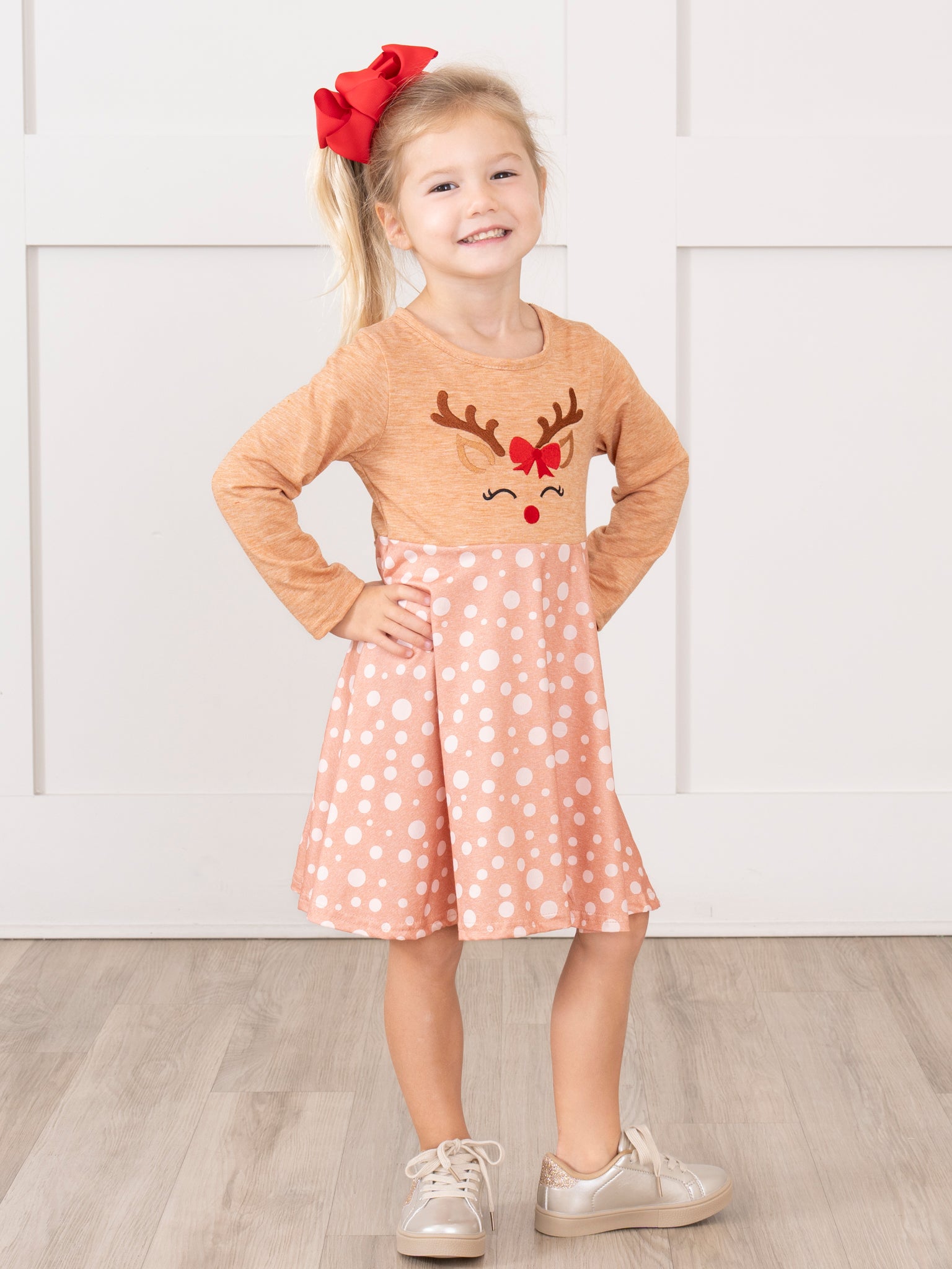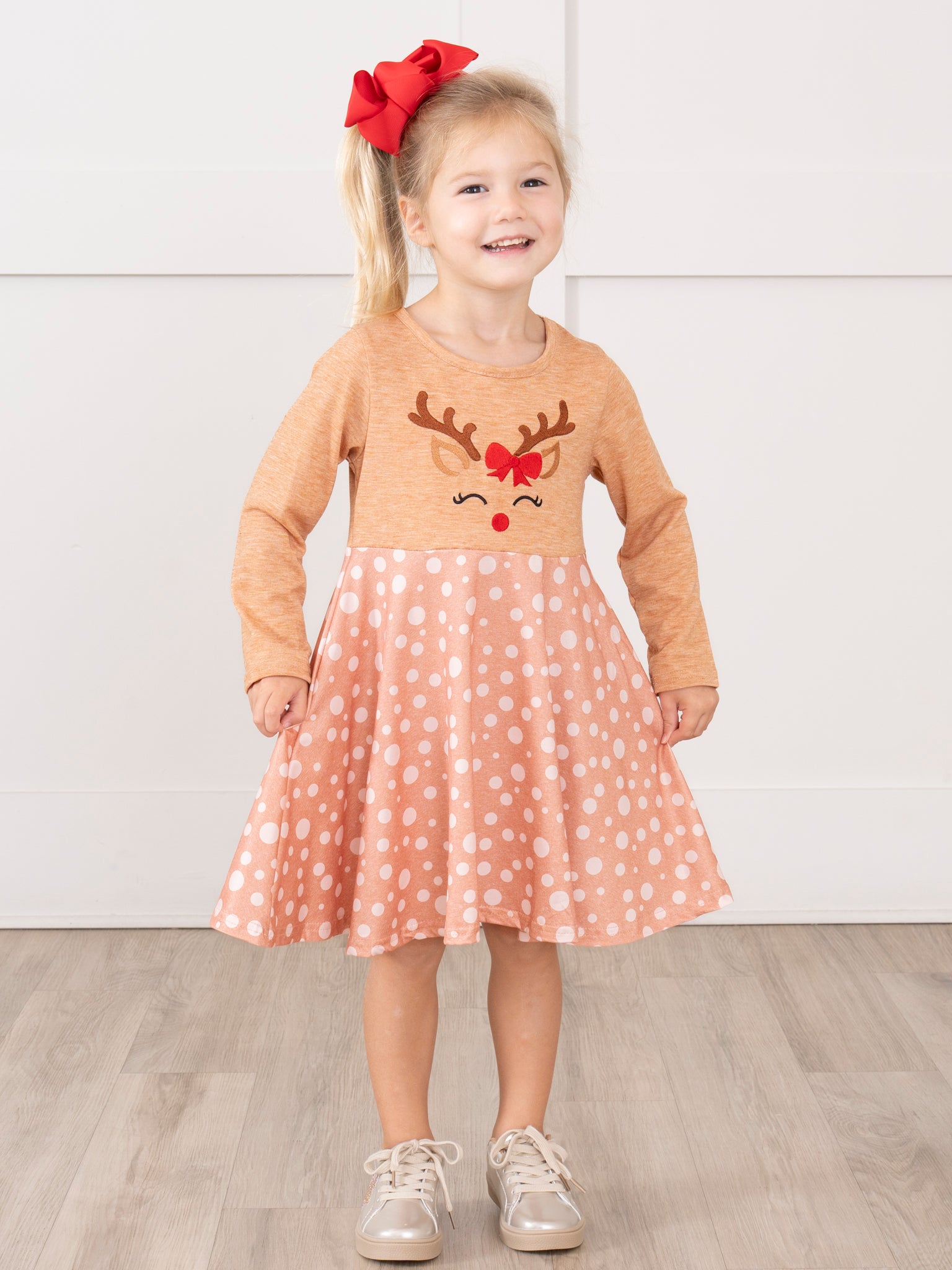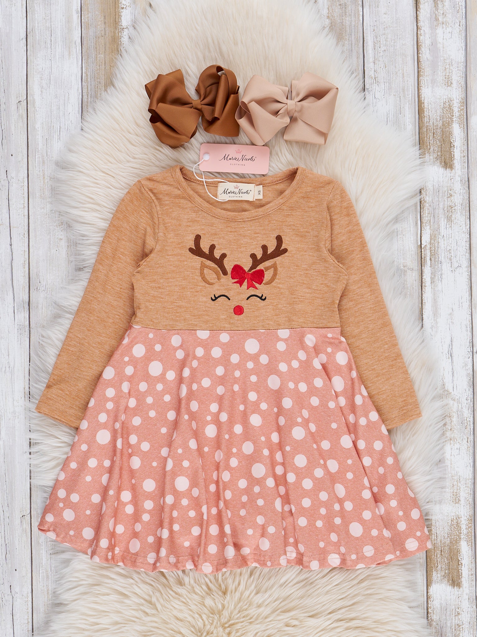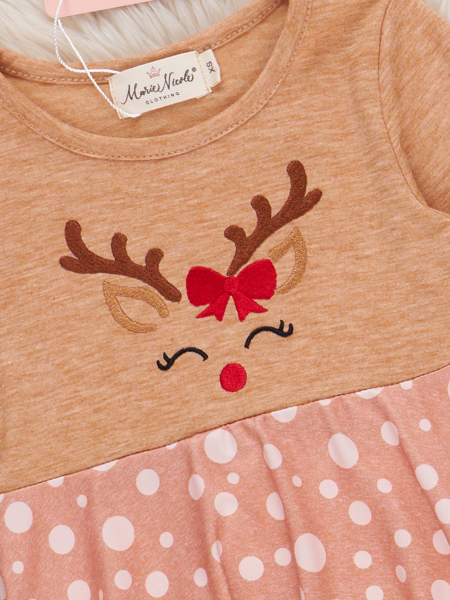 Looking for a playful Christmas outfit for your little one? Look no further than our Tan Reindeer Freckles Ruffle Dress! This adorable sister set features a reindeer face silhouette and pink freckled ruffle skirt and shoulders for a fun and festive look. Perfect for holiday photos and celebrations!