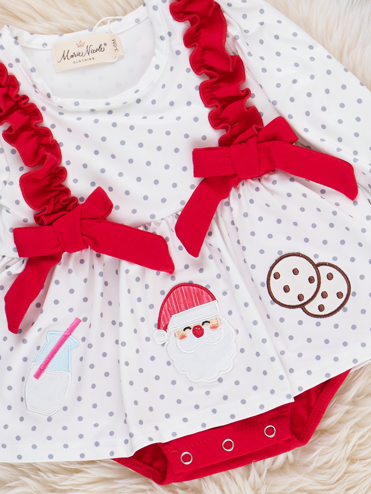 Get ready for some festive fun with our Embroidered Santa's Milk & Cookies Ruffle Bubble! This adorable girls' bubble features a playful polka dot bodice, accented with a ruffle and bow for extra flair. And don't miss the embroidered Santa with his delicious milk and cookies! Check out this is a must-have sibling set for your Christmas celebrations.