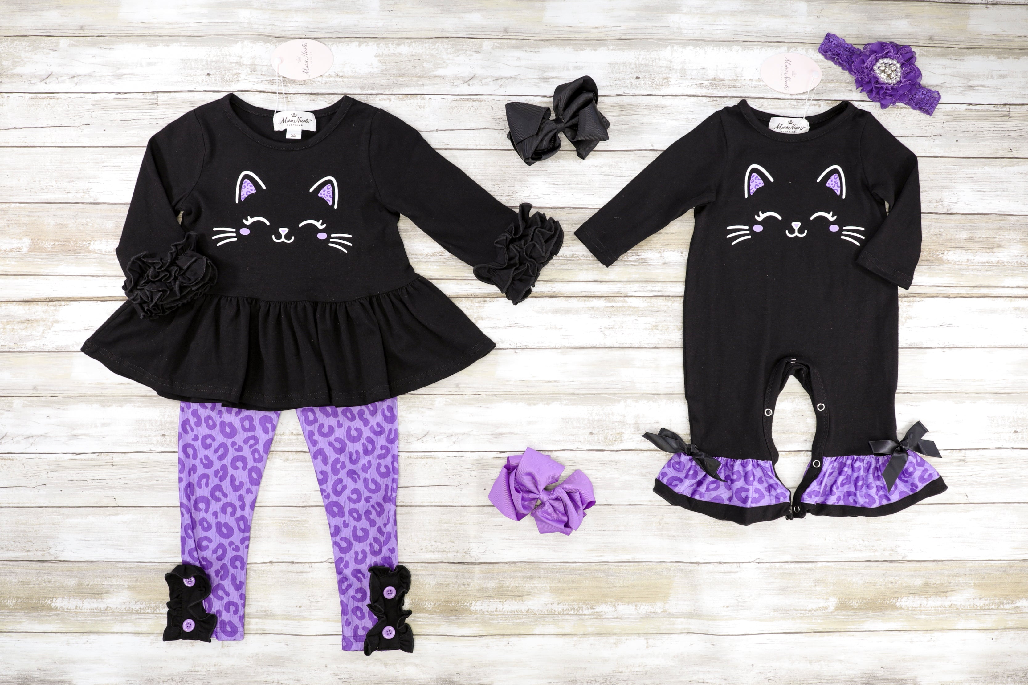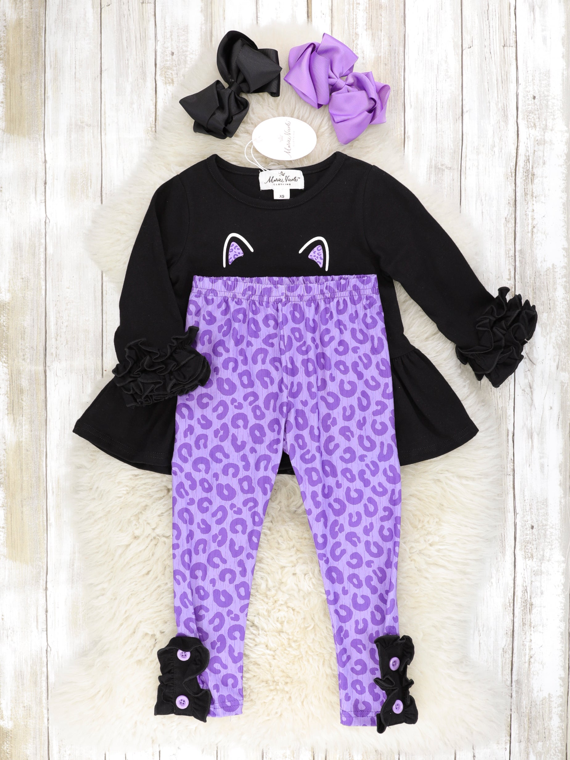 Black Cat Ruffle Peplum Top & Purple Leopard Print Bottoms Outfit
