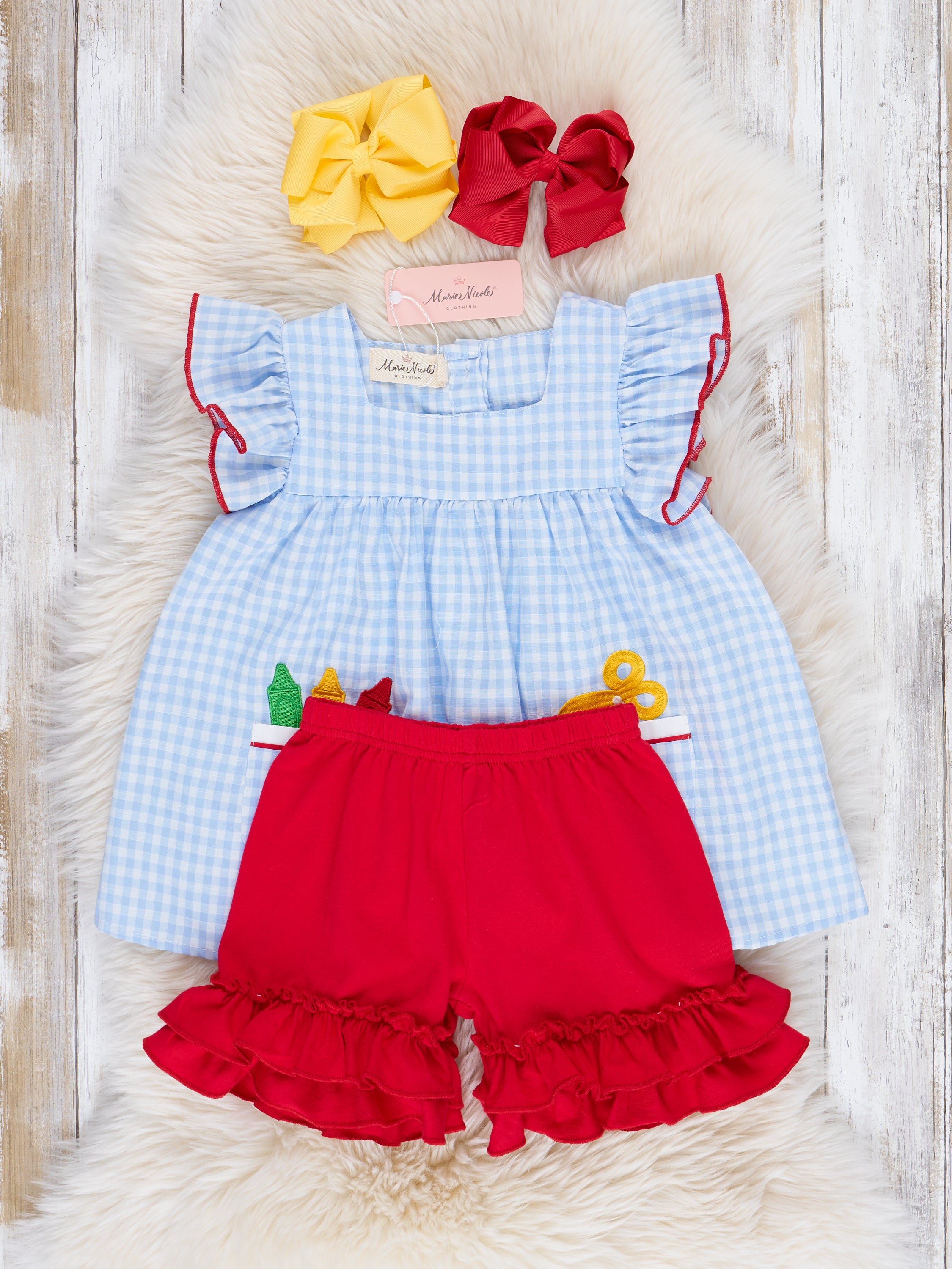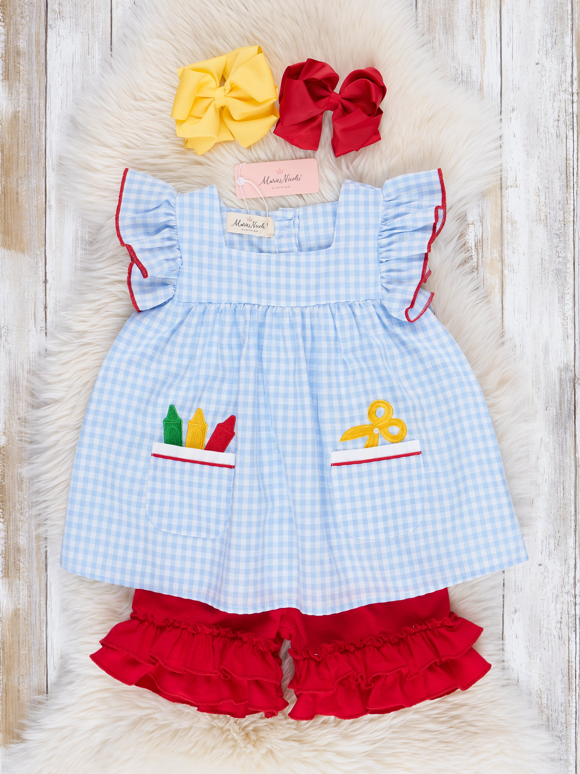 Blue Gingham Embroidered Crayons Ruffle Outfit