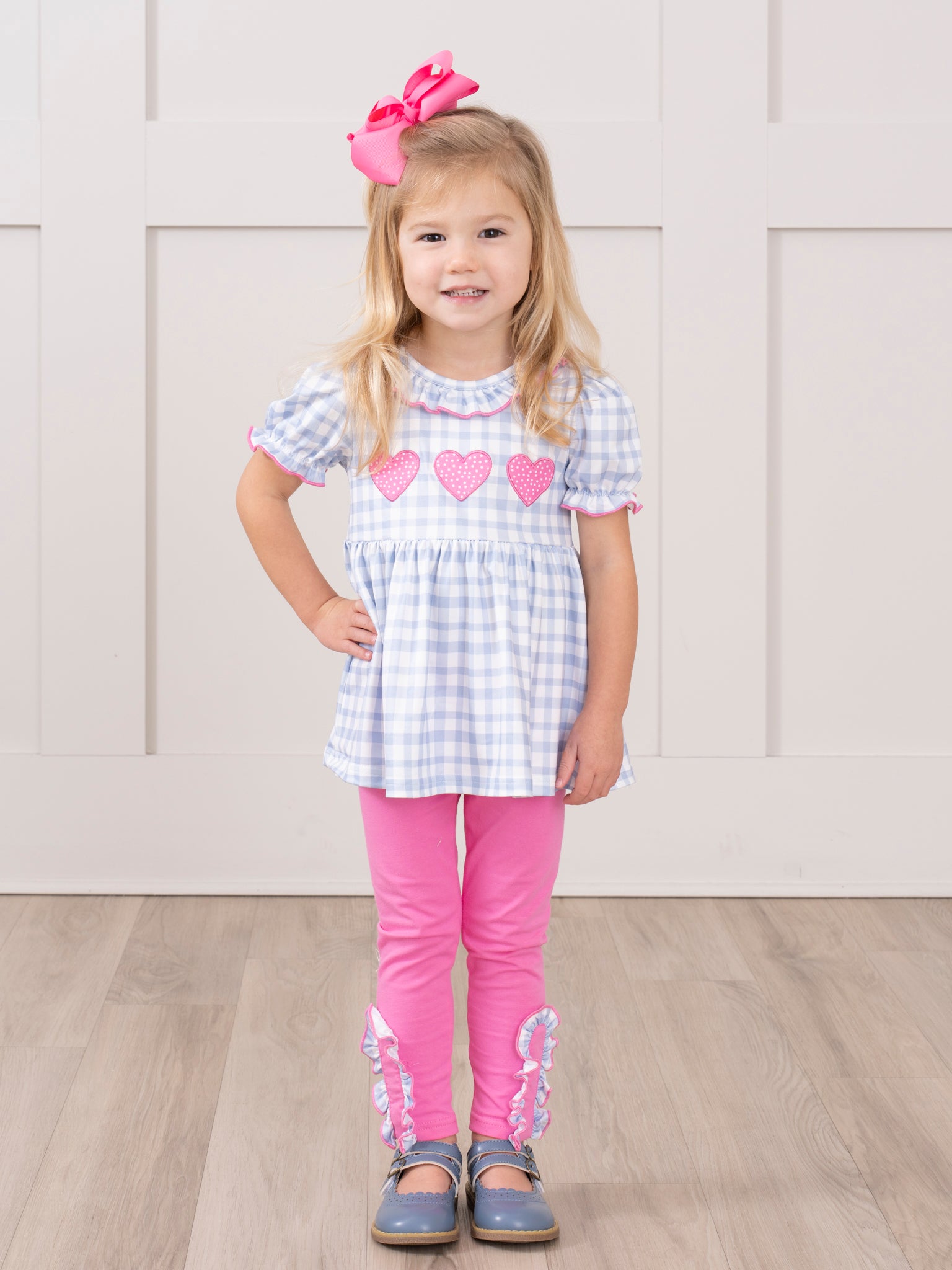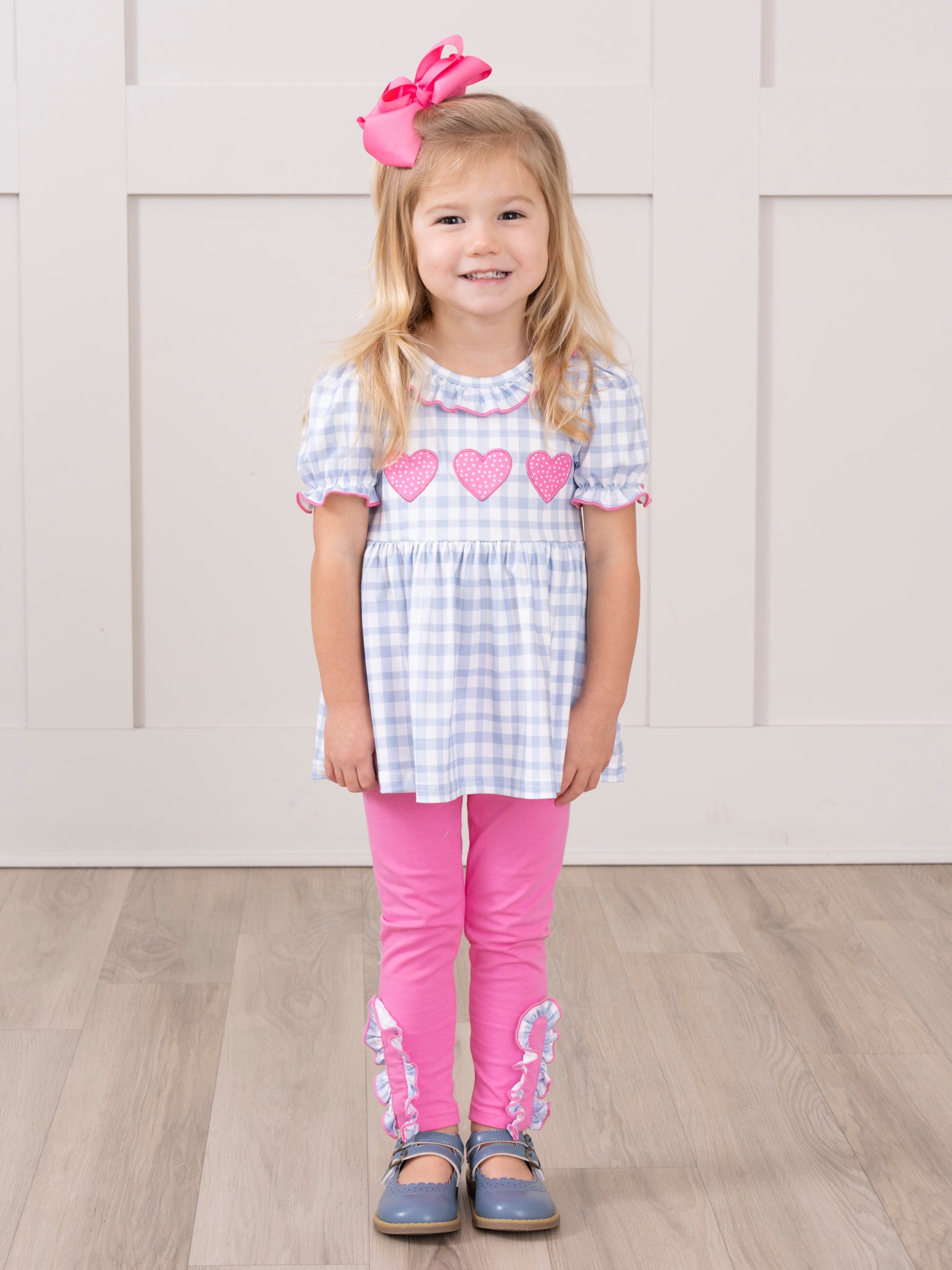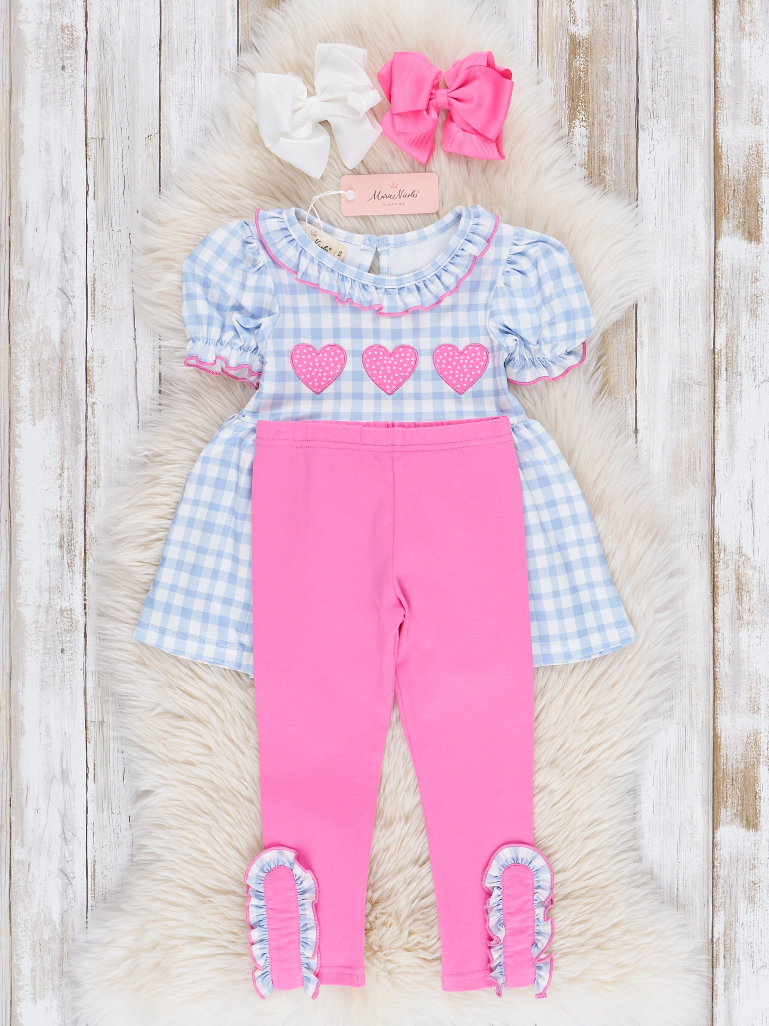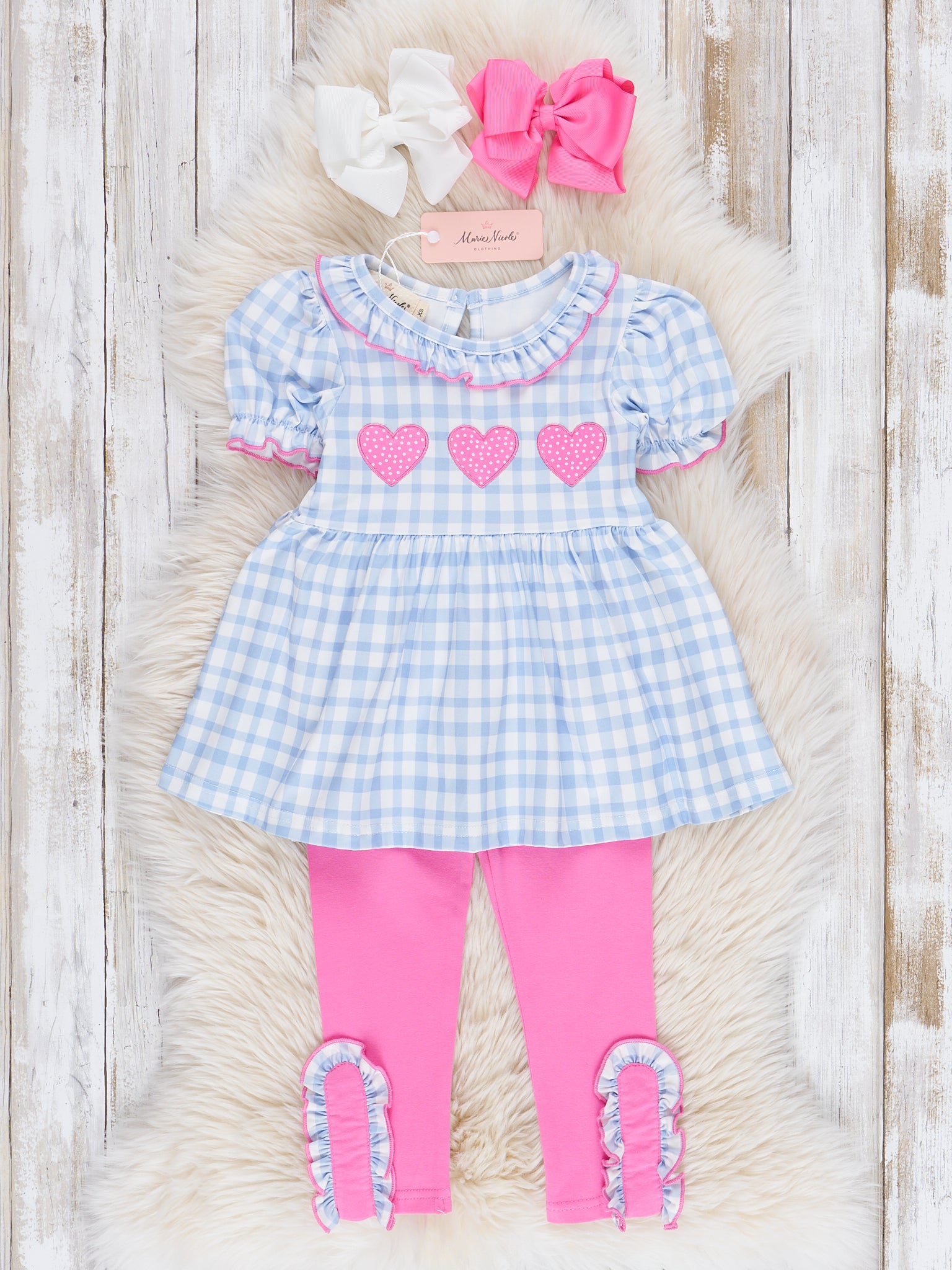 Blue Gingham Embroidered Hearts Ruffle Outfit