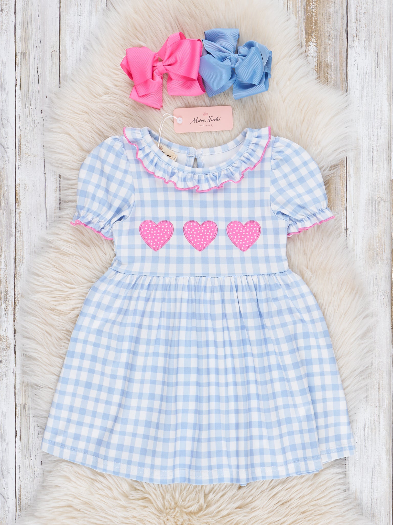 Blue Gingham Embroidered Hearts Ruffle Dress