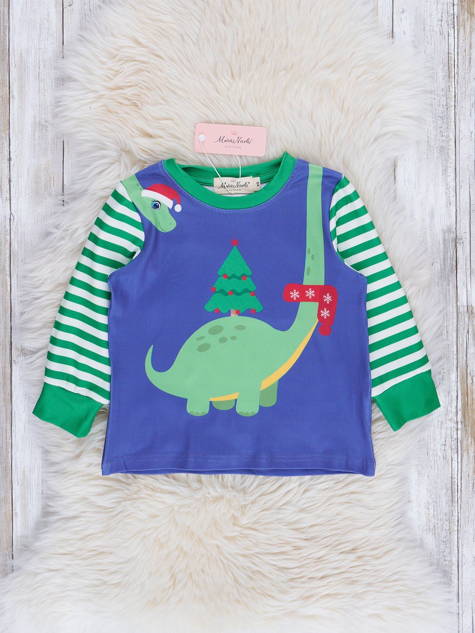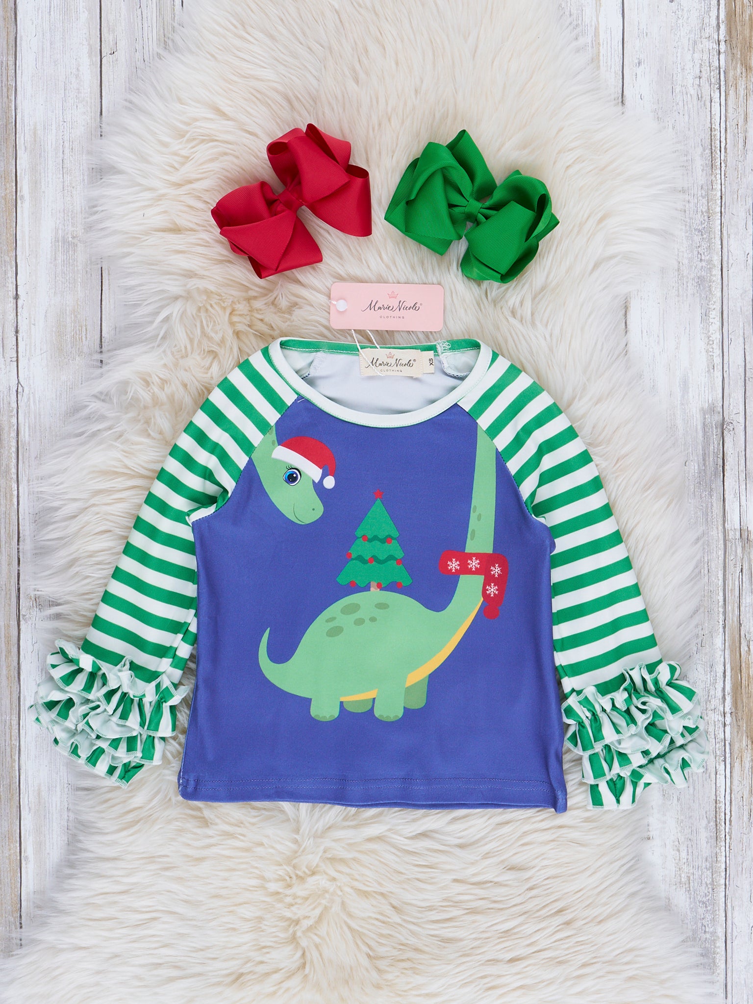 Blue & Green Holiday Dino Striped Ruffle Romper