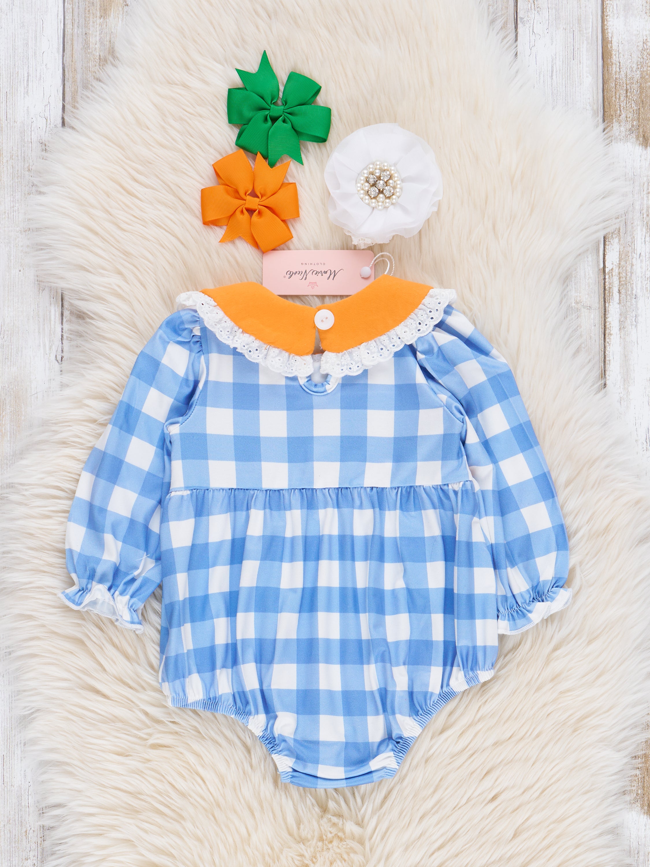 Blue Plaid & Pumpkin Smocked Bubble Romper