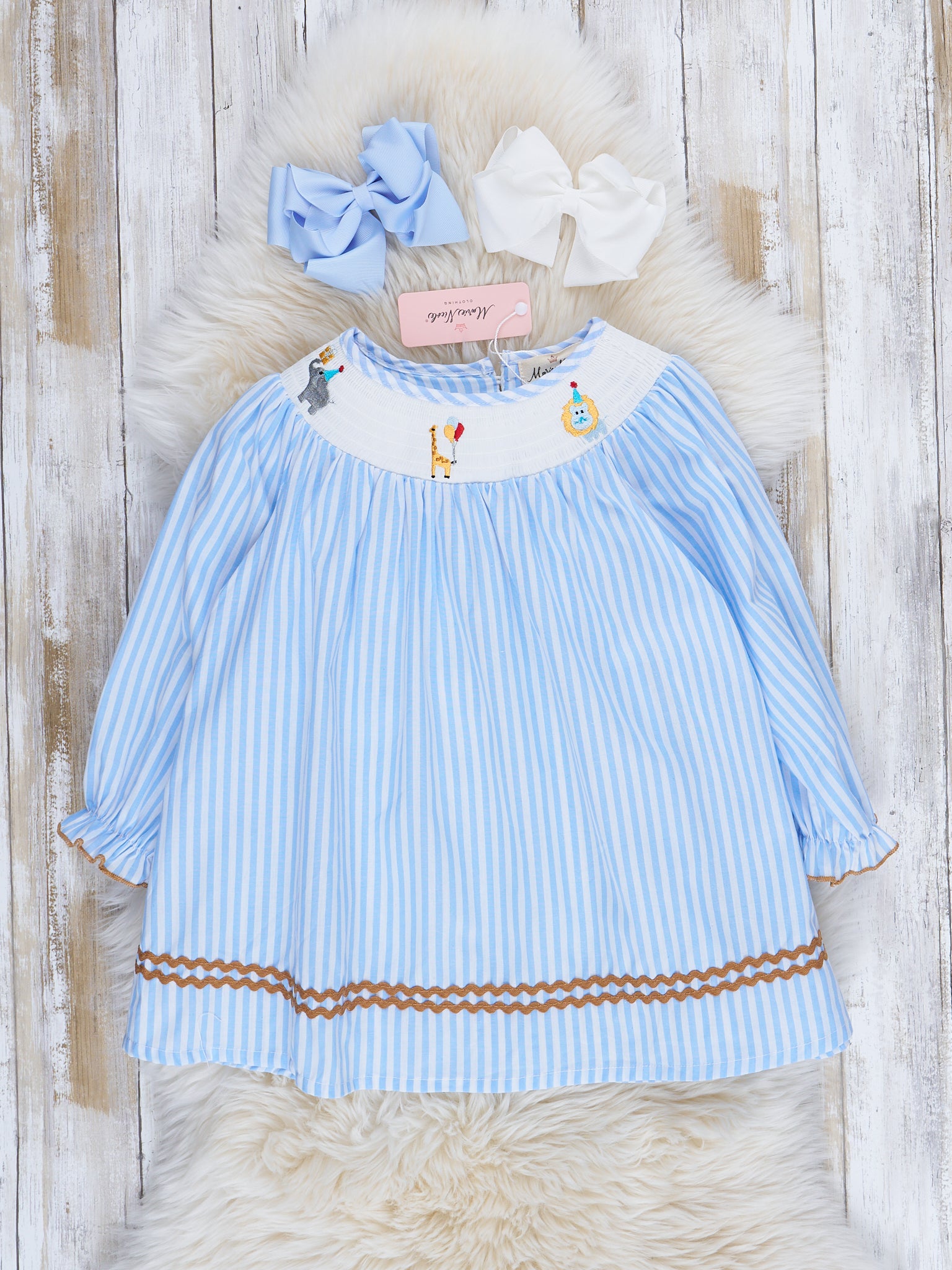Home › Blue Stripe Smocked Circus Friends Sister Set