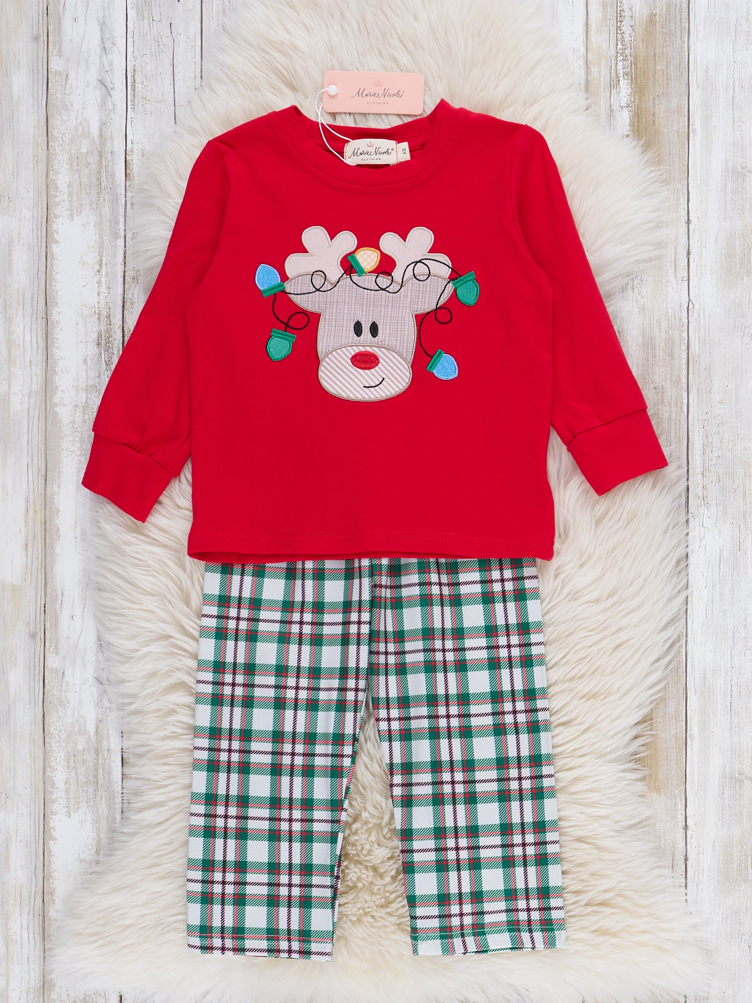 Keep the holidays bright with the Reindeer Lights Embroidered Outfit! Colorful Christmas lights adorn Rudolph on this red top, paired with a plaid pants. This two-piece set from Marie Nicole Clothing is so cheerful and festive. Made with soft, comfy fabric, your little boy will love wearing this during the winter holidays!